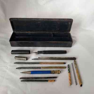A pencil box with a color illustration of children sitting on a log. Inside are a Servo fountain pen, a mechanical pencil with a container holding extra lead, and several slate pencils. Slate pencils were common in the later 19th century. The ones wrapped in an American flag pattern were manufactured to encourage patriotism, especially in the immigrants who were flooding into the country at the time.Collection