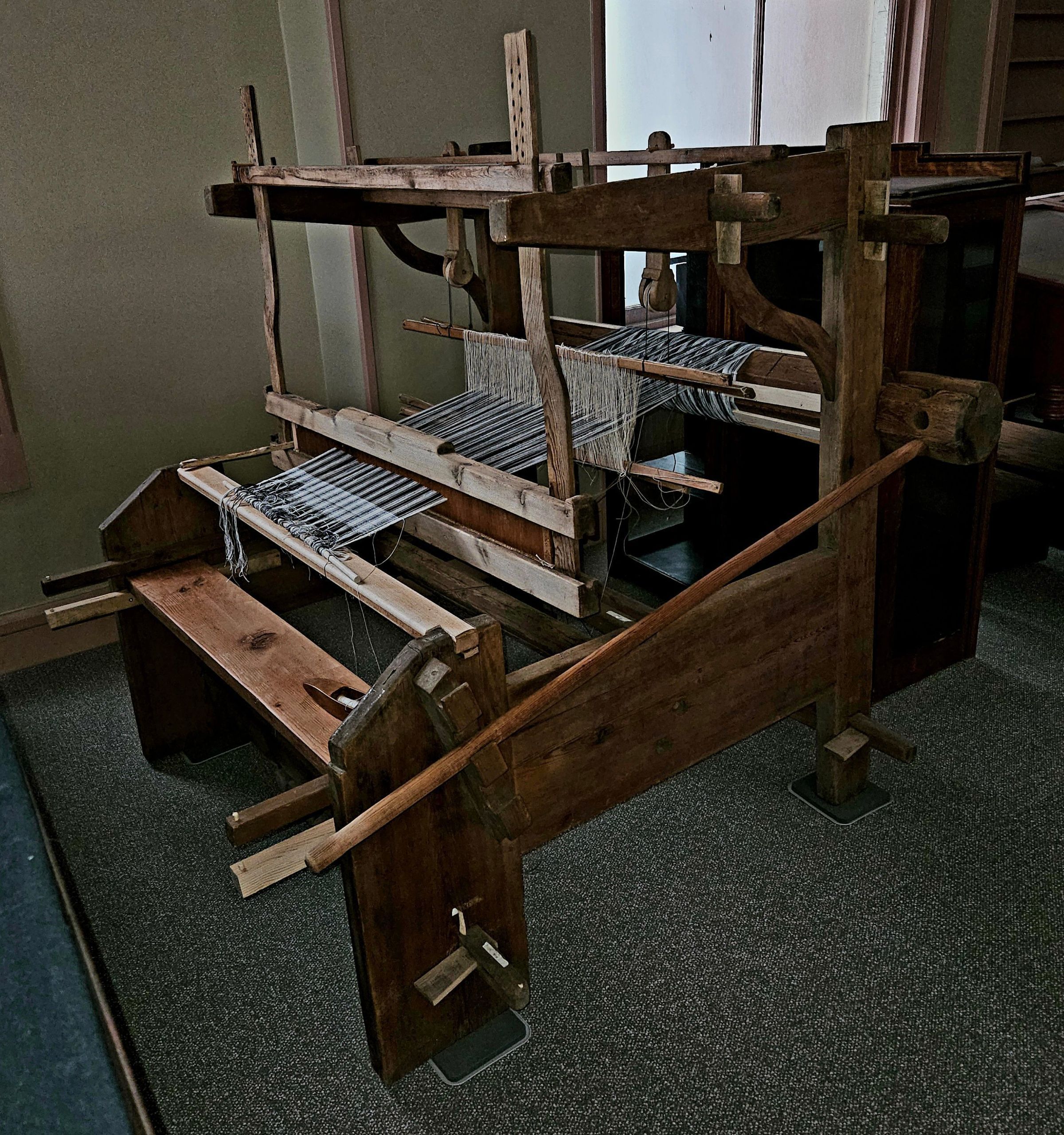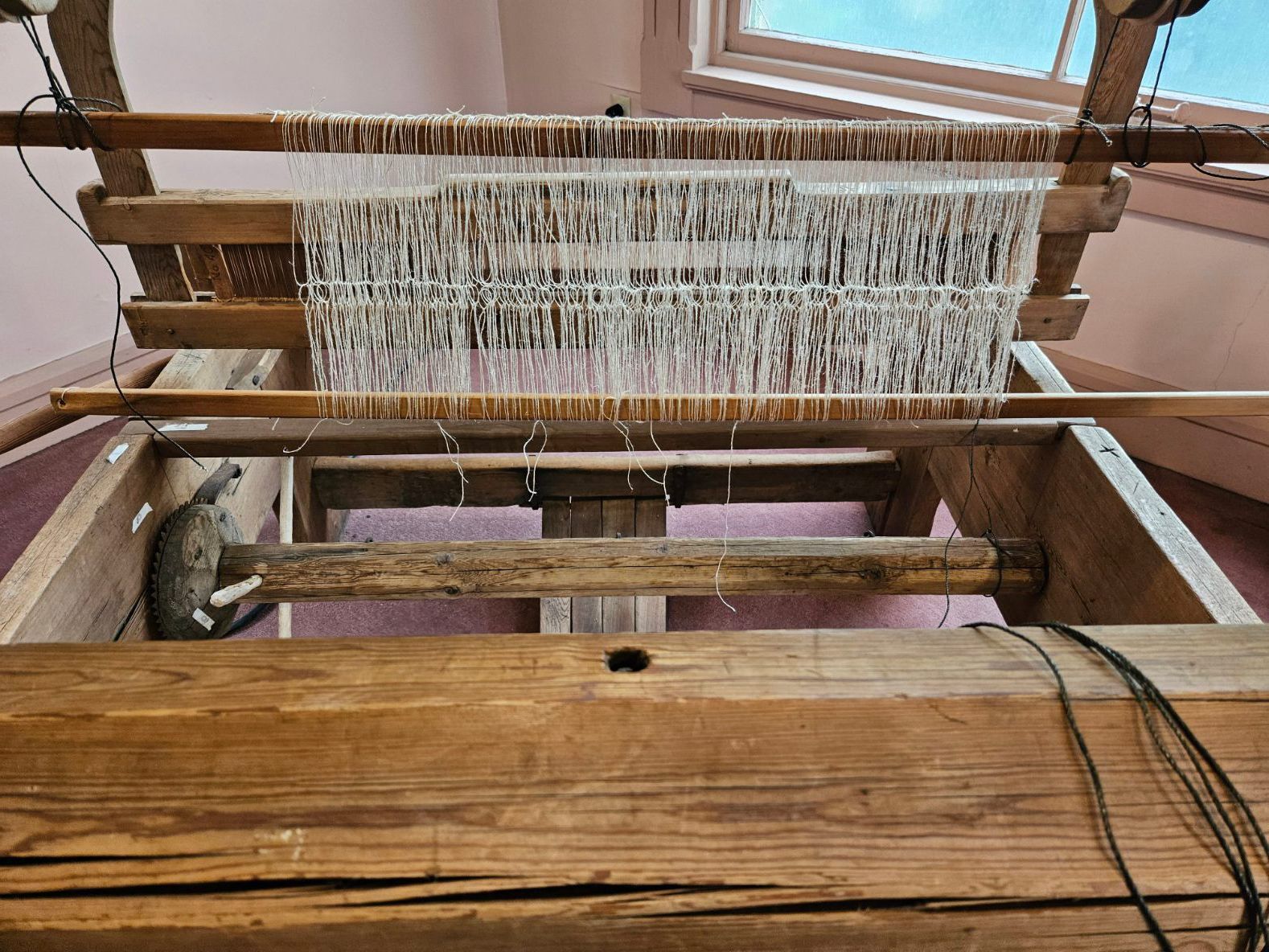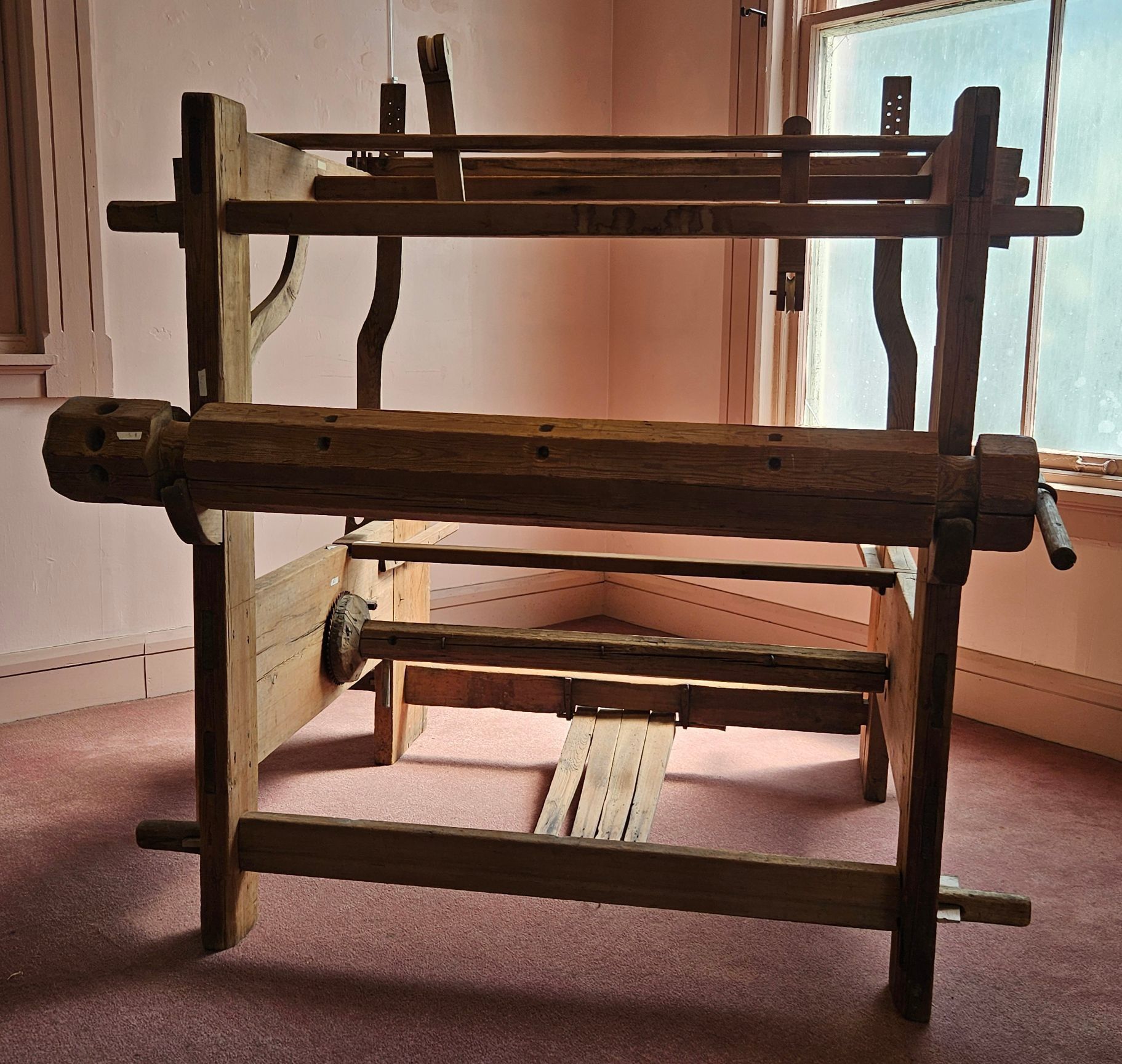Except for an iron gear, the loom is made entirely of wood, held together by wooden pegs, joints, and wedges. The wood reed and and string heddles were added by Museum staff, along with several wooden parts. New parts are made of unfinished new wood, so that they are easy to identify.Location