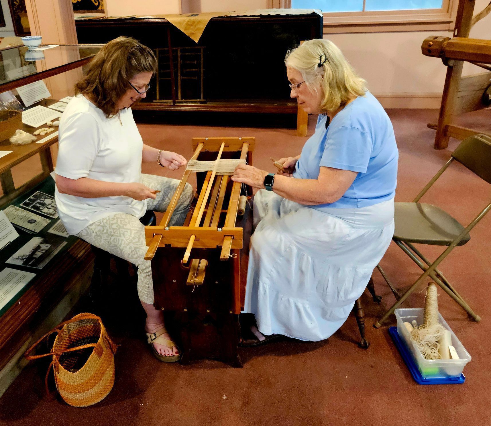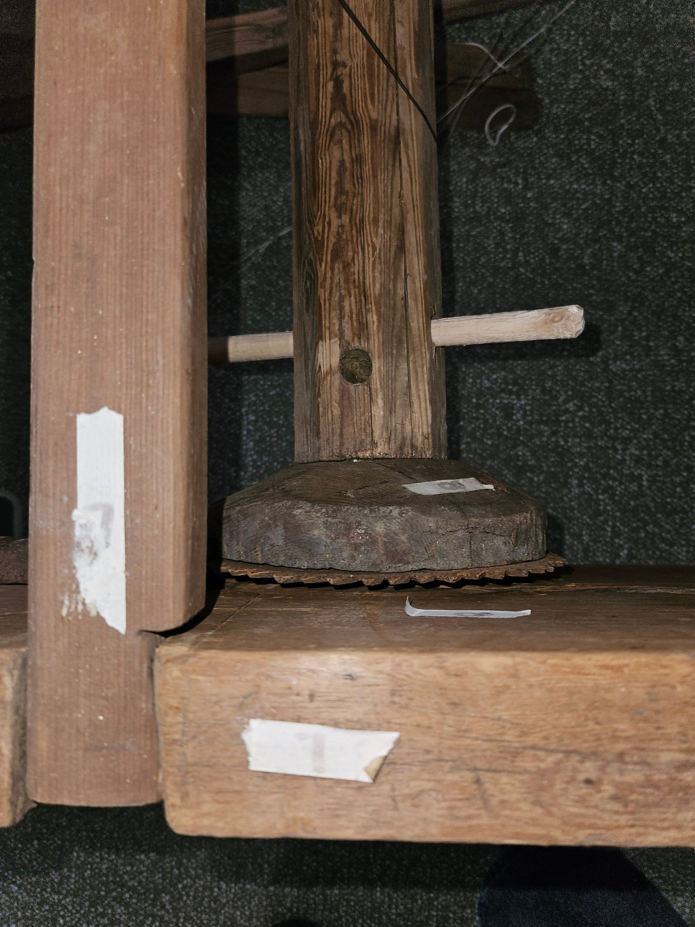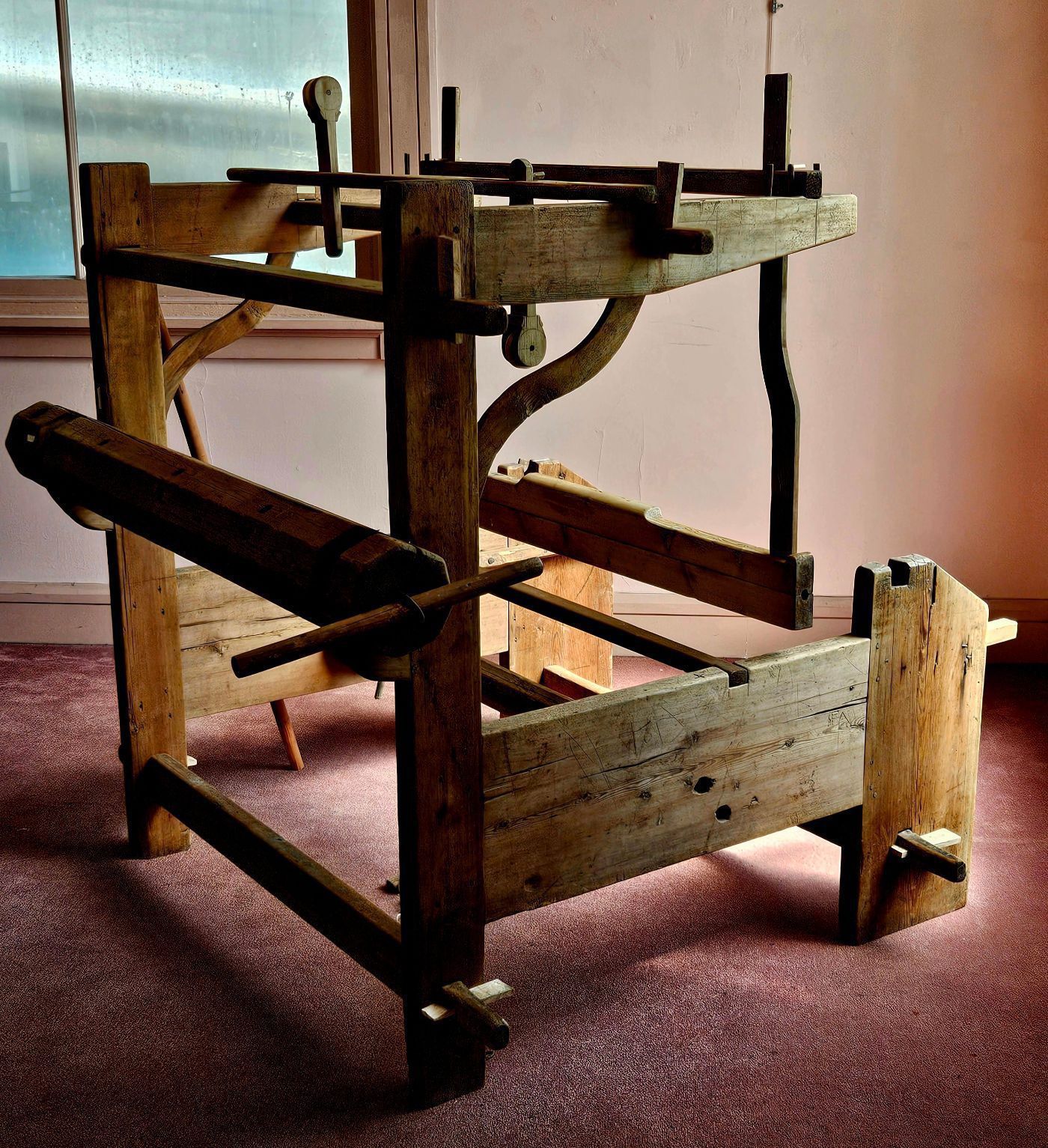 Except for an iron gear, the loom is made entirely of wood, held together by wooden pegs, joints, and wedges. The wood reed and and string heddles were added by Museum staff, along with several wooden parts. New parts are made of unfinished new wood, so that they are easy to identify.Location