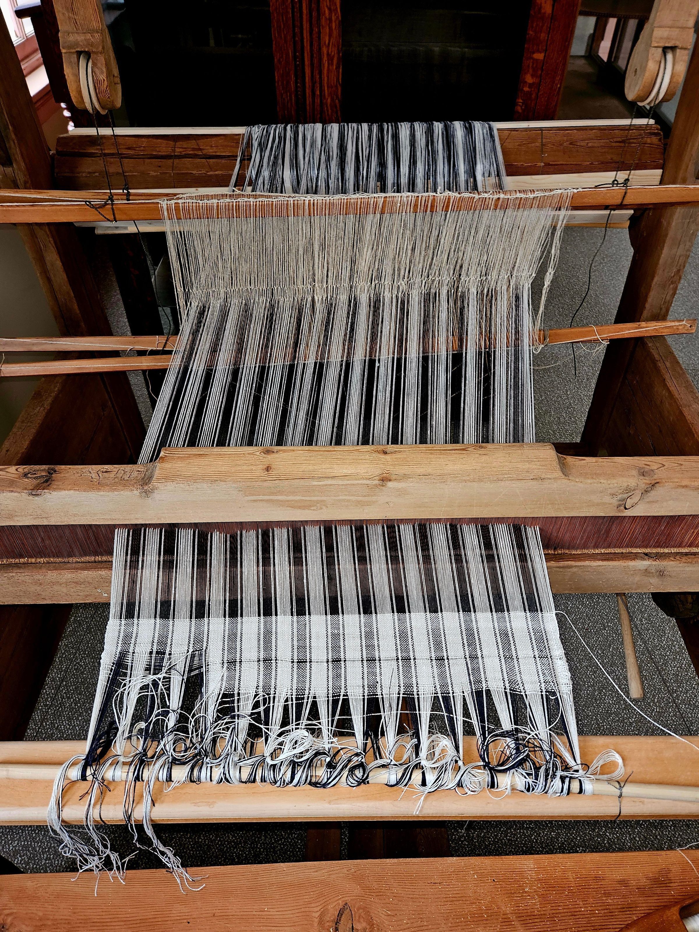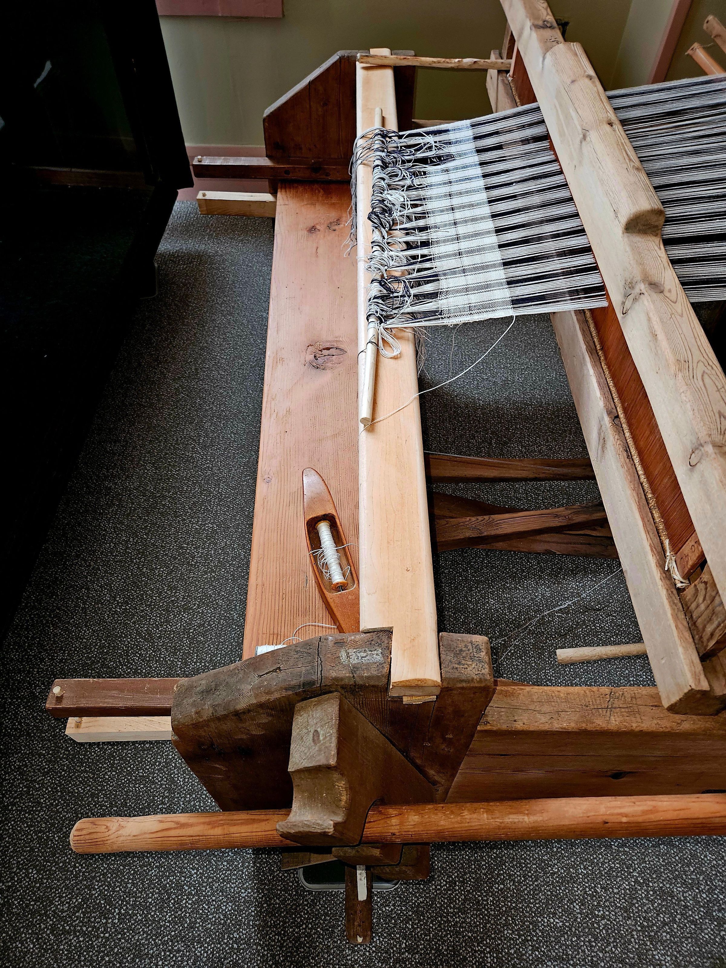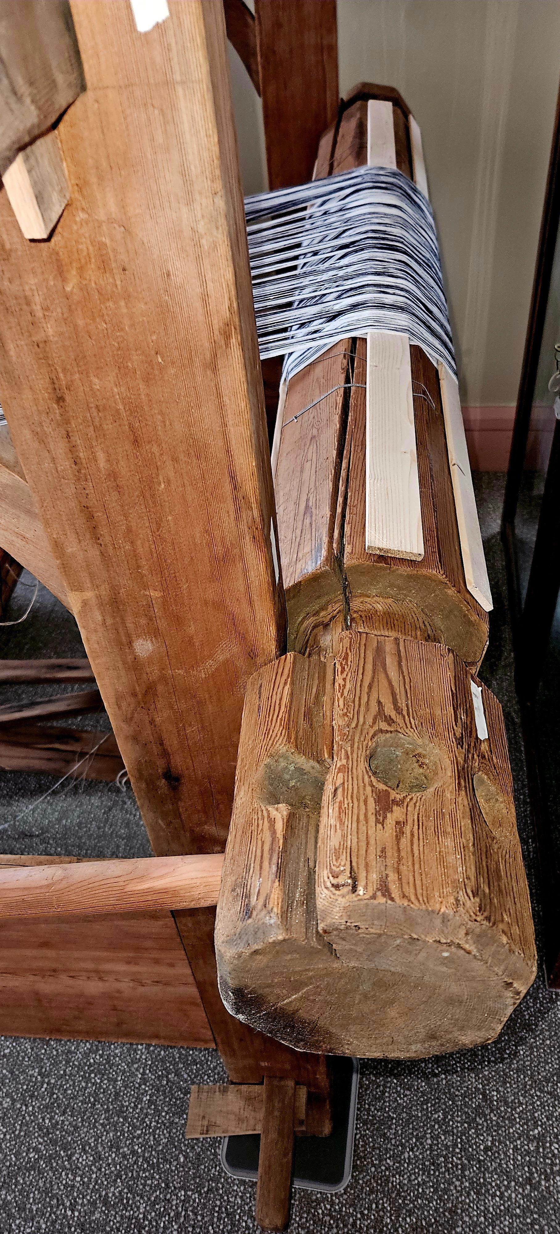 18th-century Swedish wooden barn loom. Marked with the initials AS and the date 1717. Held together with wooden pegs, joints, and wedges. One iron or steel gear. Working condition. The loom as found was nearly complete. Museum staff replaced a splintered front beam and some wedges; constructed some new wedges, a new lever bar, and new seat, string heddles, and a few other parts. The loom was minus a reed, so Museum staff inserted an antique wooden reed manufactured in the 19th century.Use