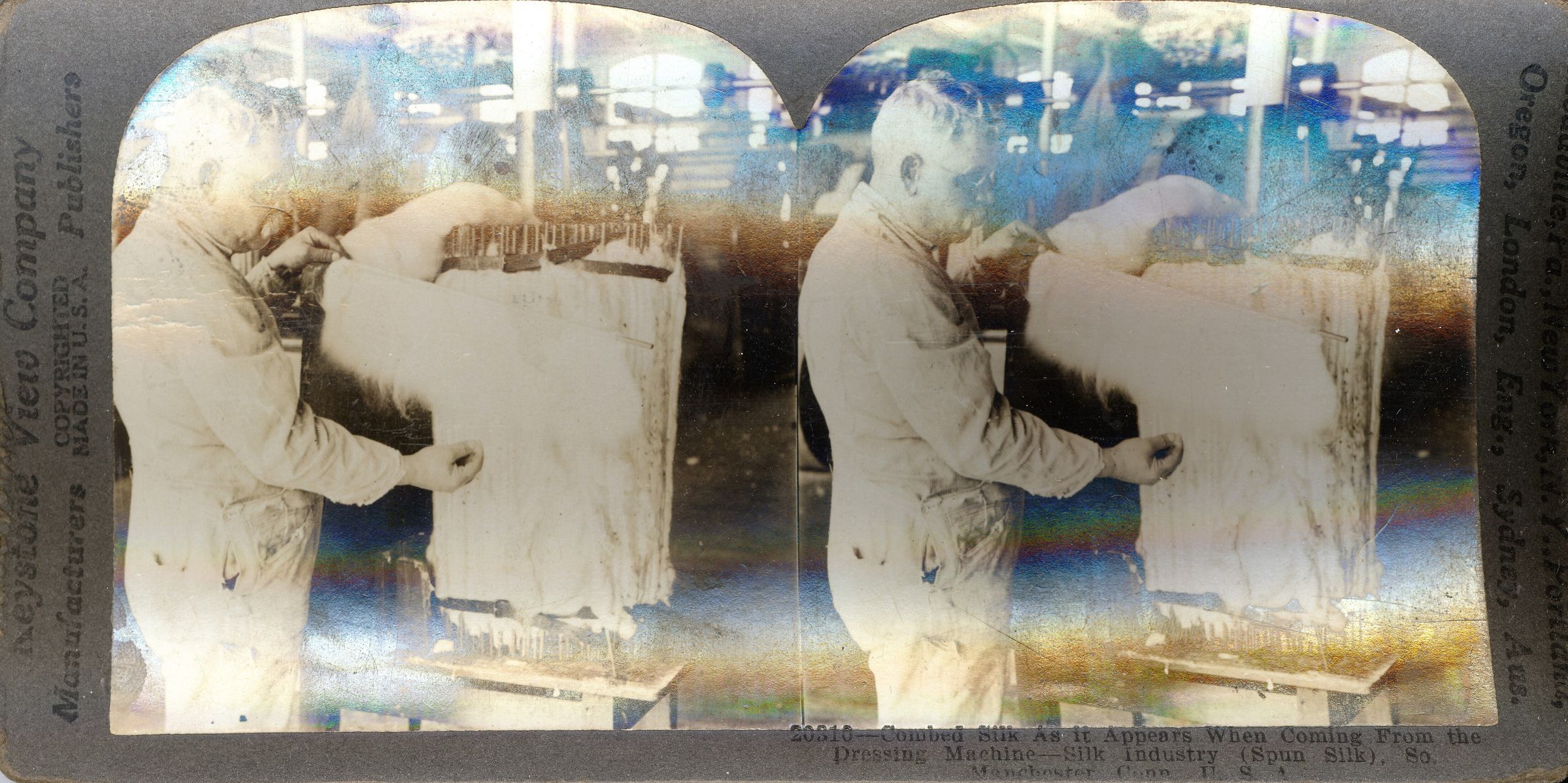 Stereograph of silk mill worker holding combed silk as it appeared when coming from the dressing machine, at Cheney Brothers silk mills in South Manchester, CT, 1914. Black and white print on cardboard. Card is warped. Unknown photographer. Studio: Keystone View Company, Meadville, PA. Serial #20310.Photograph Details