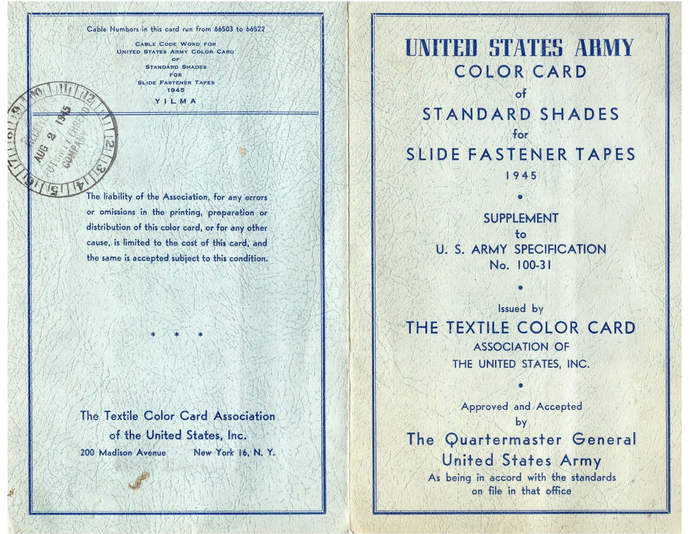 Color card sampler for textile mills to recreate the varying color of woven tapes used by the Army in WWII.Created By