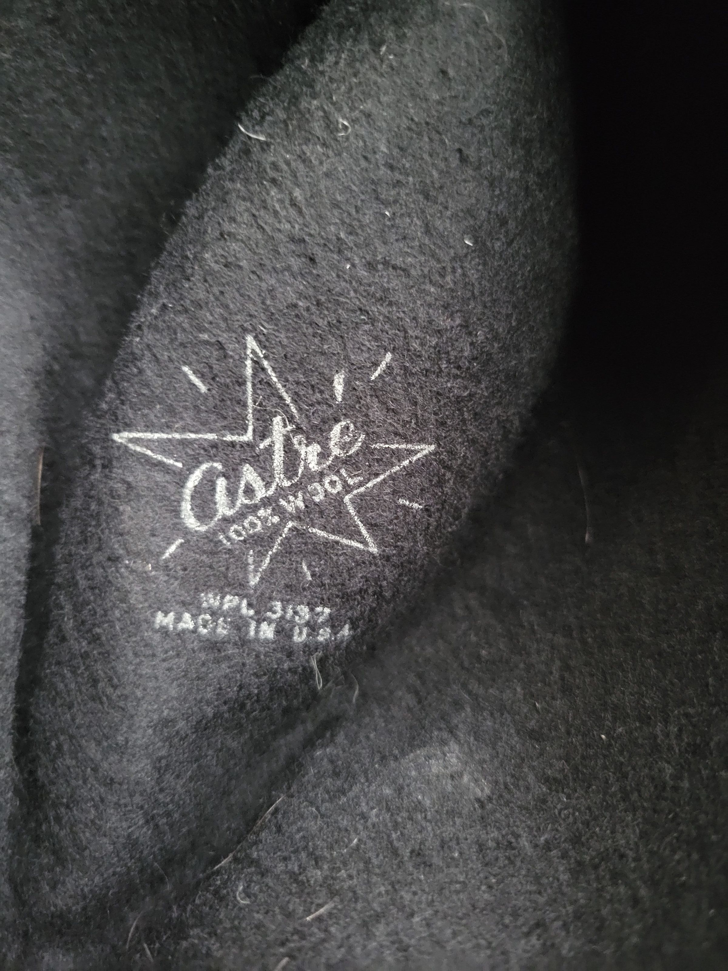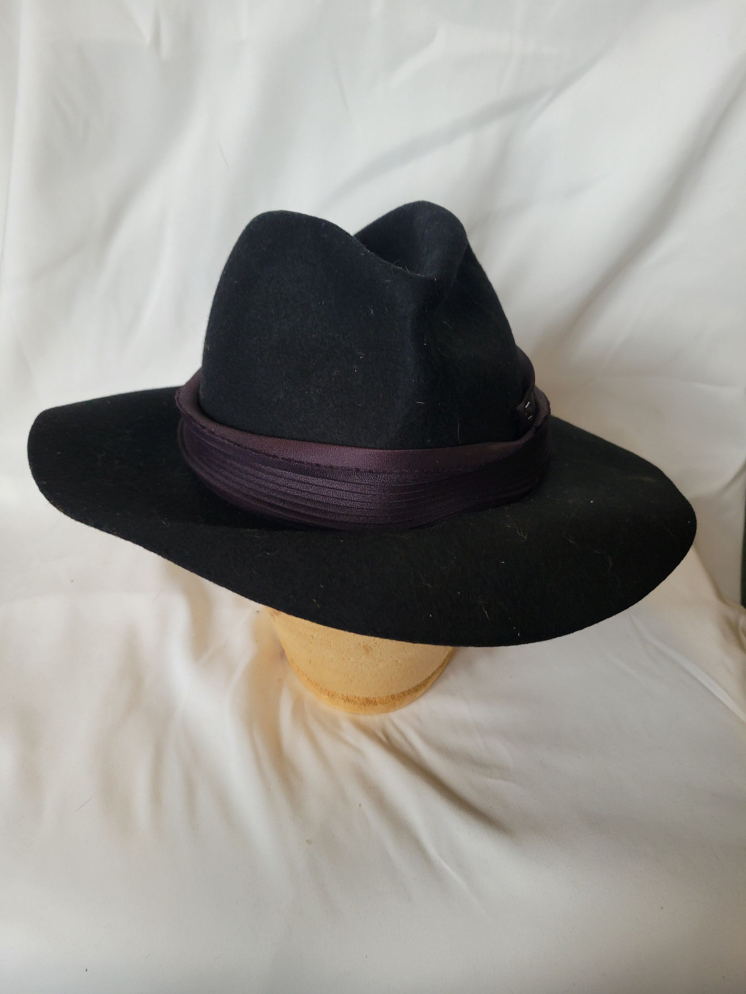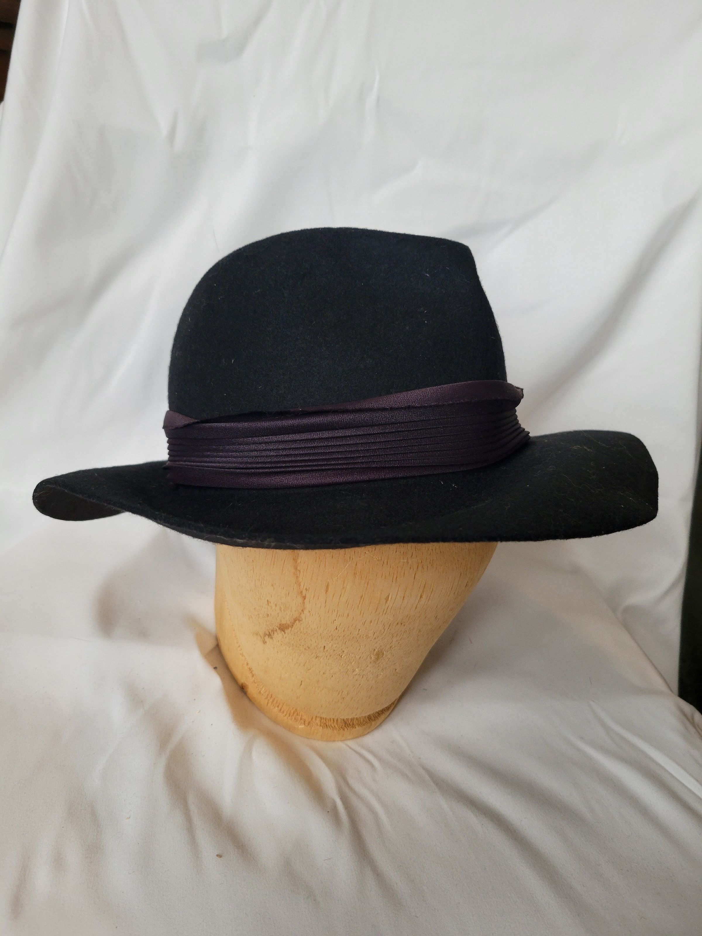 A black felt women's fedora with a faded black ribbon band. Women's hats modeled after men's hat styles were popular in the late 1940s. The stamp on the inside of the crown indicates it is 100% wool, in accordance to the Wool Product Labeling Act. The brim is bent out of shape.Collection