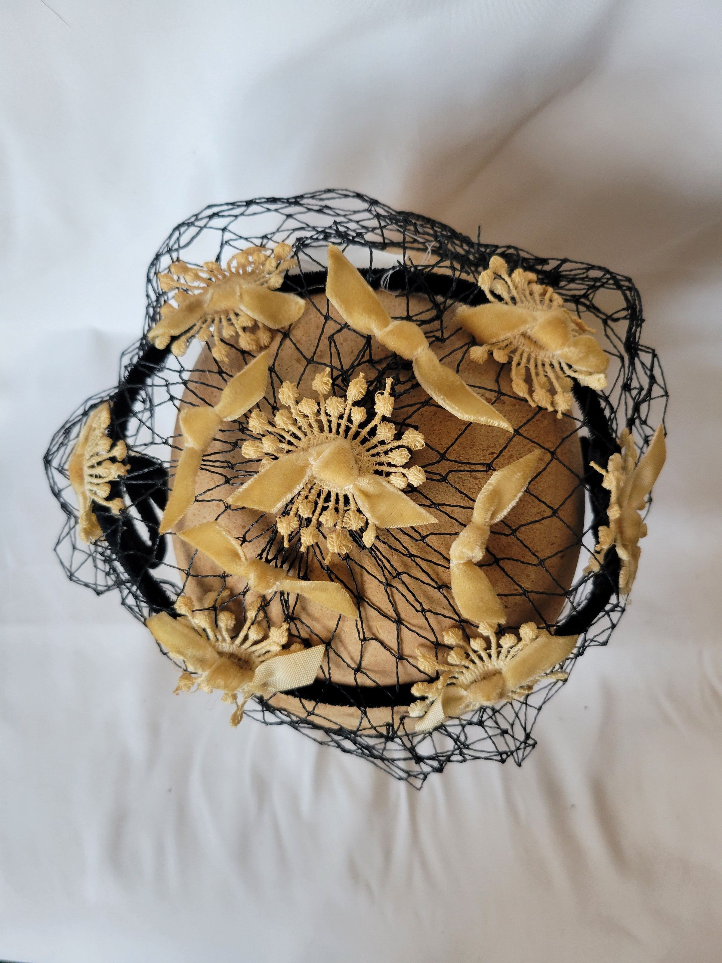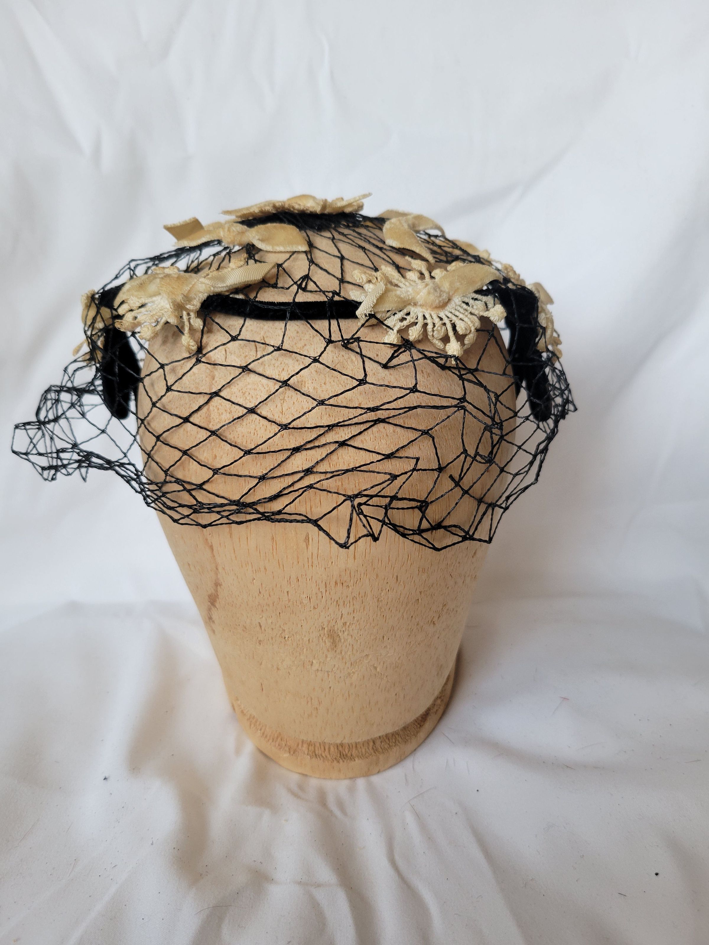 A black velvet covered wire ring with prongs on either side and wide black netting draped over. Ivory applique adorn the top. This type of circlet "hat" with no crown was popular in the 1950s.Collection