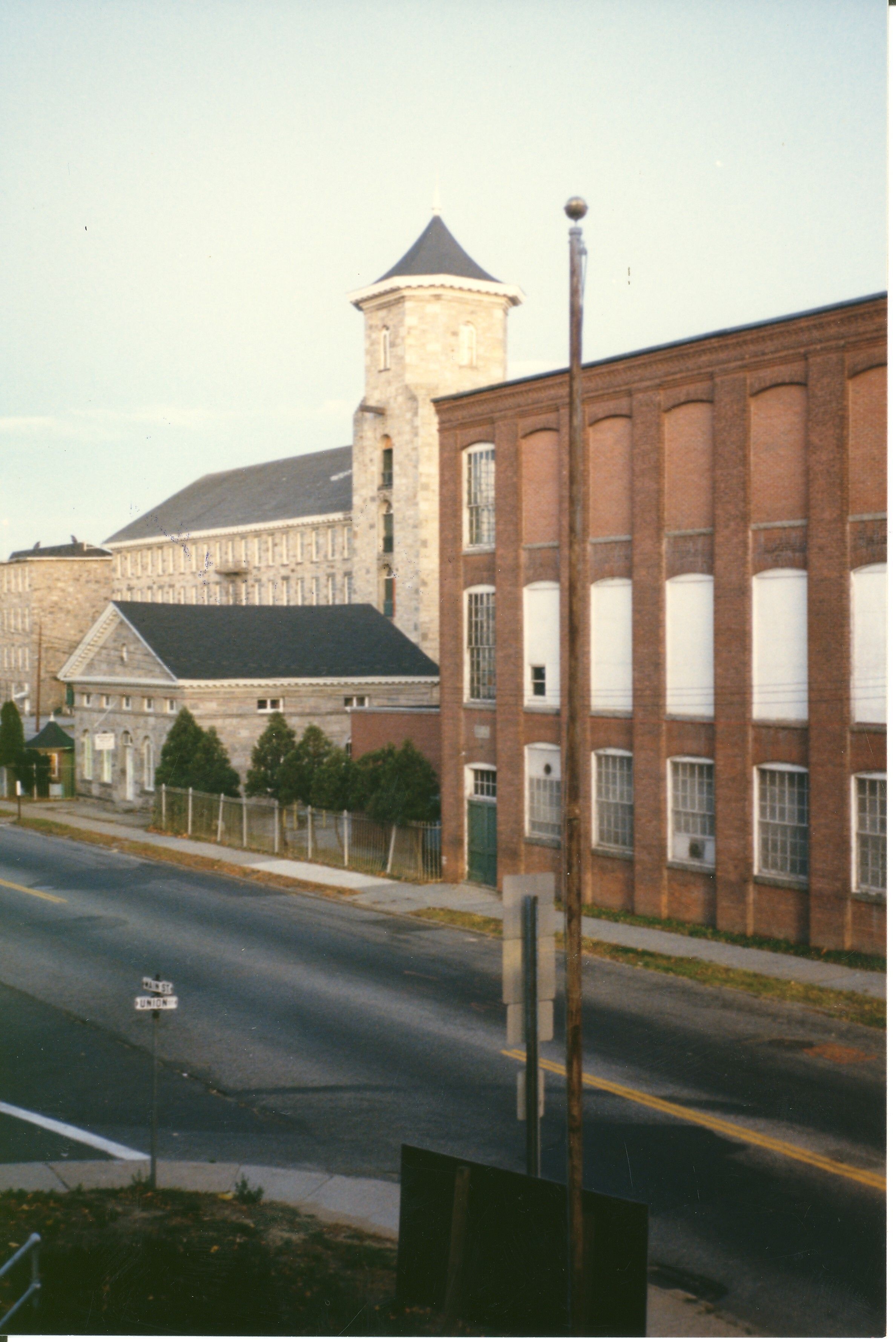 Color photographic print of the Bleach House (also known as the Package Dye House, or the brick dye house), old stone office building, and Mill No. 2, American Thread Company, Willimantic, CT, taken from in front of the Mill Museum (formerly the company store) at the corner of Main and Union Streets. Unknown photographer. Taken c. 1987, shortly after ATCO closed its Willimantic plant.Photograph Details