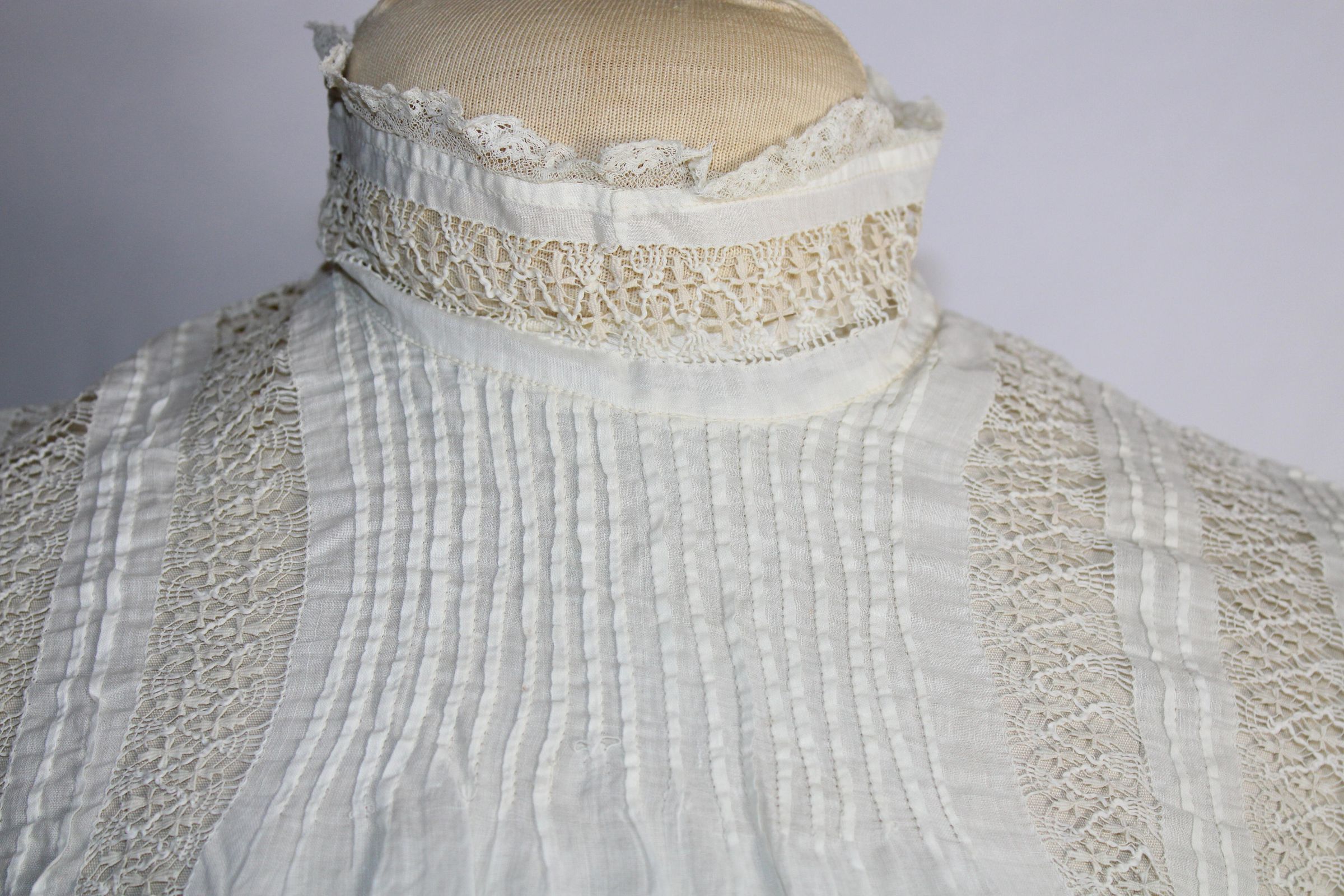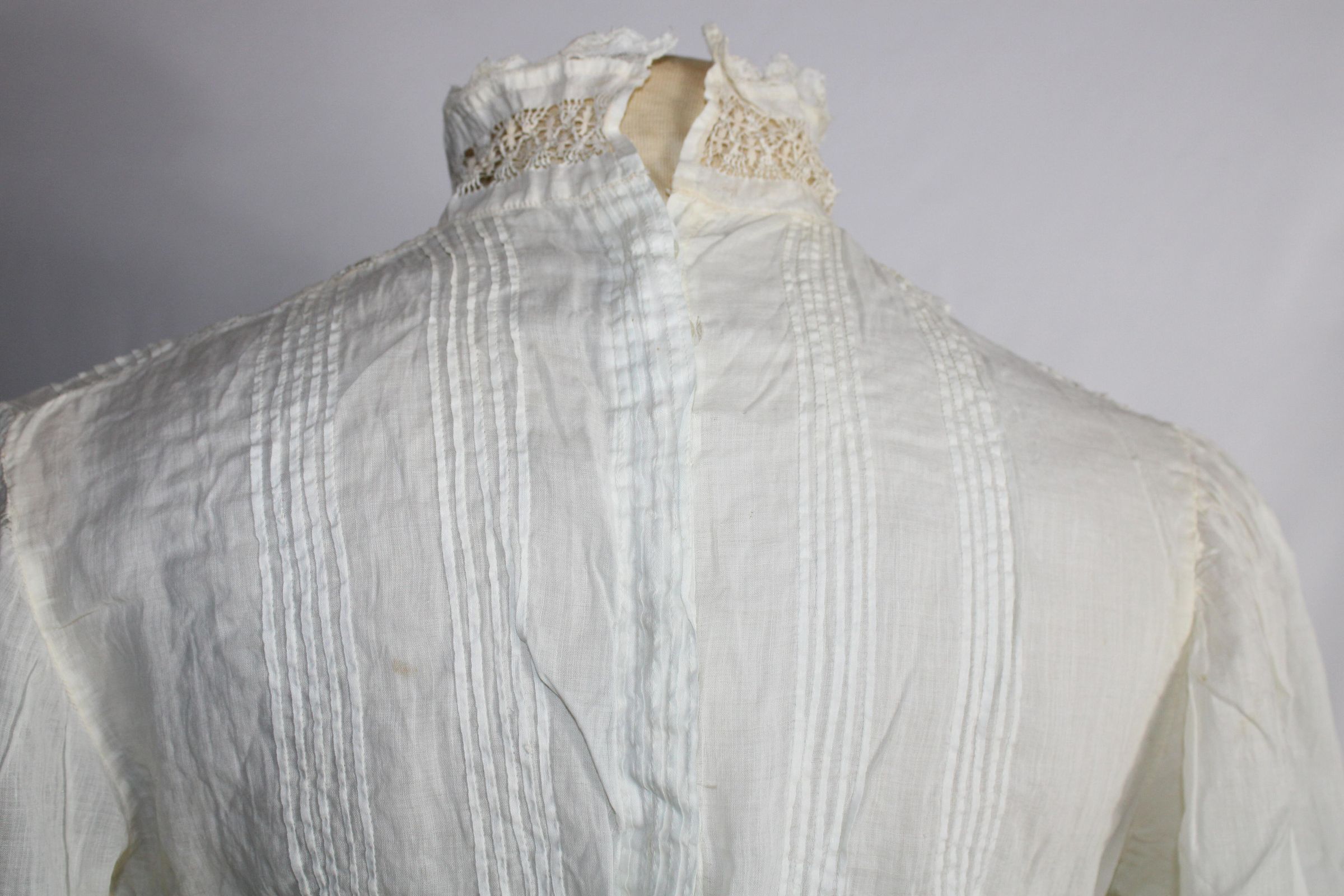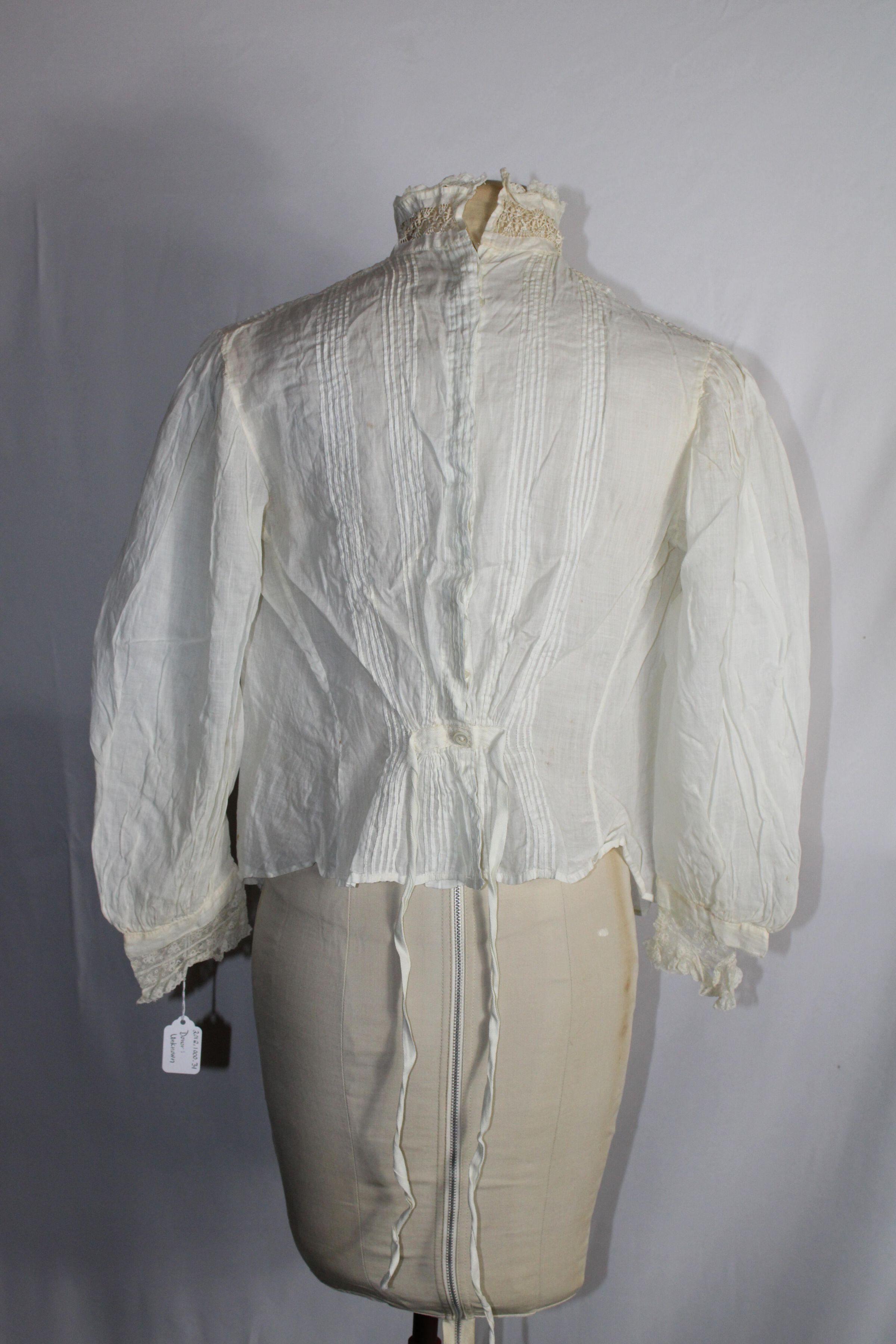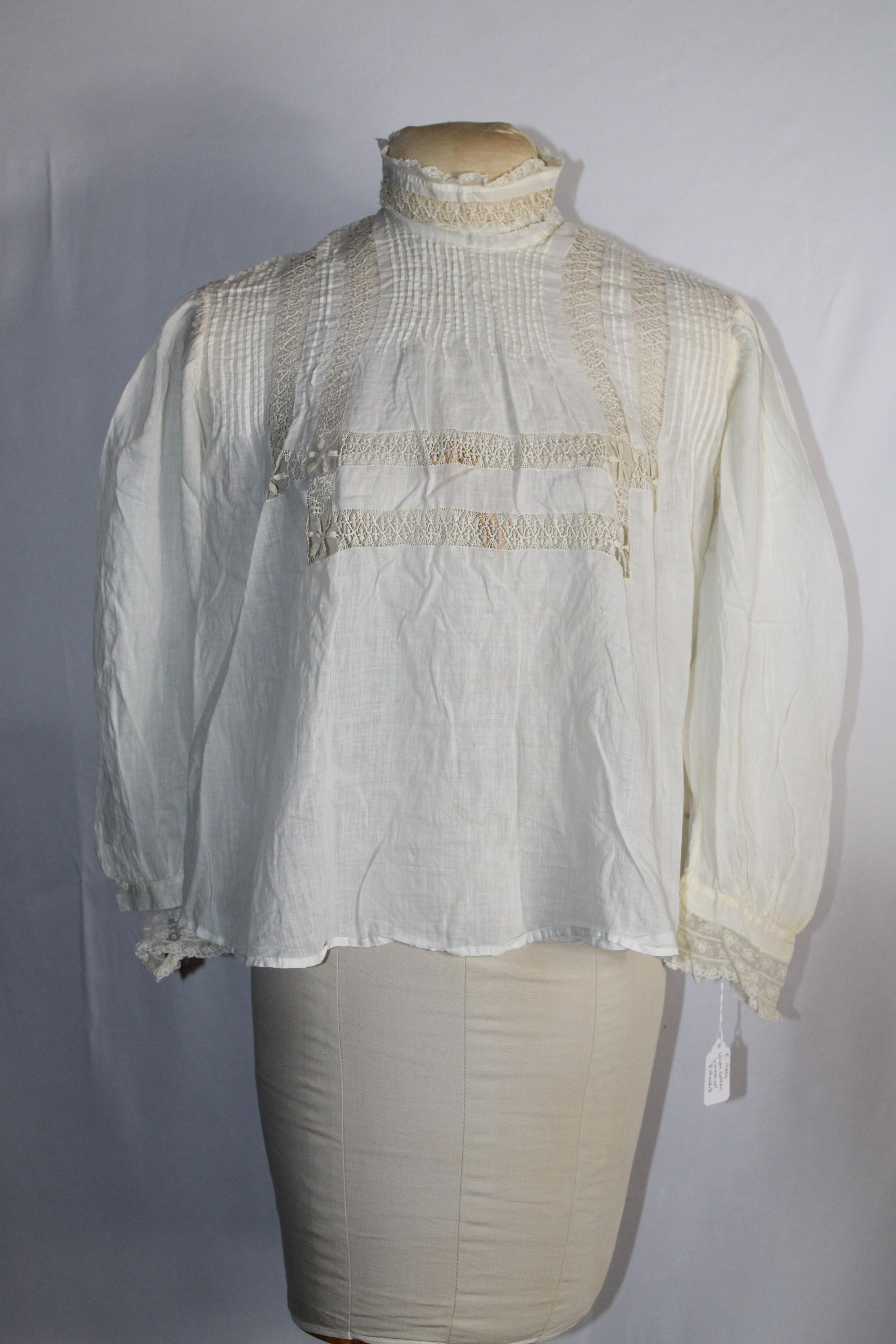 Likely Edwardian blouse with 1/16 inch pin tucks and lace insertion. Lace collar. Lace at sleeve ends beginning to detach. Button closure at back with cinching string.Collection