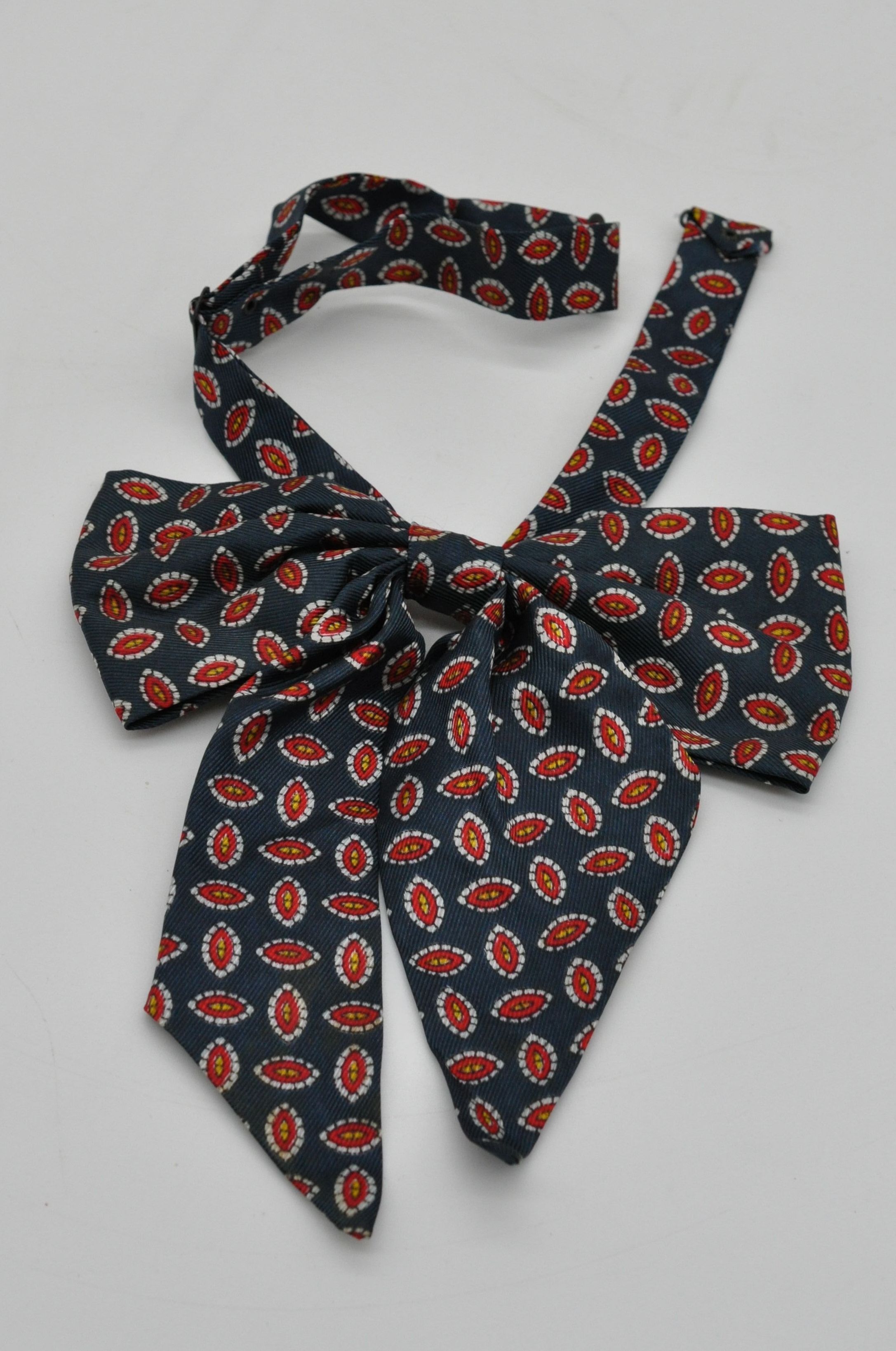 A dark blue clip on bow tie with red and white oval pattern.Collection