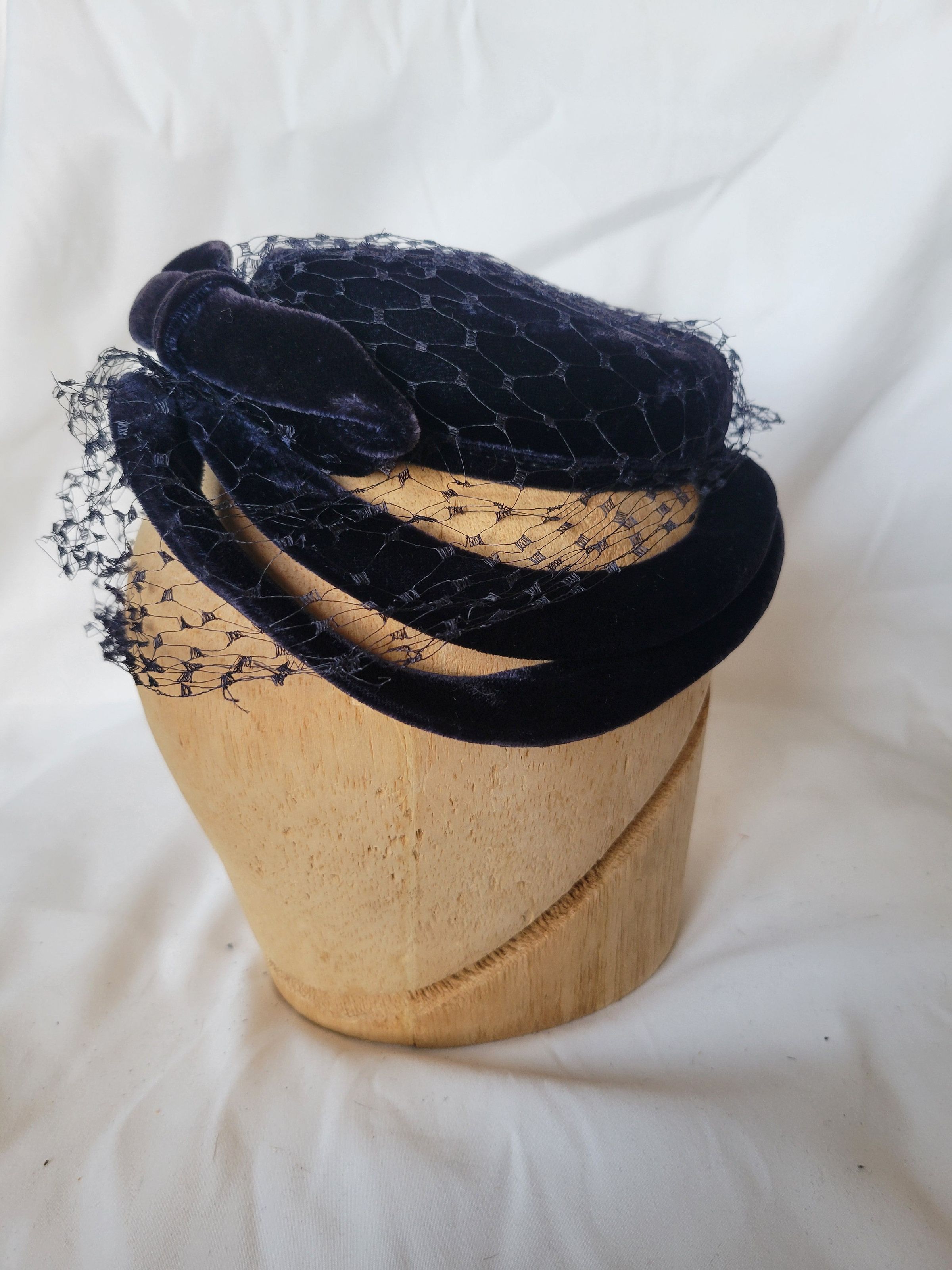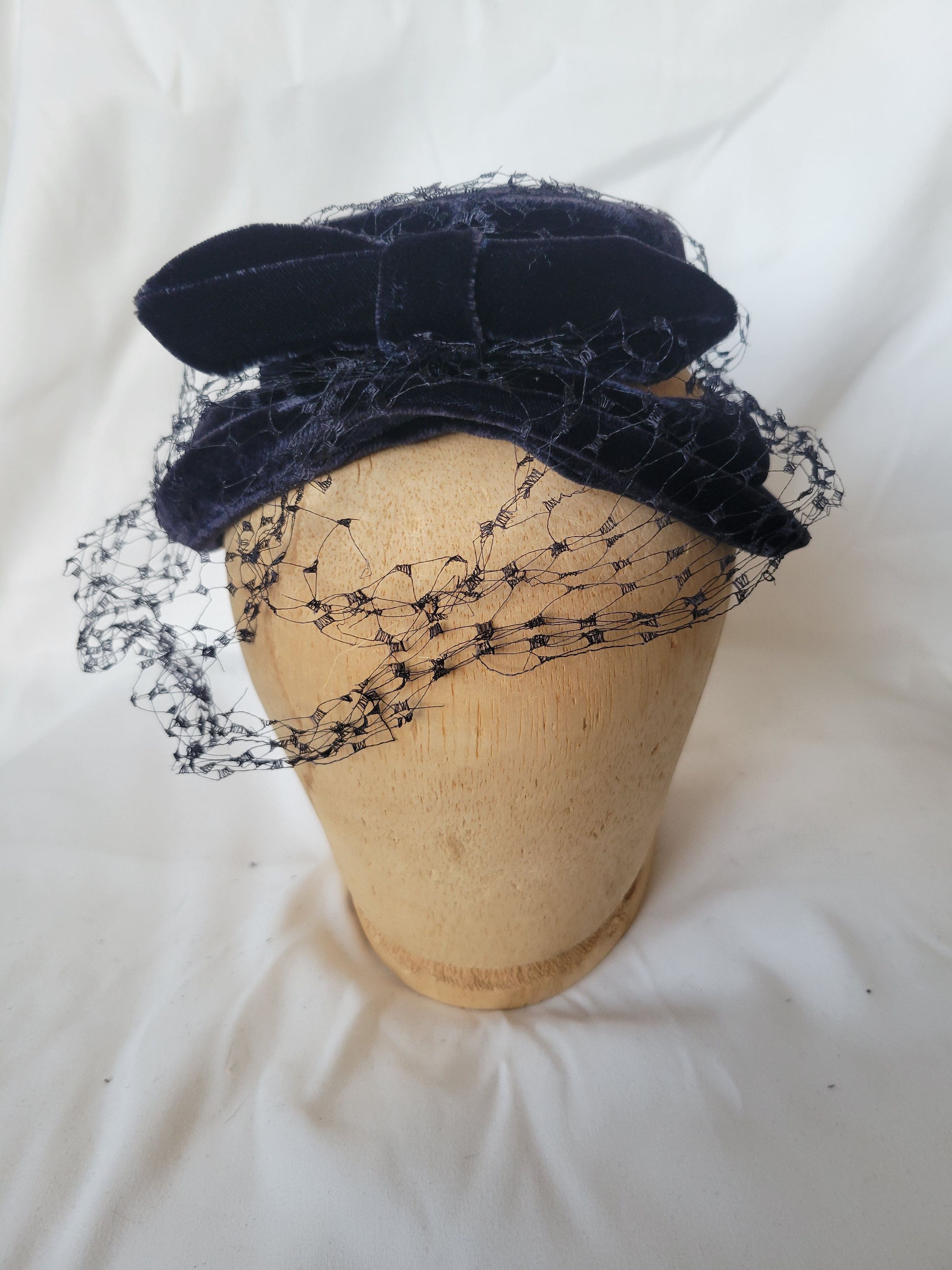 A dark blue velvet pillbox style small hat with two loops coming down the sides as well as dark blue netting. The netting goes over the top of the hat as well as down the front as a veil, and is torn in several places.Collection