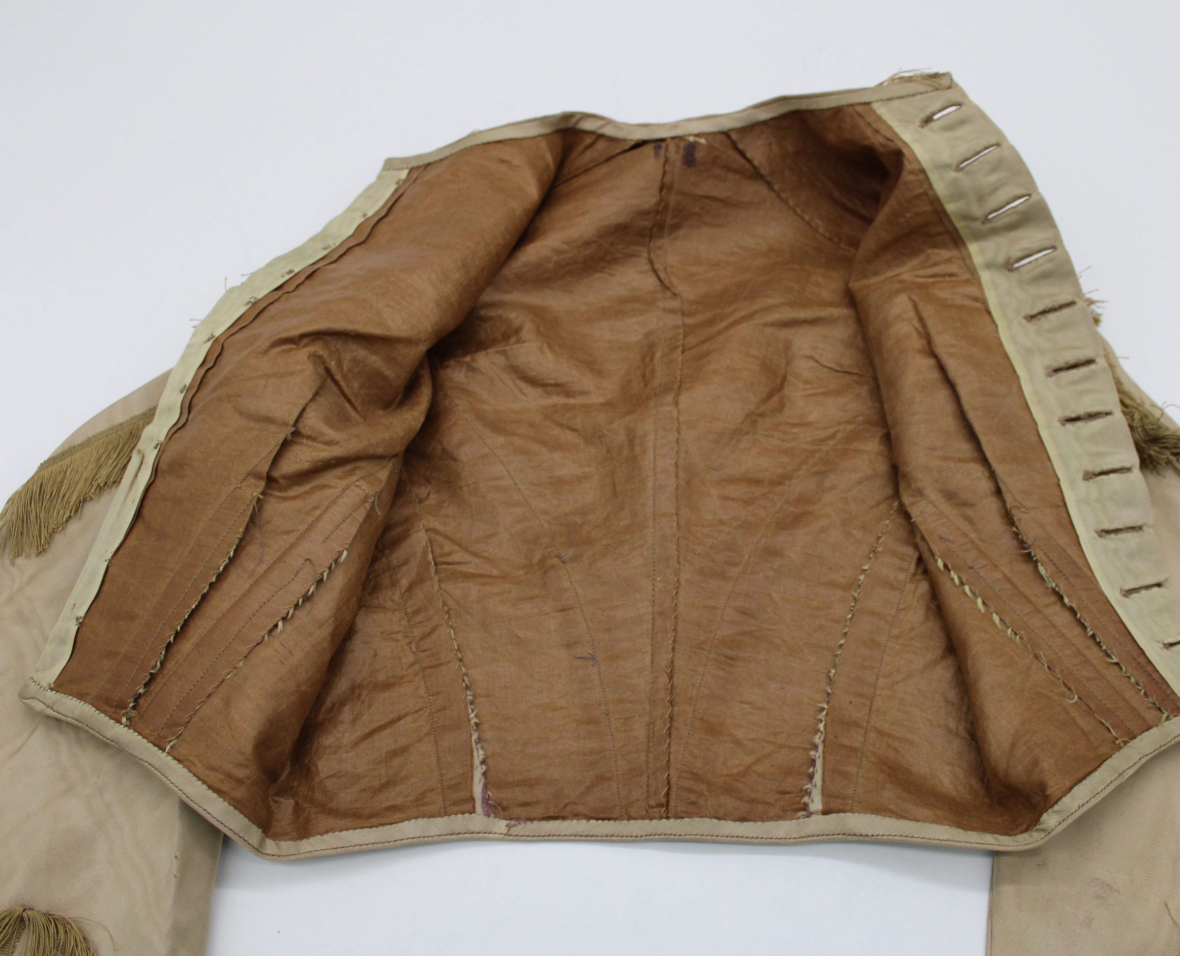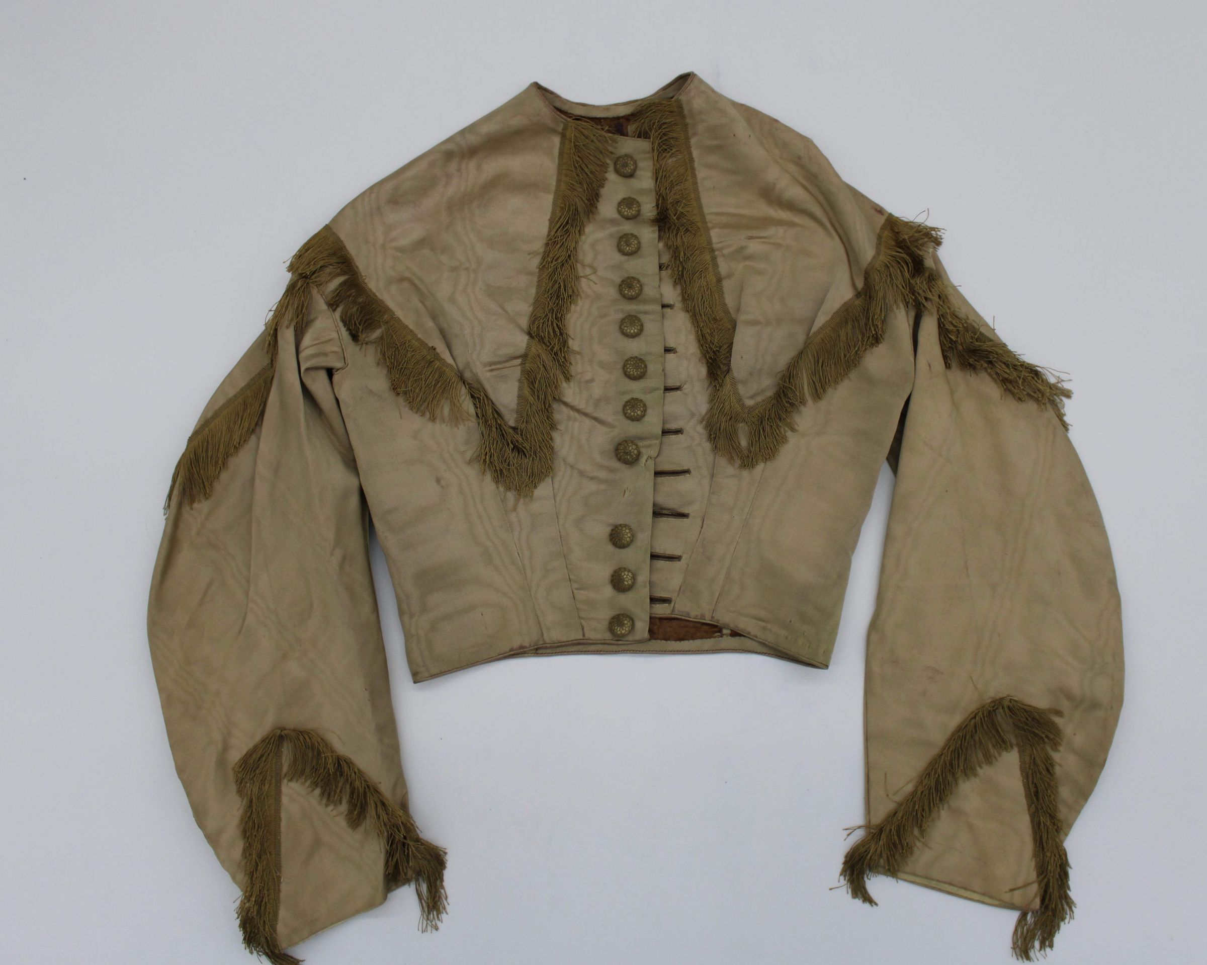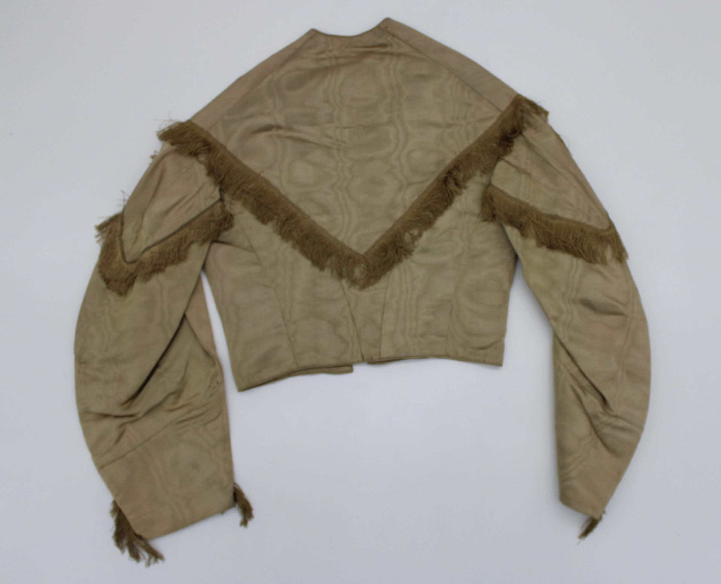 c. 1860's watered silk/moire bodice with fringe trim; coat sleeve; center front closure with thread wrapped buttonClothing/Dress/Costume Details