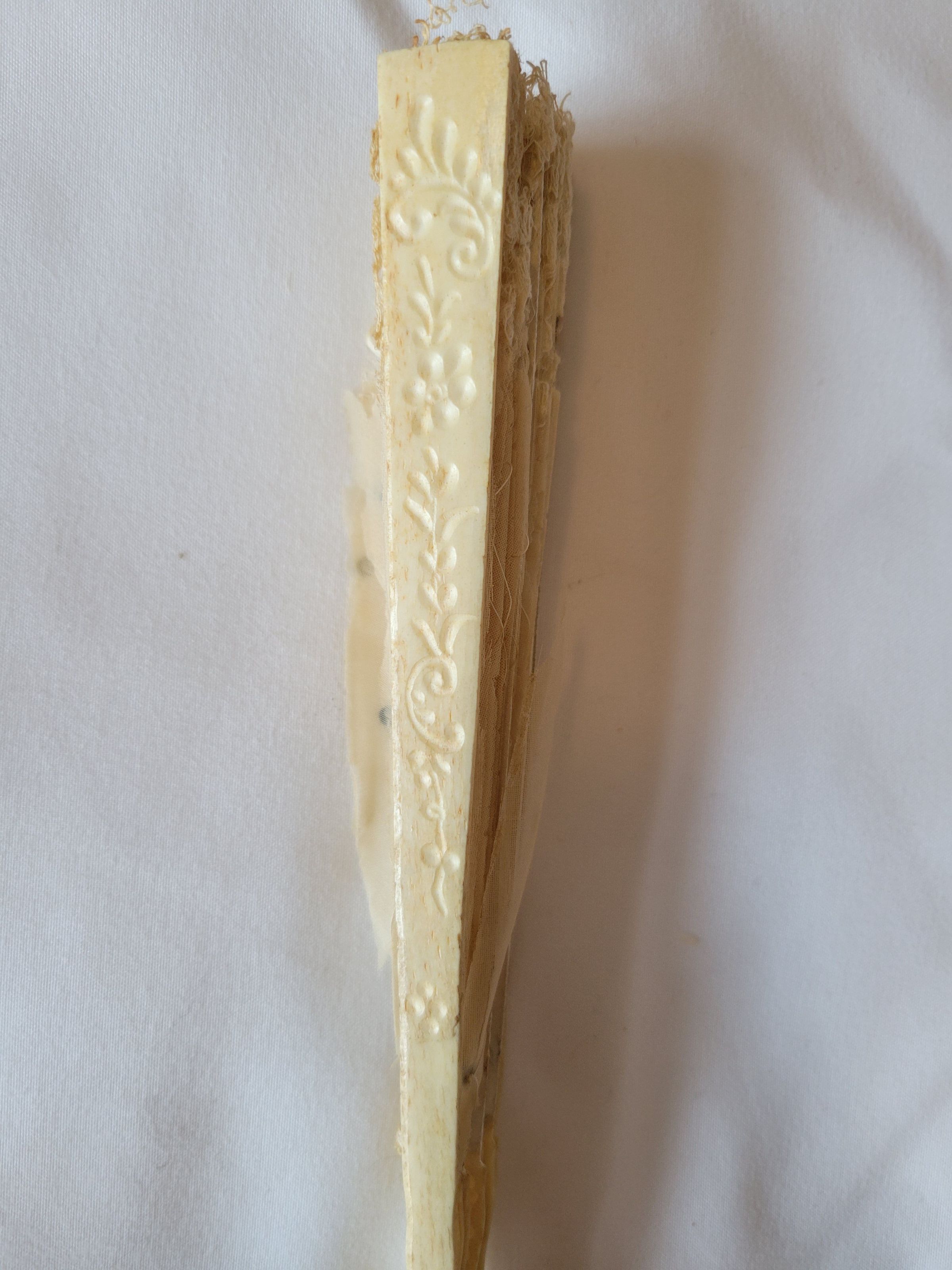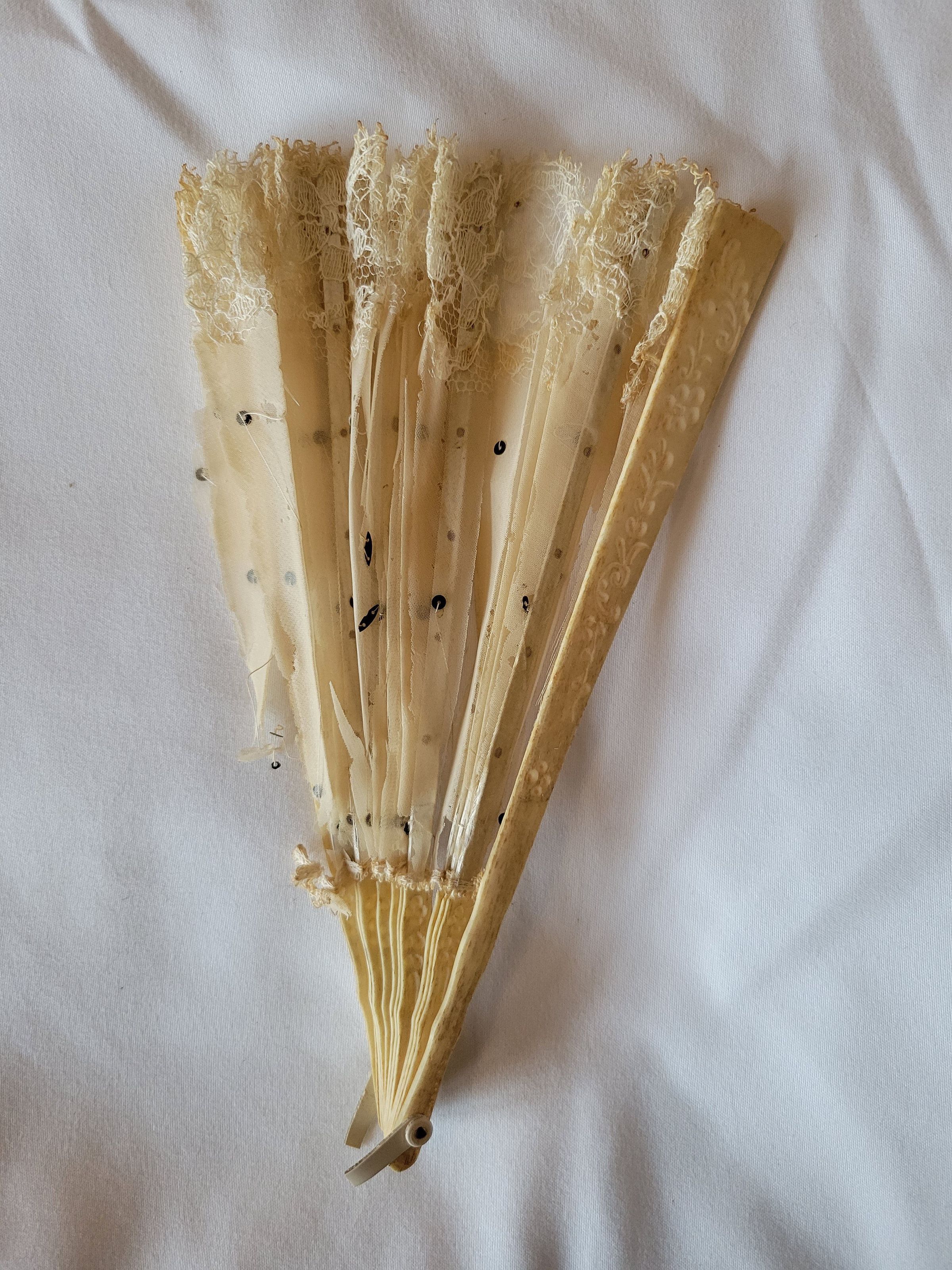 A hand fan with bone spines and white chiffon fabric. There is also white lace at the top and tiny black sequins sewn in throughout. This fan is in very poor condition, the chiffon is flaking and disintegrating, making it impossible to open the fan all the way without damaging it further. The metal hook at the end, used both to hold the fan together and to attach it to the user, is also broken. The bone pieces are delicately carved with floral patterns. Circa 1900.Collection