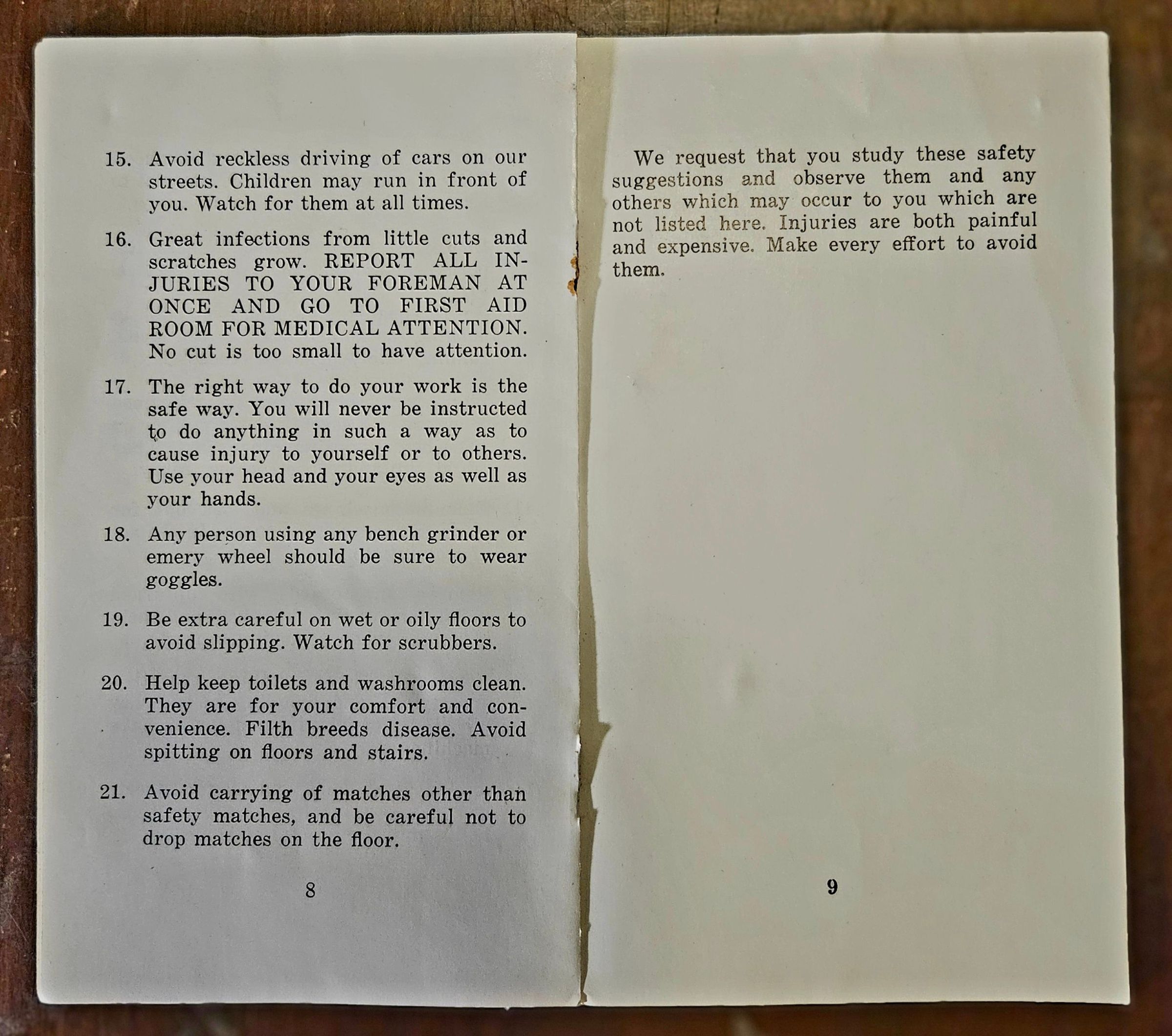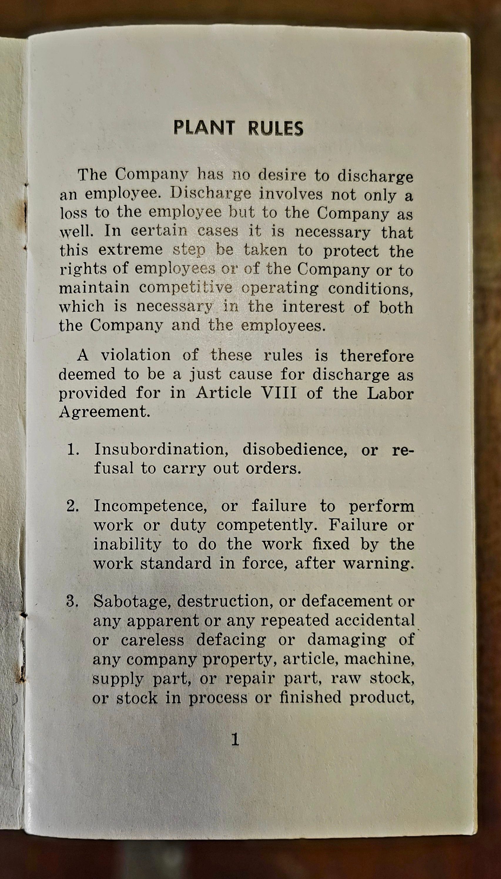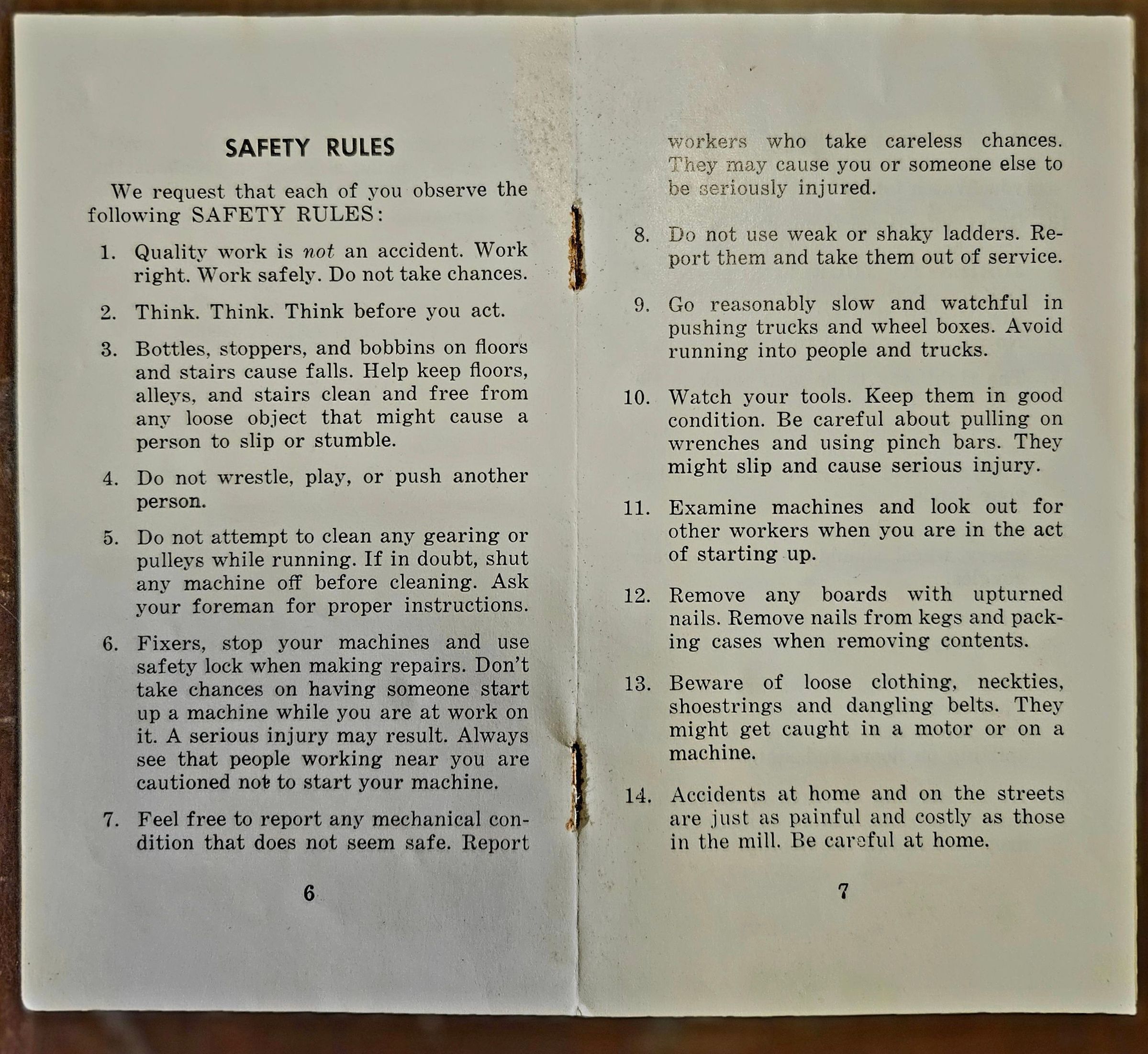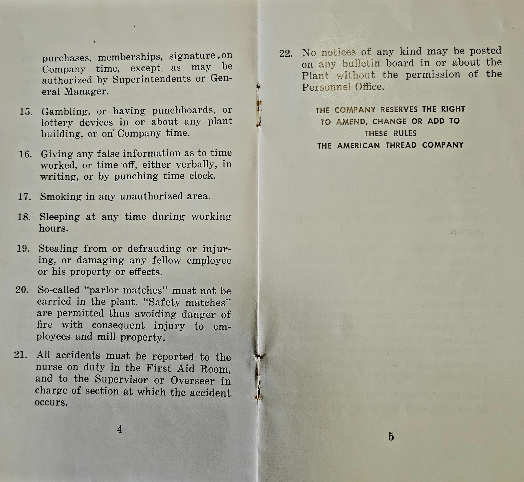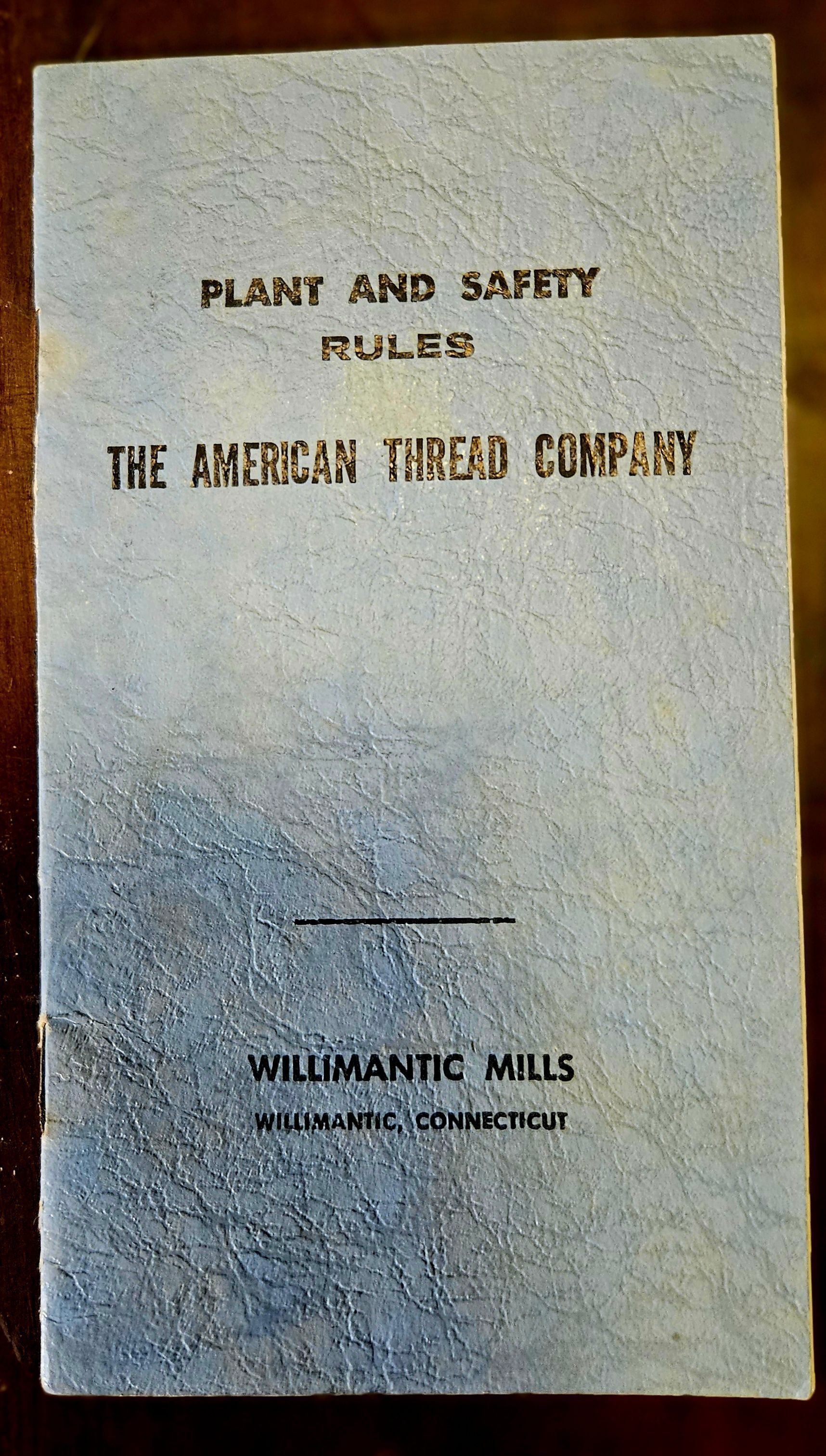 Booklet (9 pp). "Plant and Safety Rules. The American Thread Company. Willimantic Mills. Willimantic, Connecticut." No date, but probably c. 1960.Collection