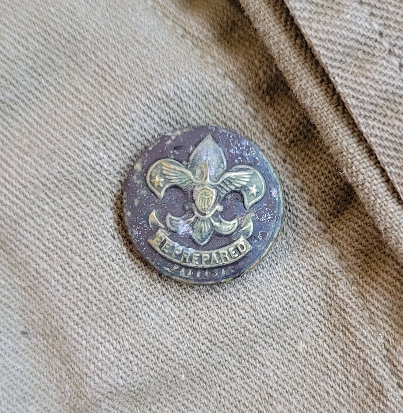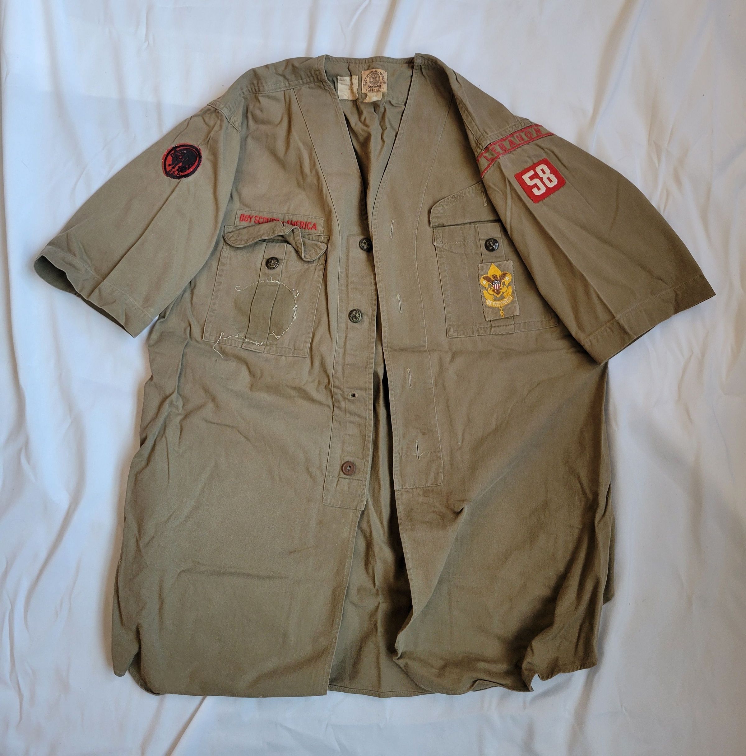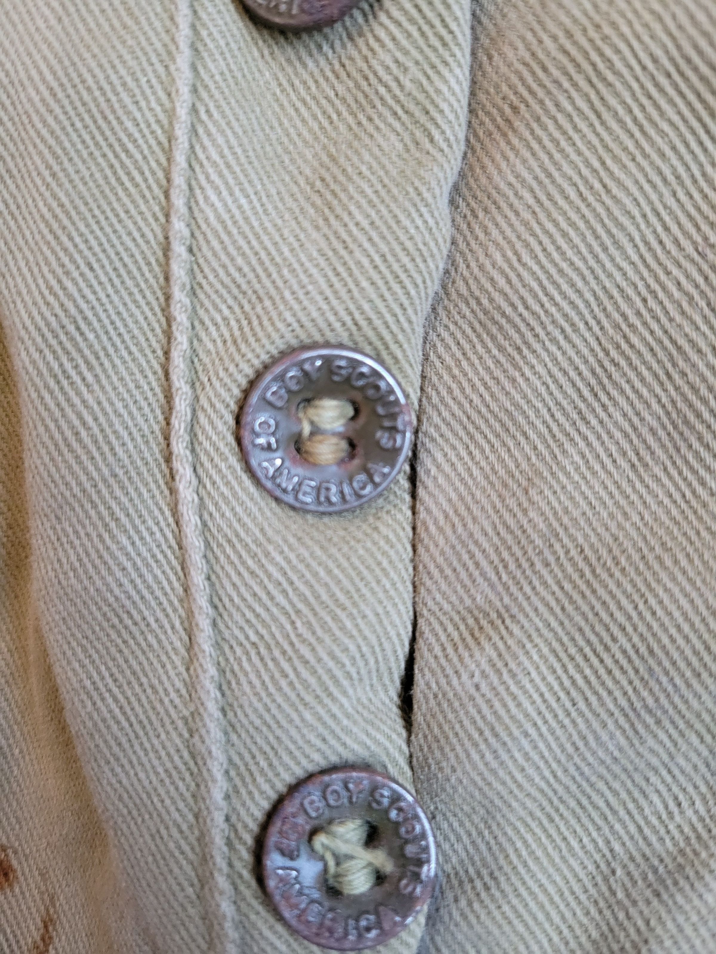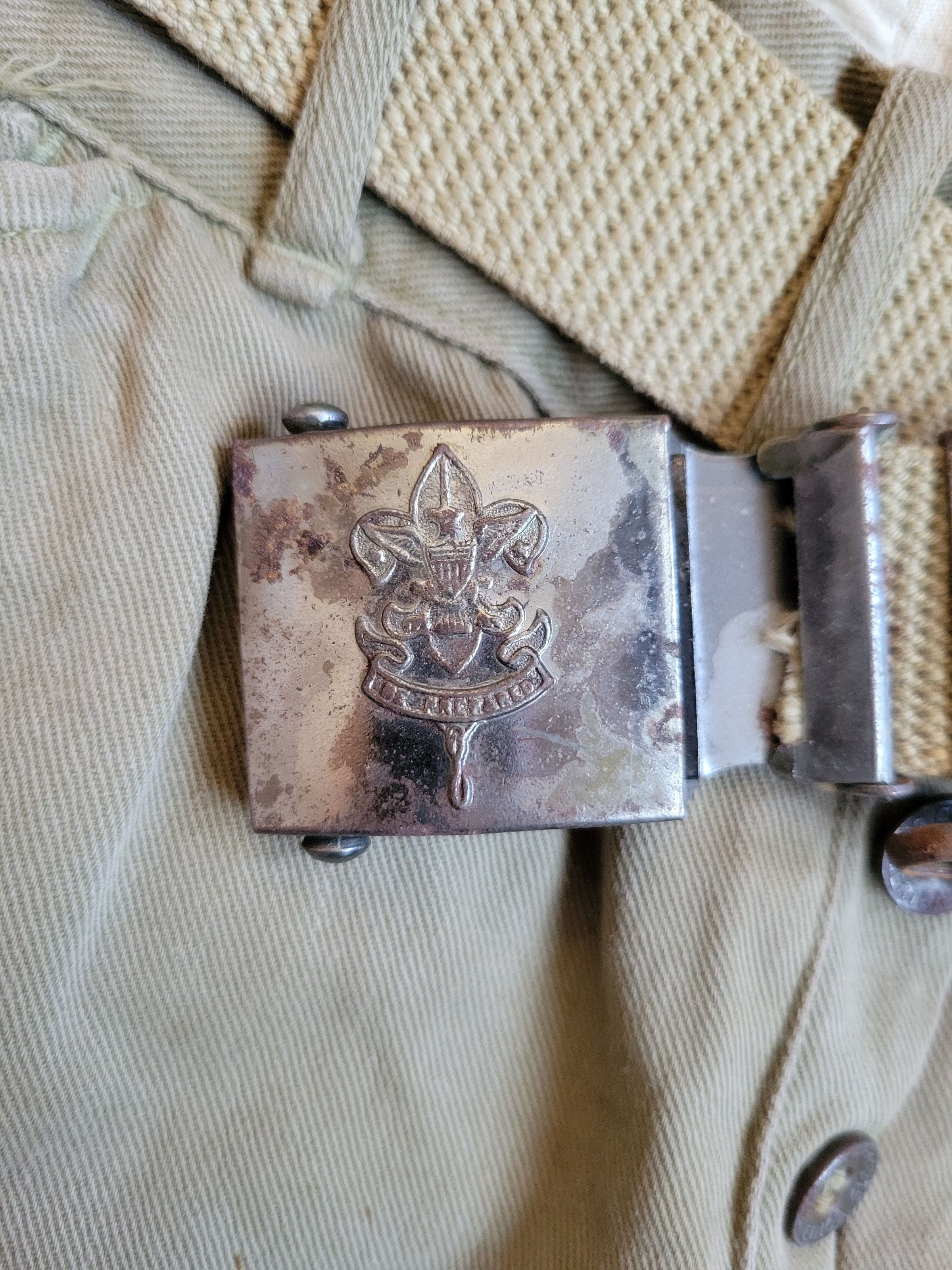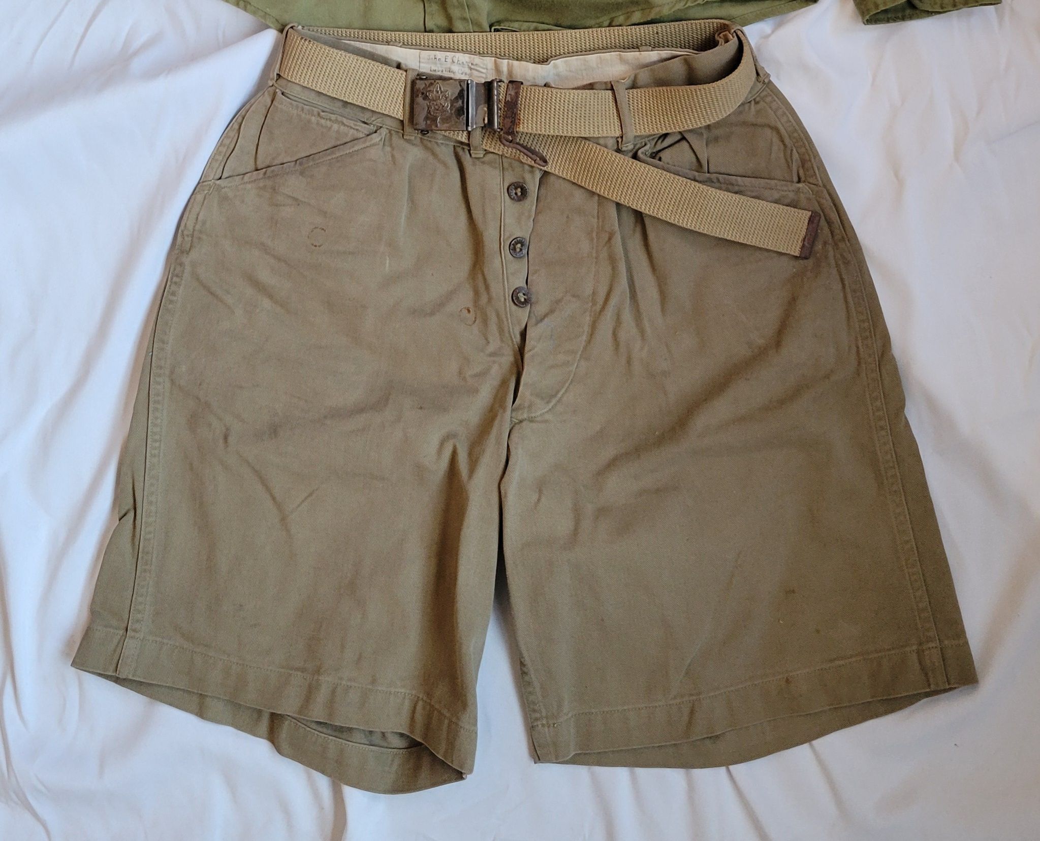 BSA uniform of John Champe of Lebanon, CT, Troop 58. The shirt is missing a circular patch over the right side chest pocket, and the third button down is lost. Other than these the shirt is in good condition. The buttons all feature the BSA insignia and the motto "Be Prepared." A handwritten and sewn tag inside the neck states that this shirt belonged to John Champe of Lebanon, CT, Troop 58. The garment tag indicates the age of the wearer, 16, neck size 14, and the number 687. It also says the garment is union made. The shorts have a similar handwritten tag inside the waistband and include a canvas belt with a rusted metal buckle. The buckle features the BSA insignia in raised relief.Collection
