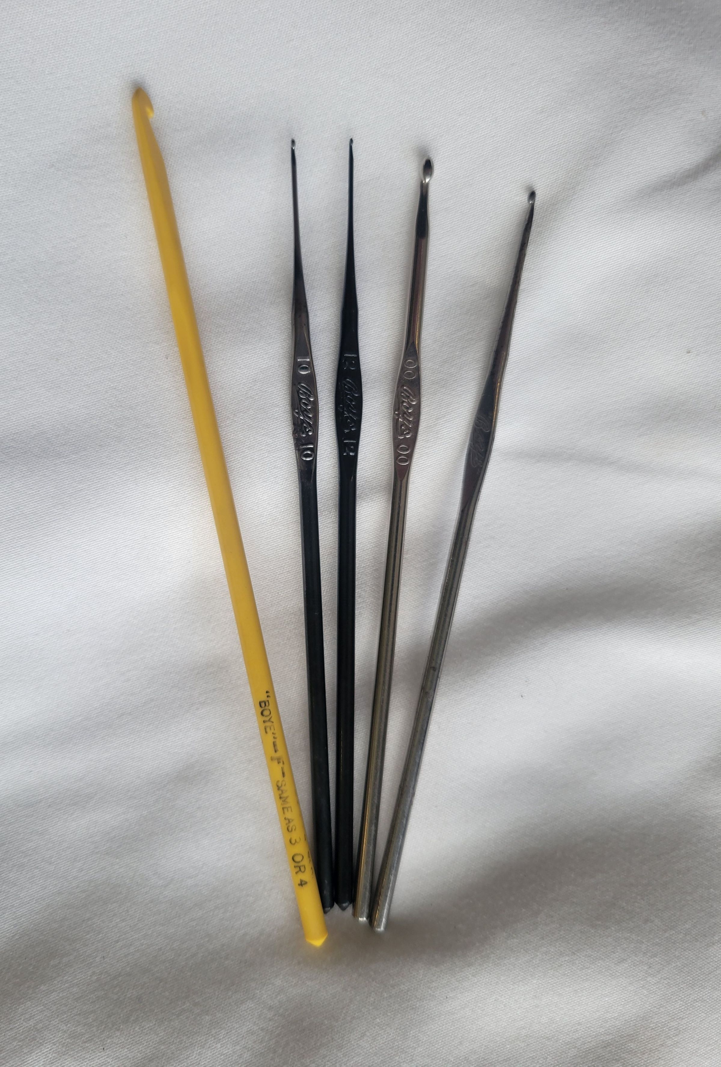 Five crochet hooks from the Boye company. The hook at the left is made from yellow plastic, while they other four are steel. The Boye company began in 1906 and in 1917 became the first company to make a full line of crochet hooks in America. The "Boye" logo with quotation marks was used until 1962, placing the yellow hook and one of the steel hooks before that date and the remaining steel hooks after.Collection
