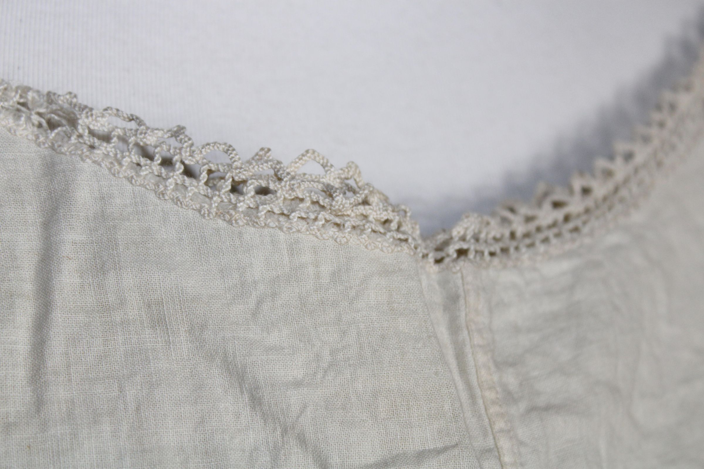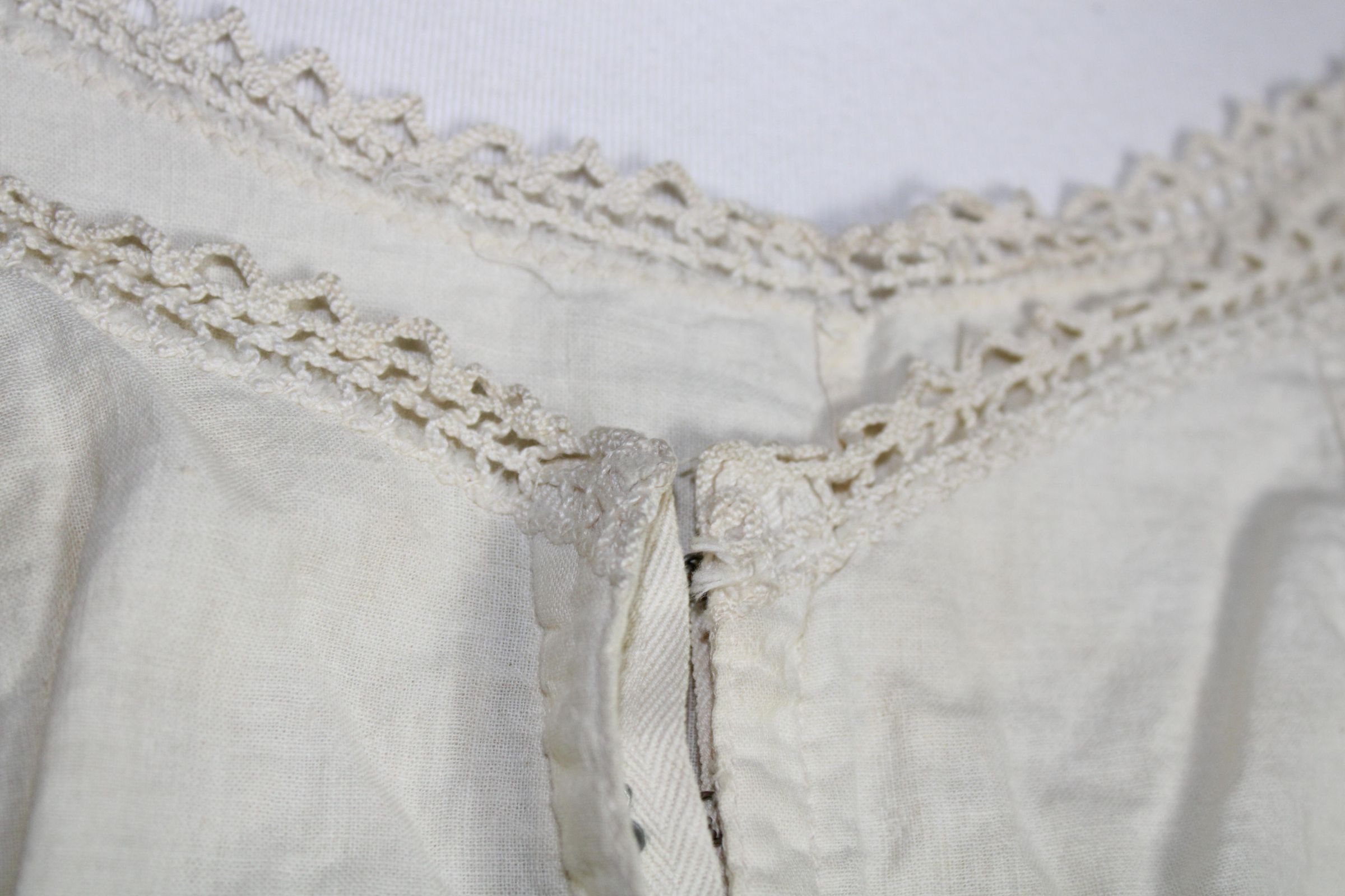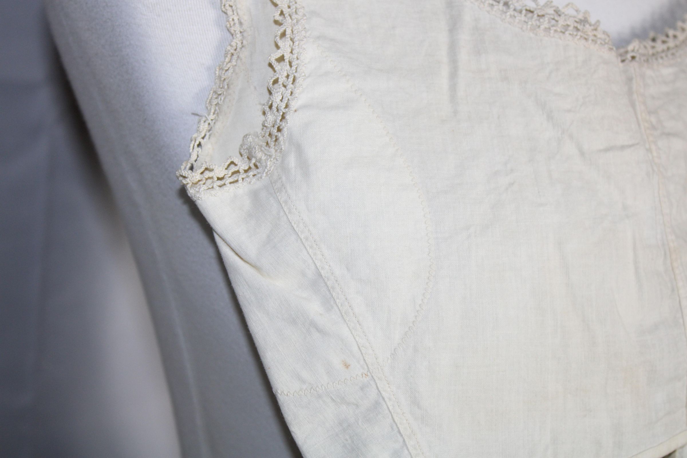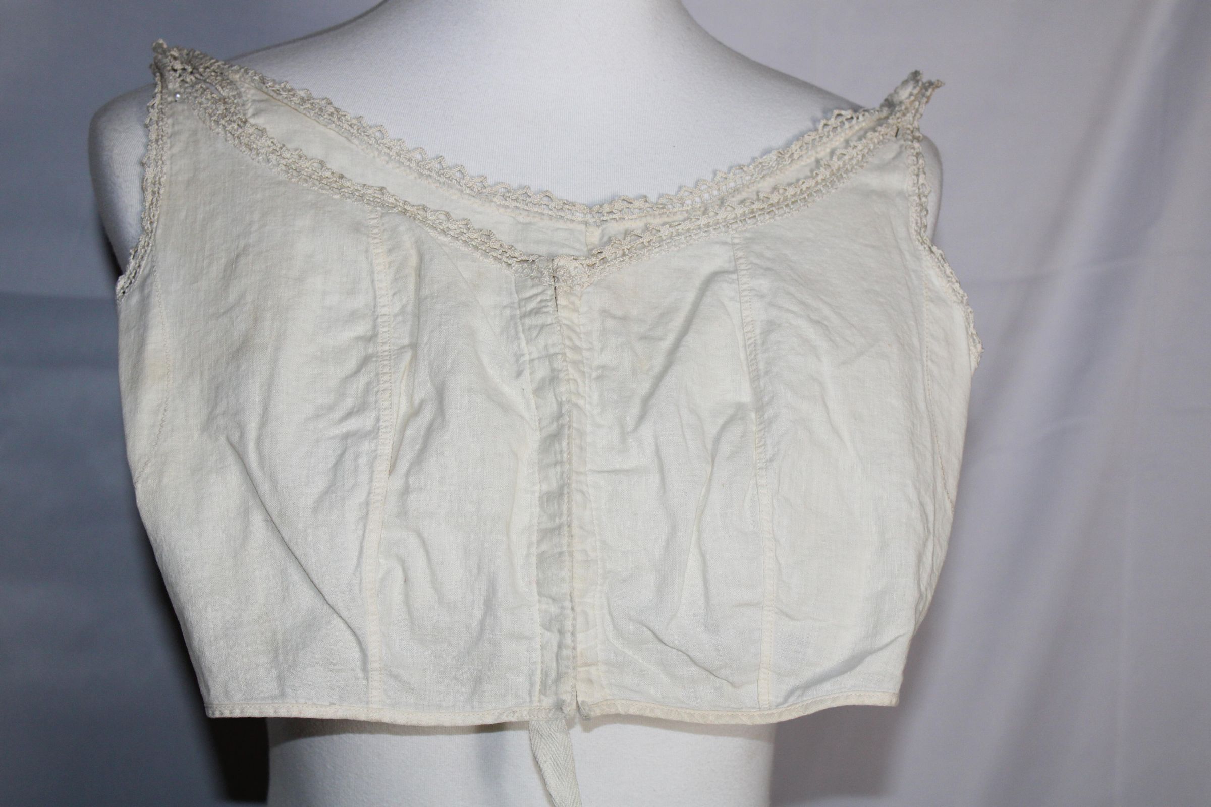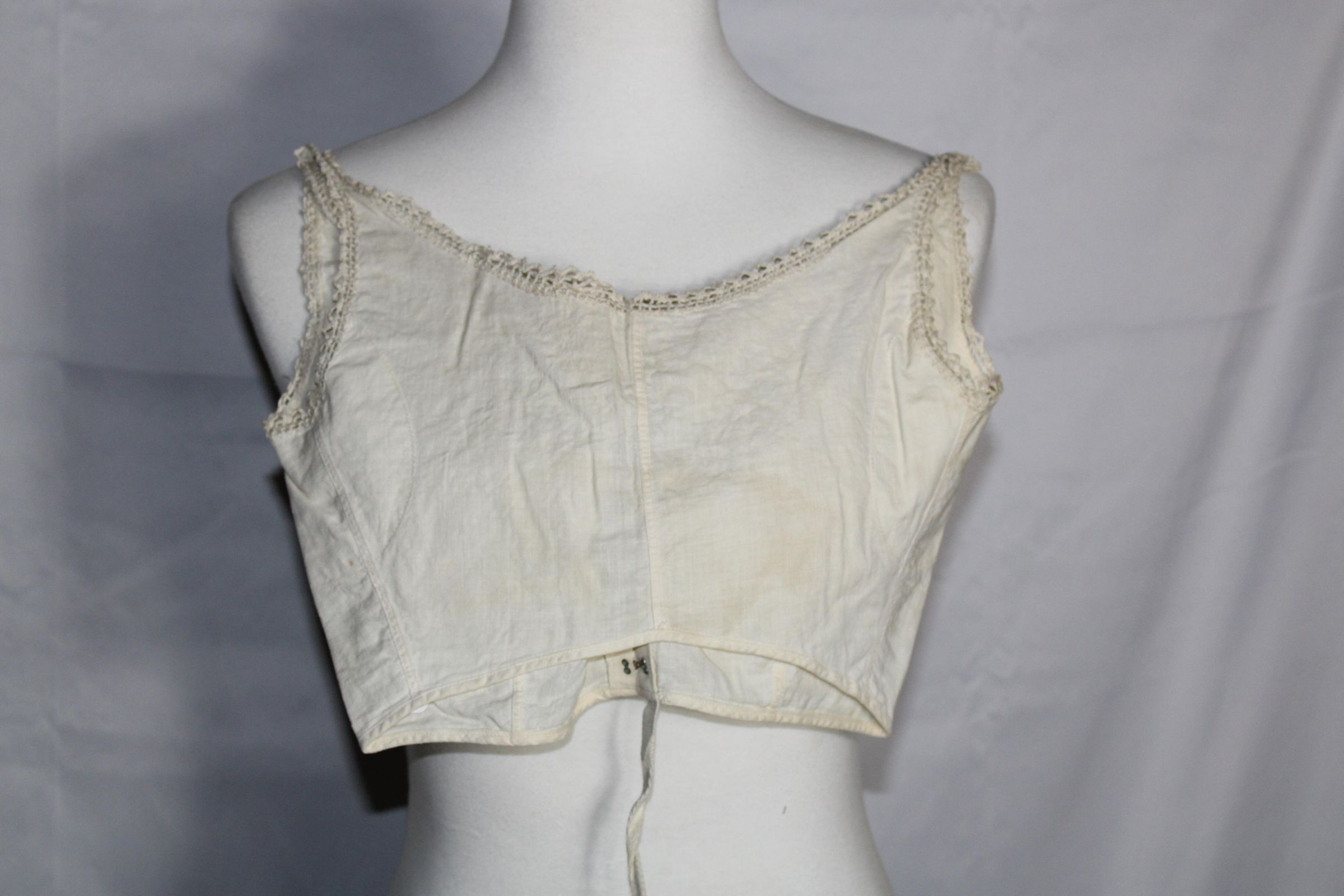 Bralette decorated with lace trim. Hook and eye tape used for closure (pat. 1927). Underarm padding inserted with machine zig zag stitch.Collection