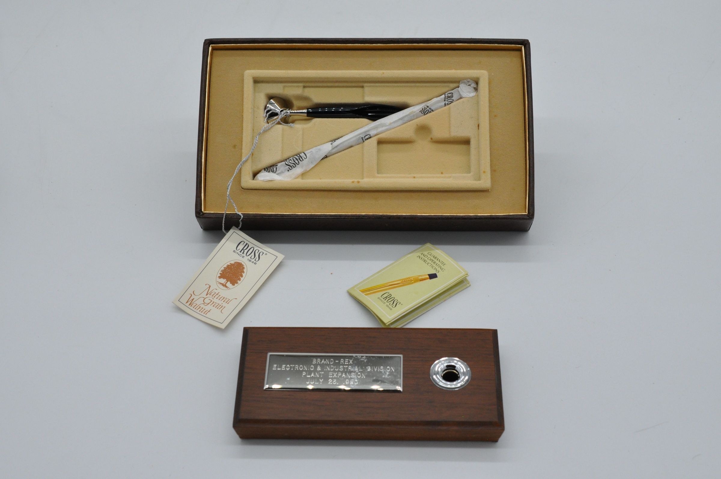 A commemorative desk pen set made by Cross. The silver plaque reads "BRAND-REX/ ELECTRONIC & INDUSTRIAL DIVISION/ PLANT EXPANSION JULY 28 1980" Brand-Rex was a cable and networking company until it was bought by Leviton in 2015.Collection