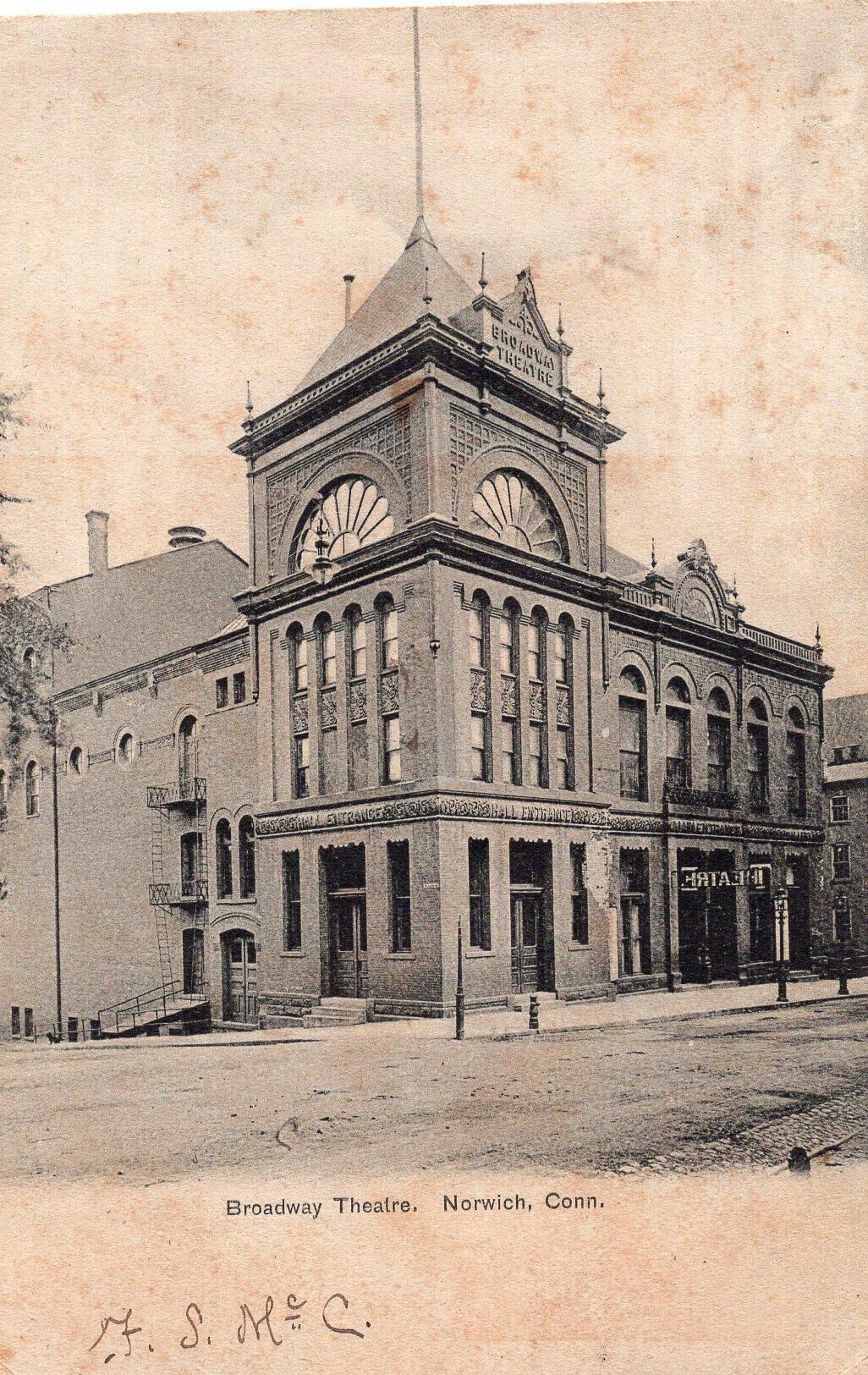A black and white postcard of the Broadway Theatre in Norwich Conn.Condition