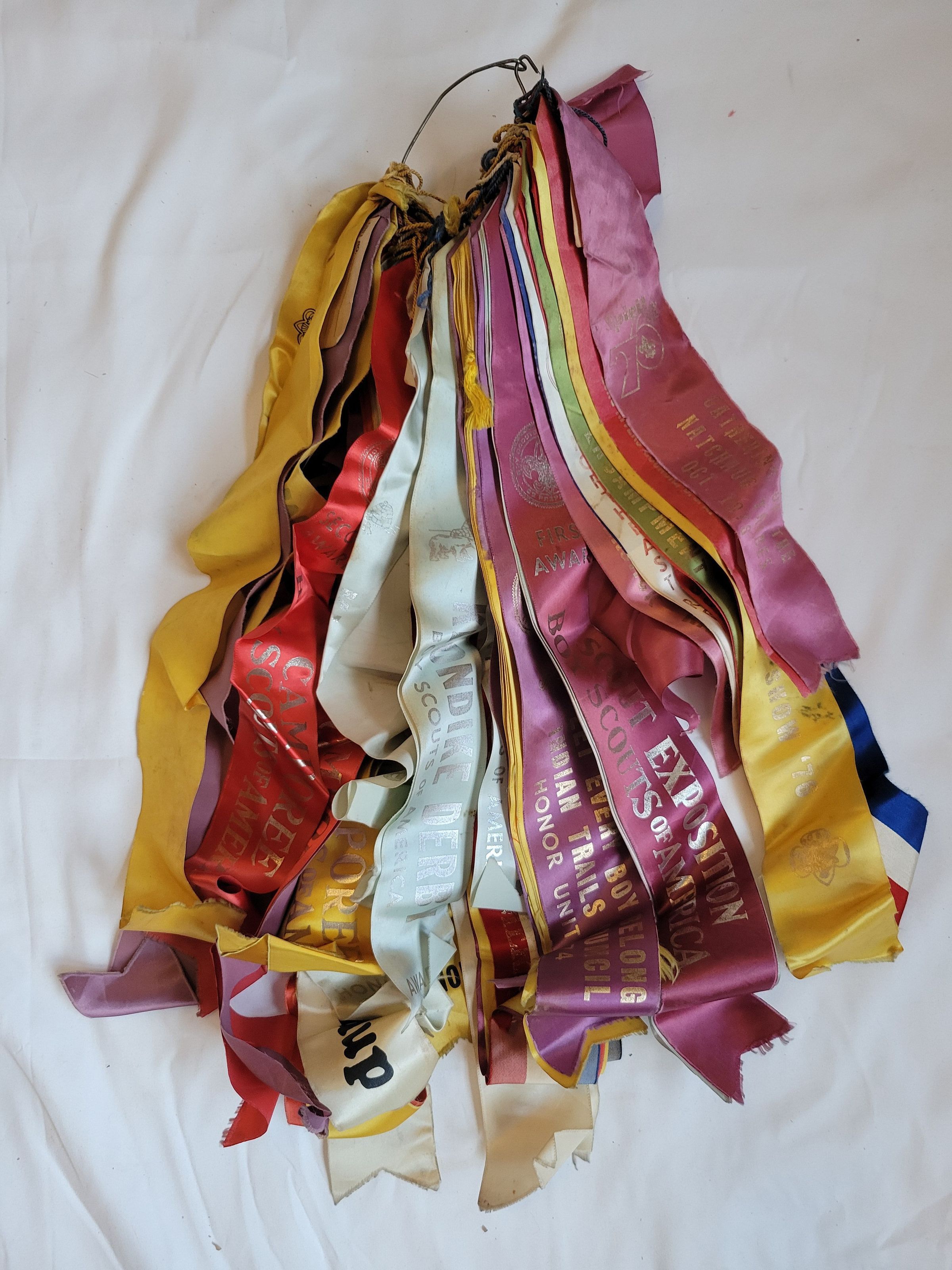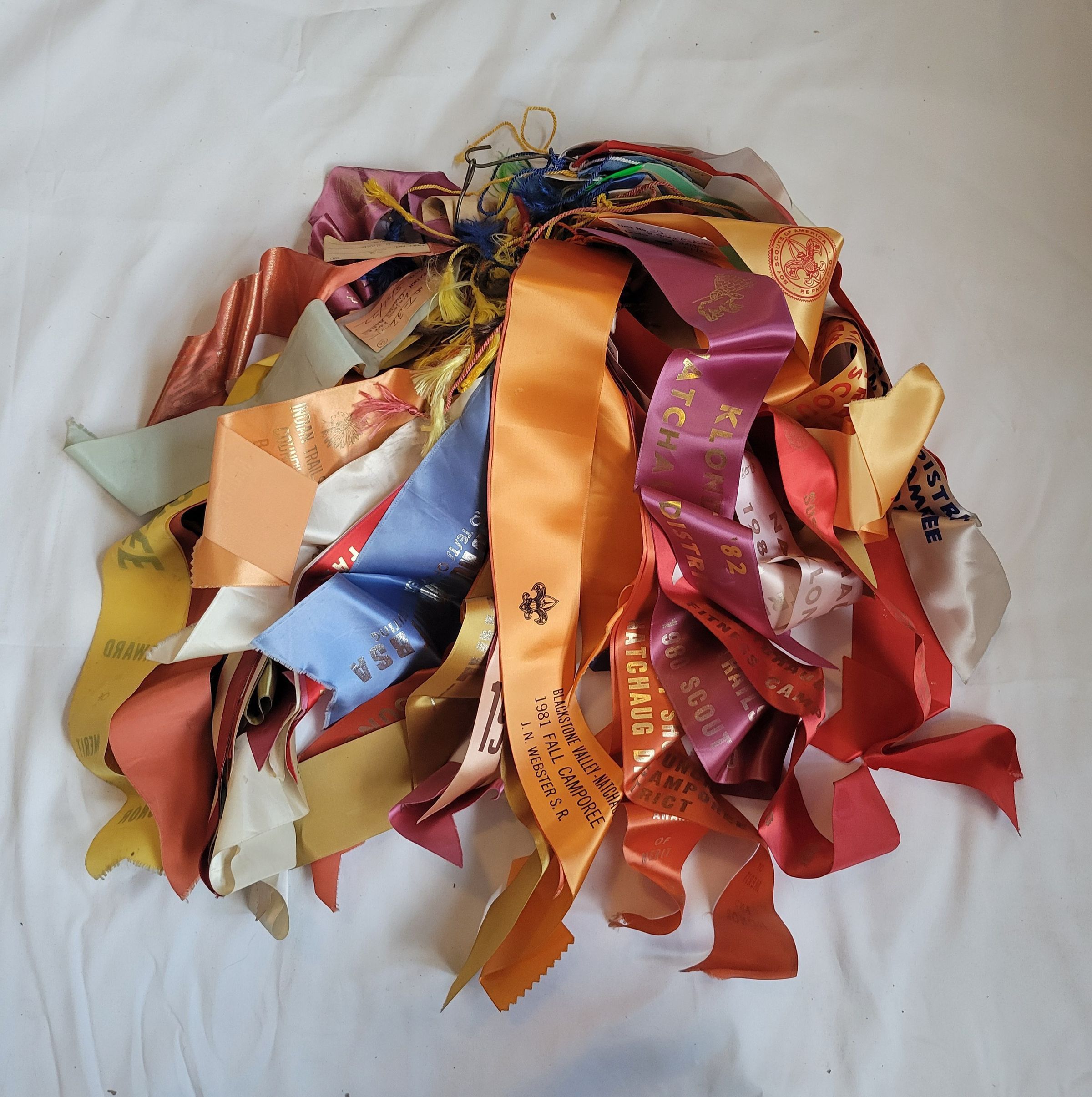Two sets of award ribbons granted to Boy Scout Troop 32 of Windham between 1964 and 1977. The ribbons are many different colors from different events, mostly with gold lettering, and held together on metal rings. The ribbons are wrinkled but otherwise in good condition. Accompanying is a handwritten list of each ribbon, what event it was from, and what year it was given.Collection