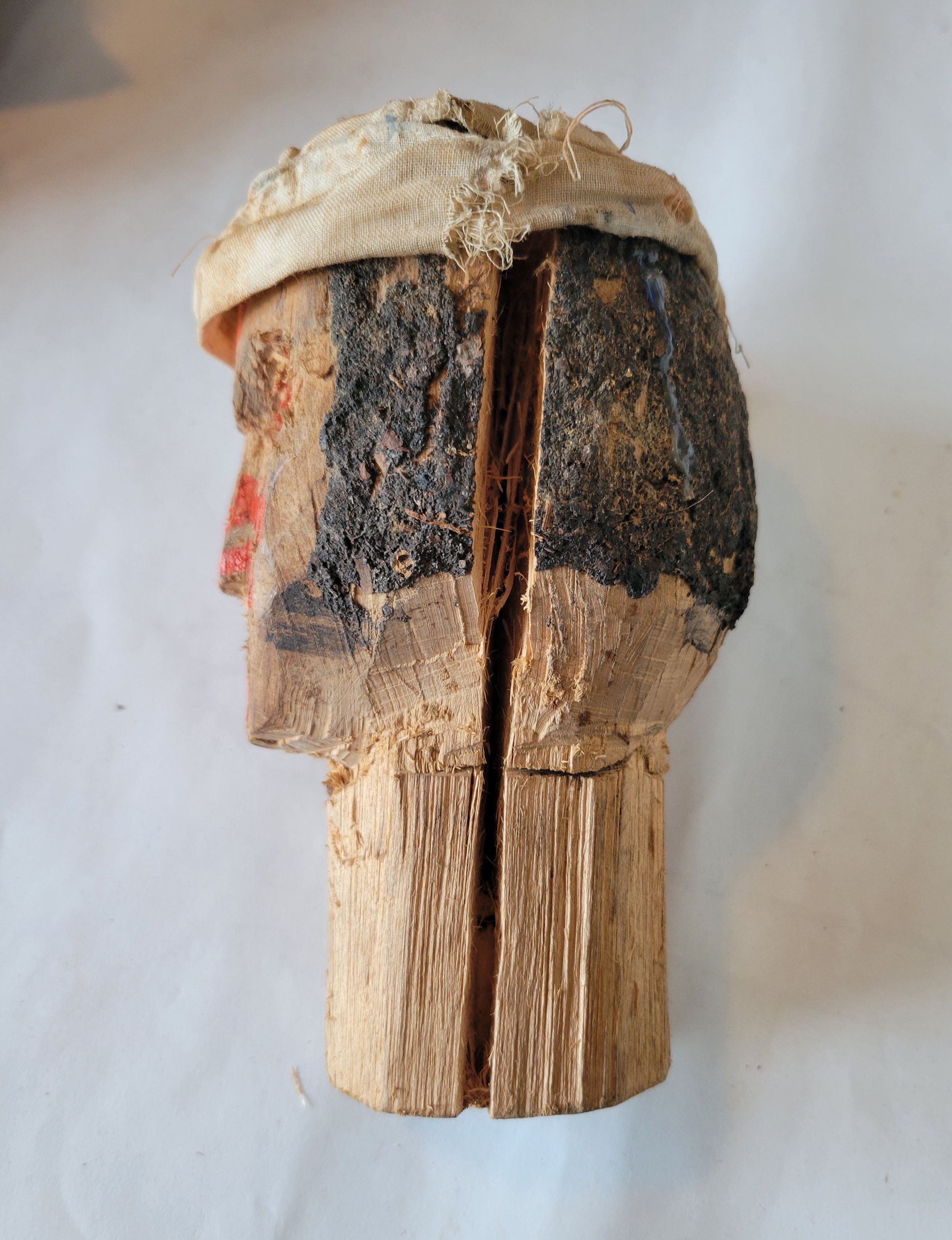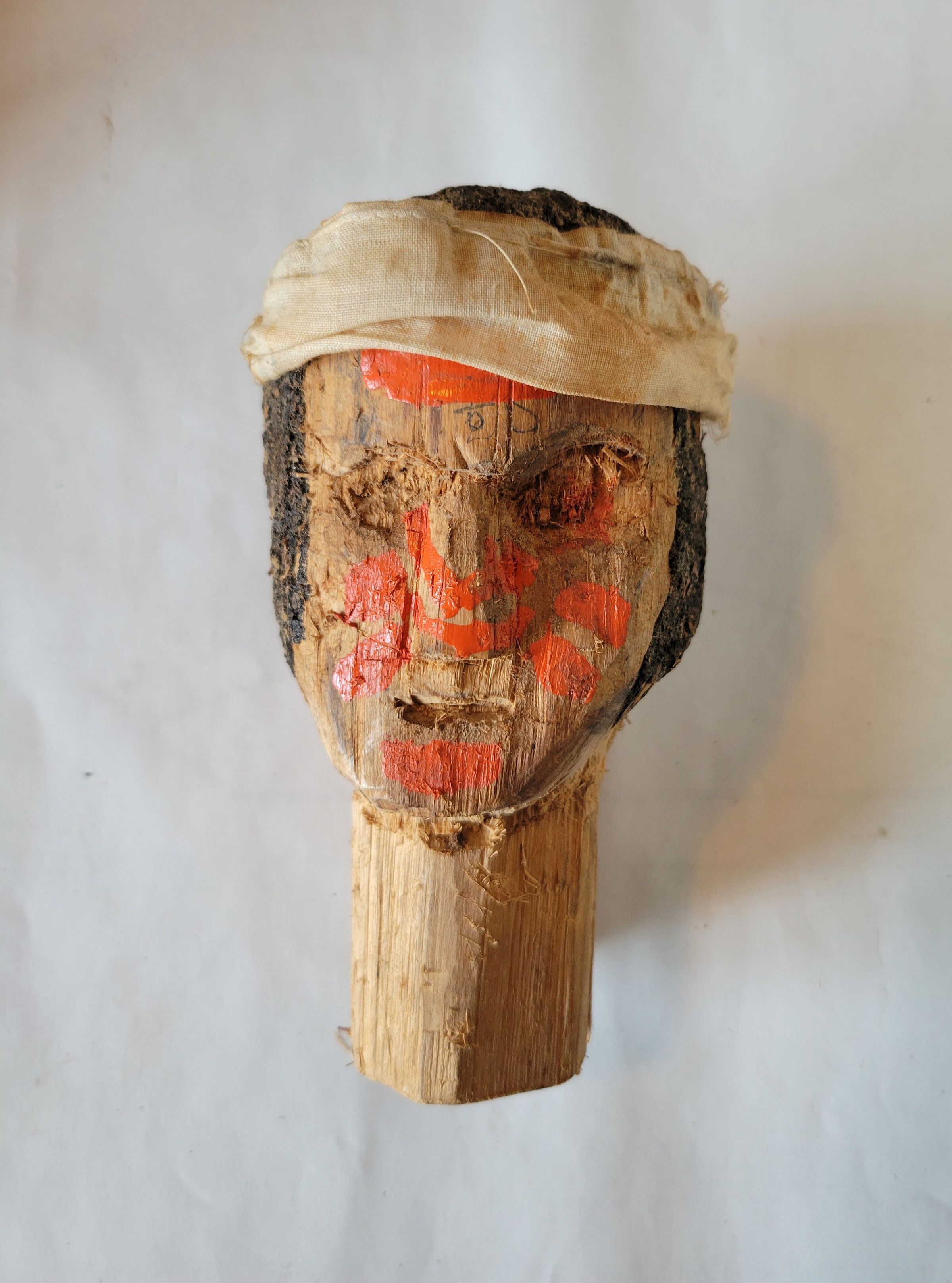 A roughly carved wooden head, about 8" long. It has dark brown painted hair, bright orange face paint, and a cloth wrapped around the top. It is split down the side and the base of the neck has a hole into which is wedged a wooden rod which has snapped off near the base of the neck.Collection