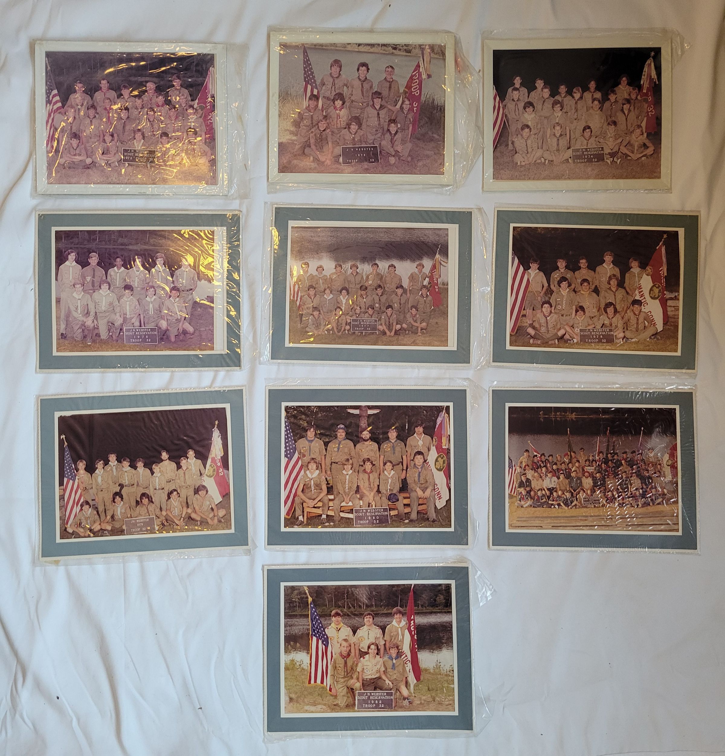 A collection of troop portraits for Boy Scout Troop 32 of Windham. There are portraits for the years 1972-1981 with the exception of 1975. The photographs show varying numbers of young boys in scout uniforms with black and white boards in front indicating the troop and year. The three earliest photos are matted in thin white mats which have yellowed somewhat over time, the rest are matted in thin light and medium blue mats. All are kept in plastic pockets.Collection