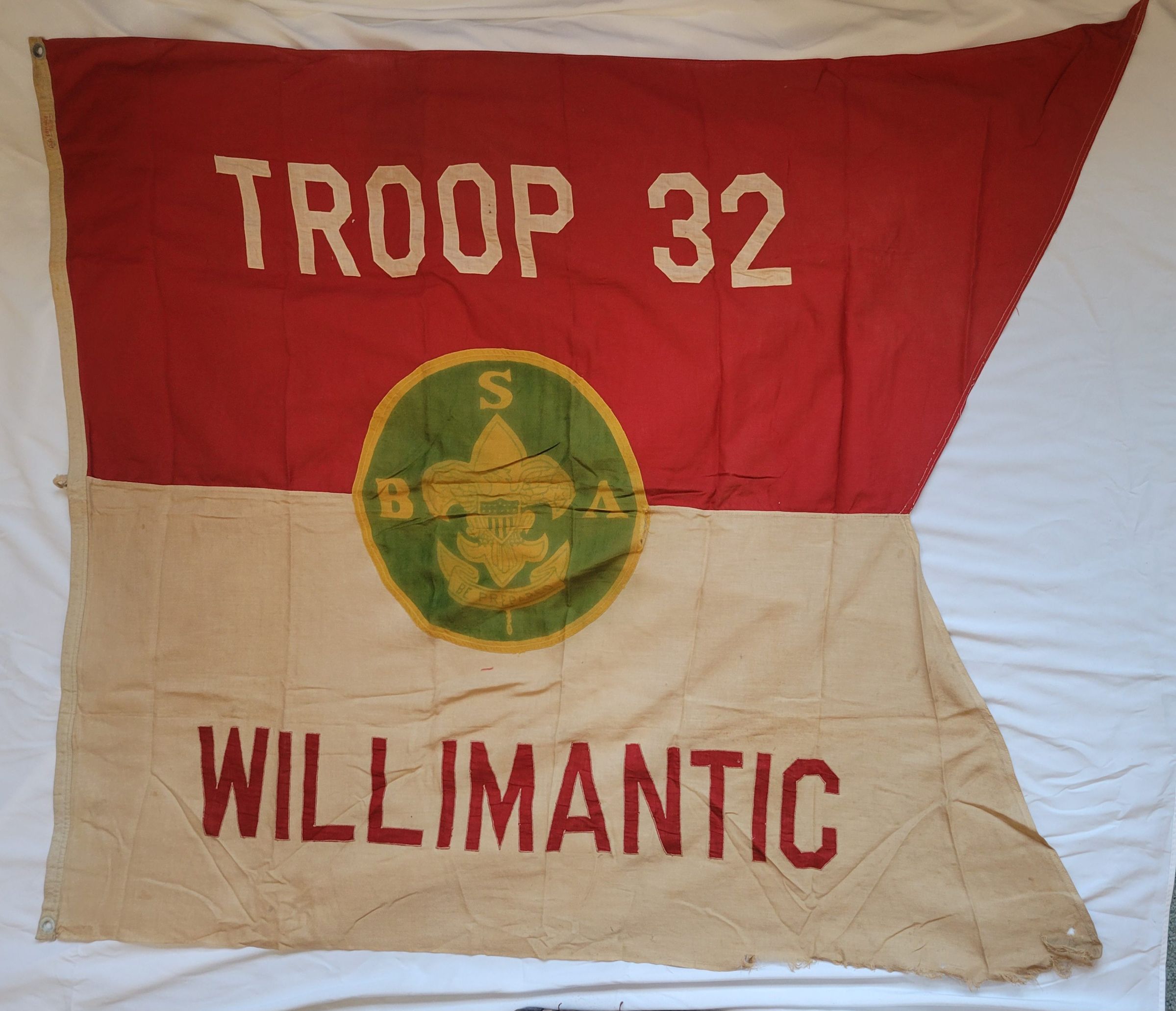 A large printed felt pennant for BSA Troop 32 of Willimantic. The flag features the BSA insignia in the center with "TROOP 32" in the top red half and "WILLIMANTIC" in the bottom beige half. It has three eyelets on the left side, at the top, center, and bottom, indicating it was likely meant to be hung from a flagpole. The bottom right corner of the banner has started to disintegrate but otherwise it is in good condition aside from some wrinkles.Collection