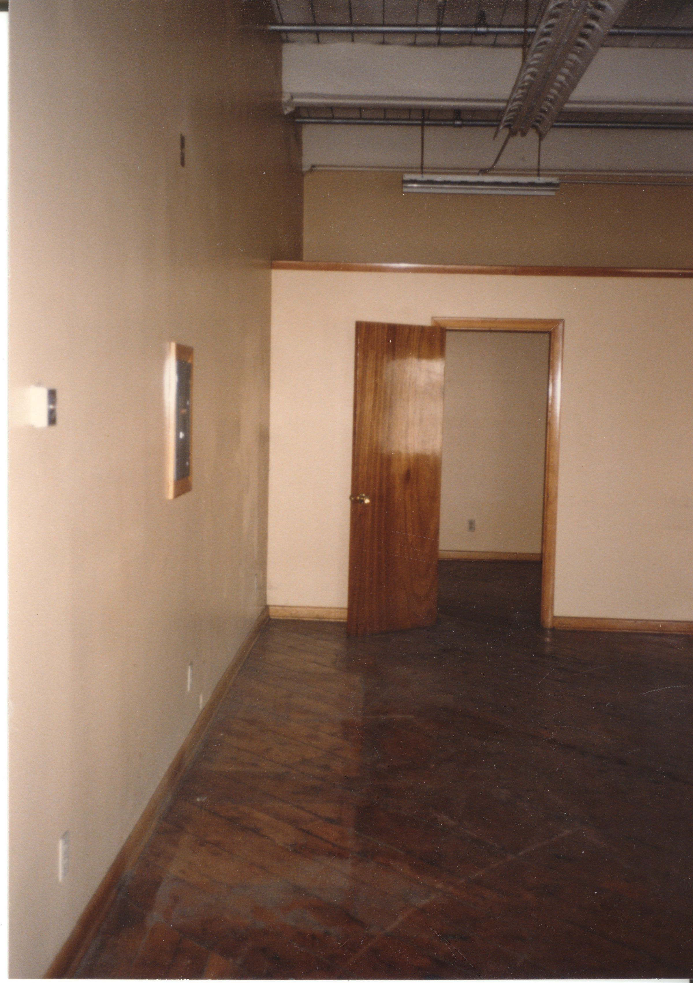 Color photographic print of the interior of Building 27, a.k.a. the Storehouse and Inspection Building, a granite structure that was also the east wing of Mill No. 2. Unknown photographer. Taken 1986, shortly after ATCO closed its Willimantic plant.Photograph Details