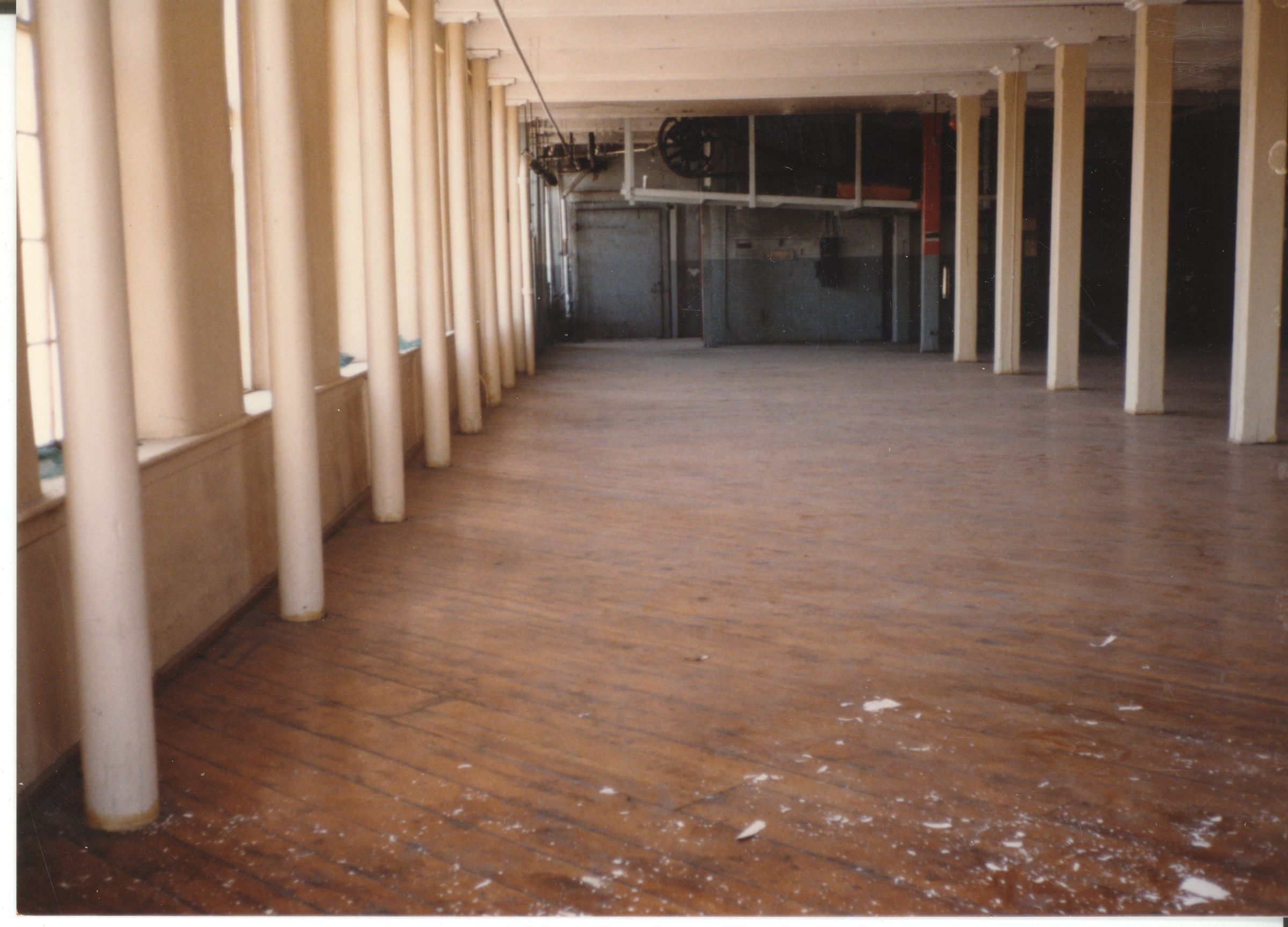 Color photographic print of the interior of Building 27, a.k.a. the Storehouse and Inspection Building, a granite structure that was also the east wing of Mill No. 2. Unknown photographer. Taken 1986, shortly after ATCO closed its Willimantic plant.Photograph Details