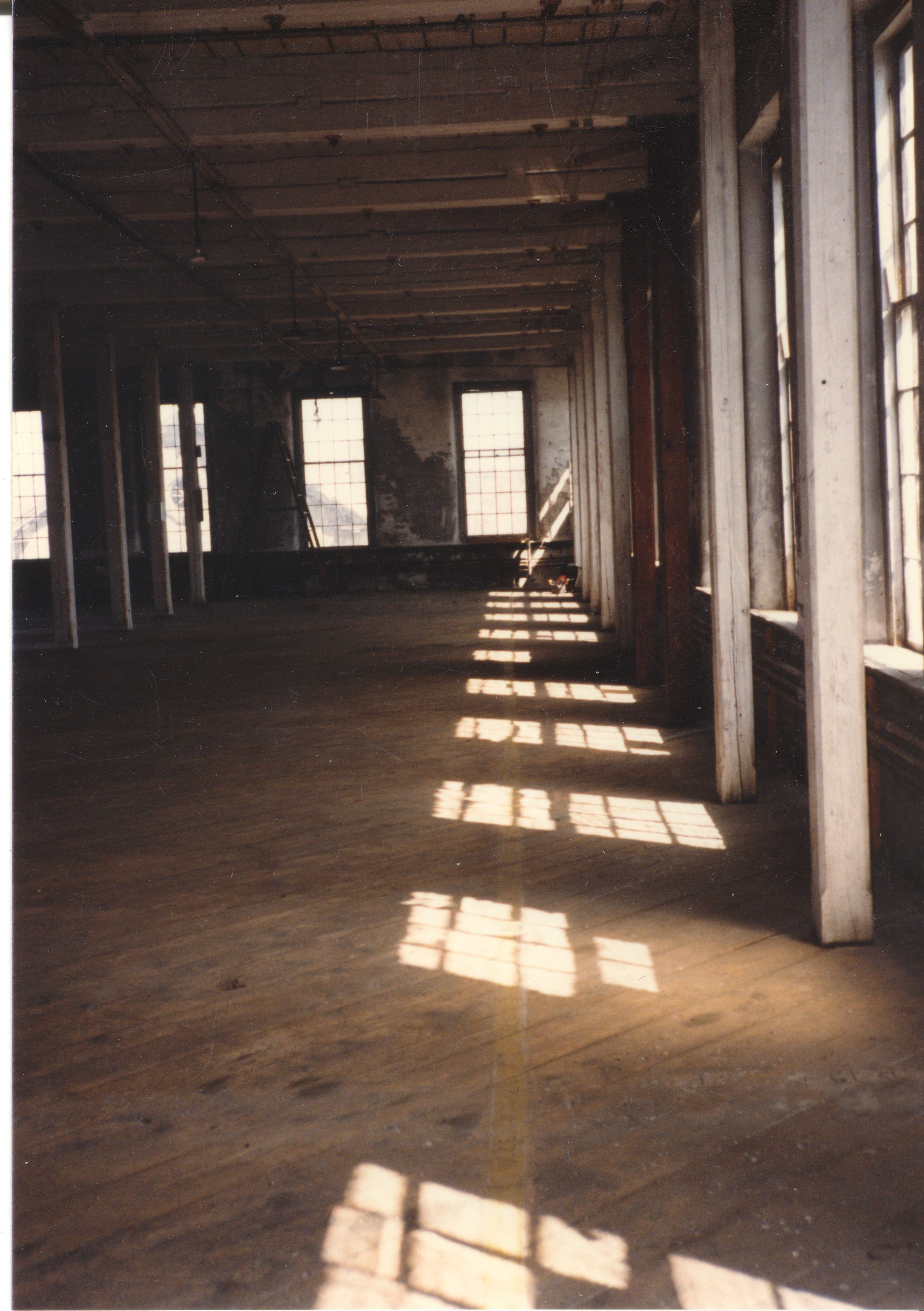 Color photographic print of the interior of Building 27, a.k.a. the Storehouse and Inspection Building, a granite structure that was also the east wing of Mill No. 2. Unknown photographer. Taken 1986, shortly after ATCO closed its Willimantic plant.Photograph Details