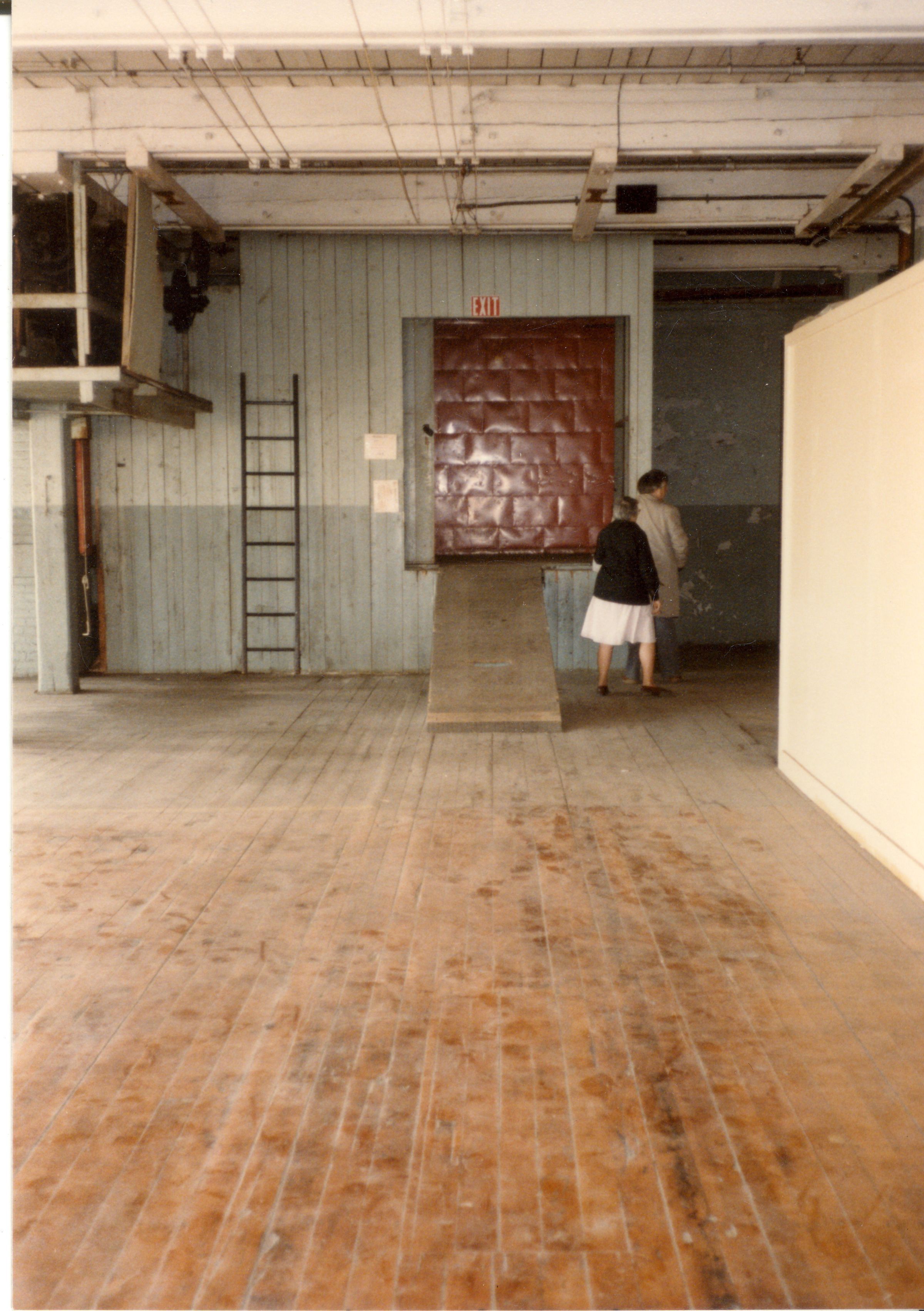 Color photographic print of the interior of Building 27, a.k.a. the Storehouse and Inspection Building, a granite structure that was also the east wing of Mill No. 2. Unknown photographer. Taken 1986, shortly after ATCO closed its Willimantic plant. One of the people in the photo is probably Laura Knott Twine, the founding Director of the Mill Museum.Photograph Details