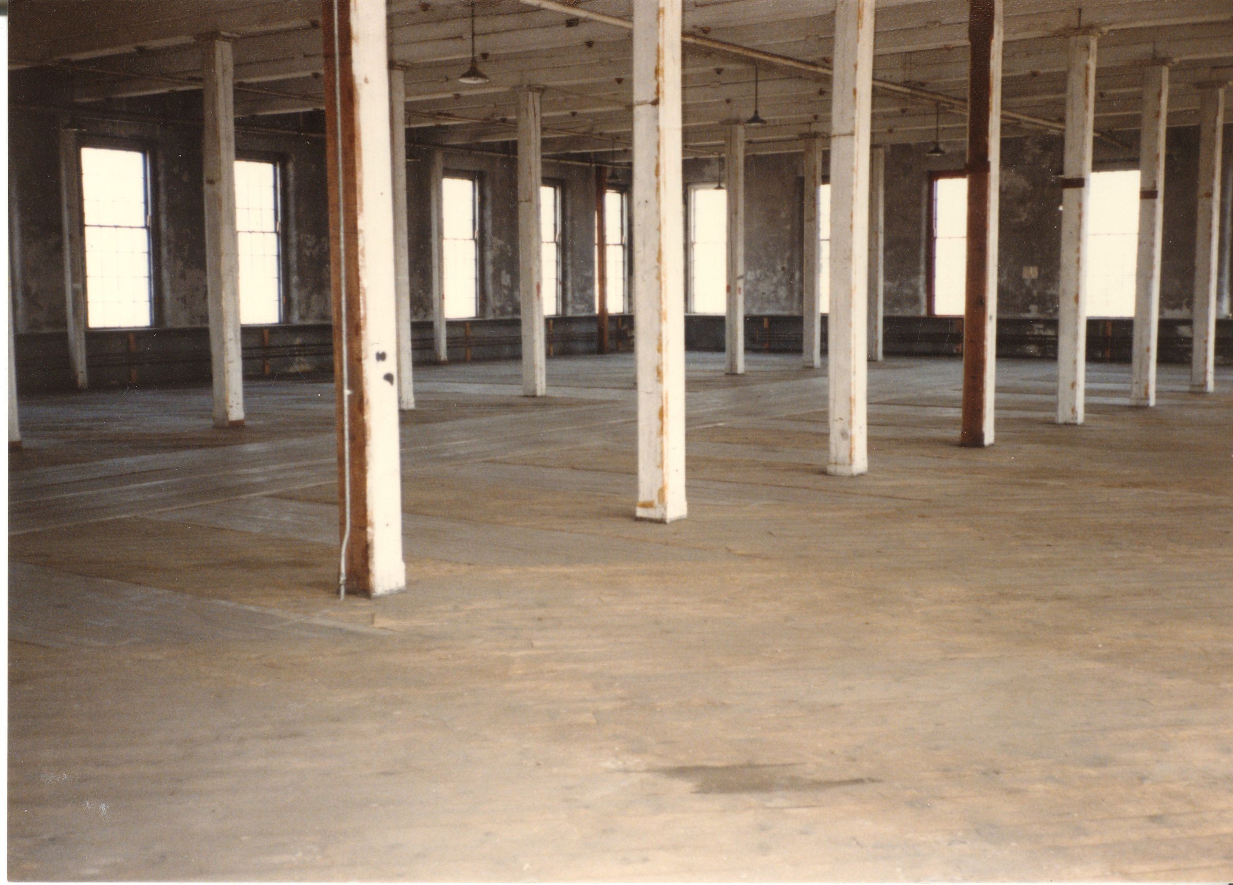 Color photographic print of the interior of Building 27, a.k.a. the Storehouse and Inspection Building, a granite structure that was also the east wing of Mill No. 2. Unknown photographer. Taken 1986, shortly after ATCO closed its Willimantic plant.Photograph Details
