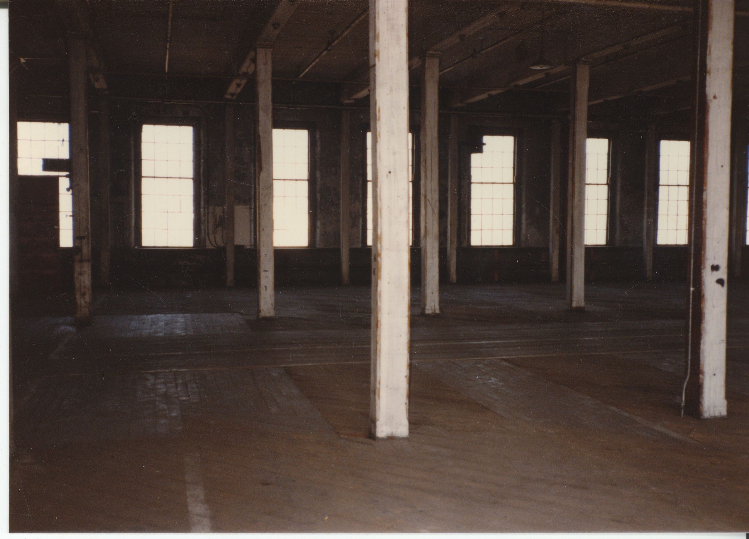 Color photographic print of the interior of Building 27, a.k.a. the Storehouse and Inspection Building, a granite structure that was also the east wing of Mill No. 2. Unknown photographer. Taken 1986, shortly after ATCO closed its Willimantic plant.Photograph Details