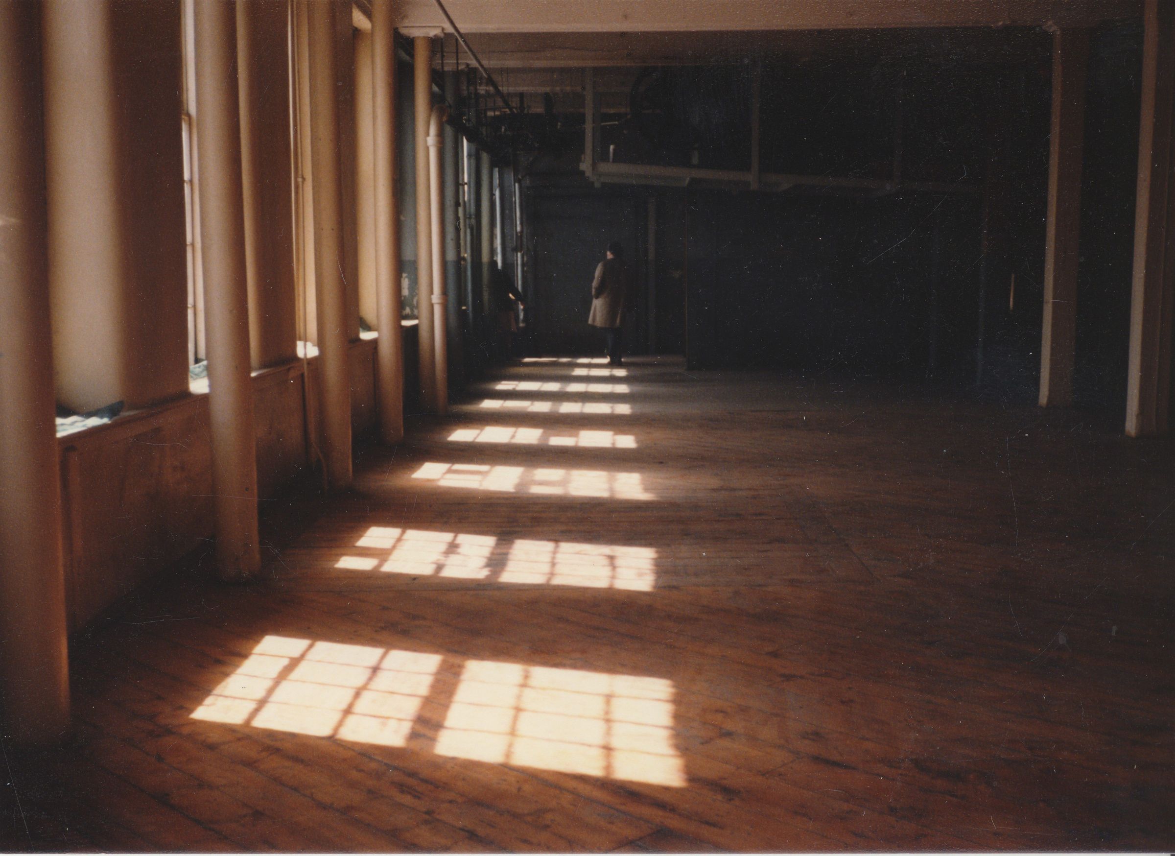 Color photographic print of the interior of Building 27, a.k.a. the Storehouse and Inspection Building, a granite structure that was also the east wing of Mill No. 2. Unknown photographer. Taken 1986, shortly after ATCO closed its Willimantic plant.Photograph Details