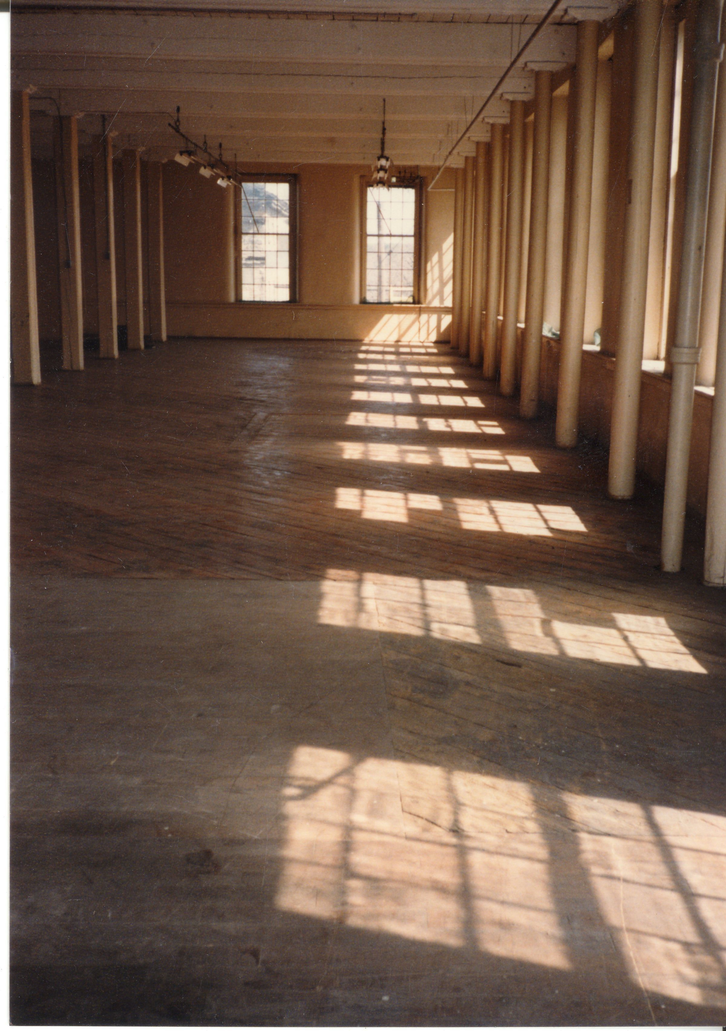 Color photographic print of the interior of Building 27, a.k.a. the Storehouse and Inspection Building, a granite structure that was also the east wing of Mill No. 2. Unknown photographer. Taken 1986, shortly after ATCO closed its Willimantic plant.Photograph Details