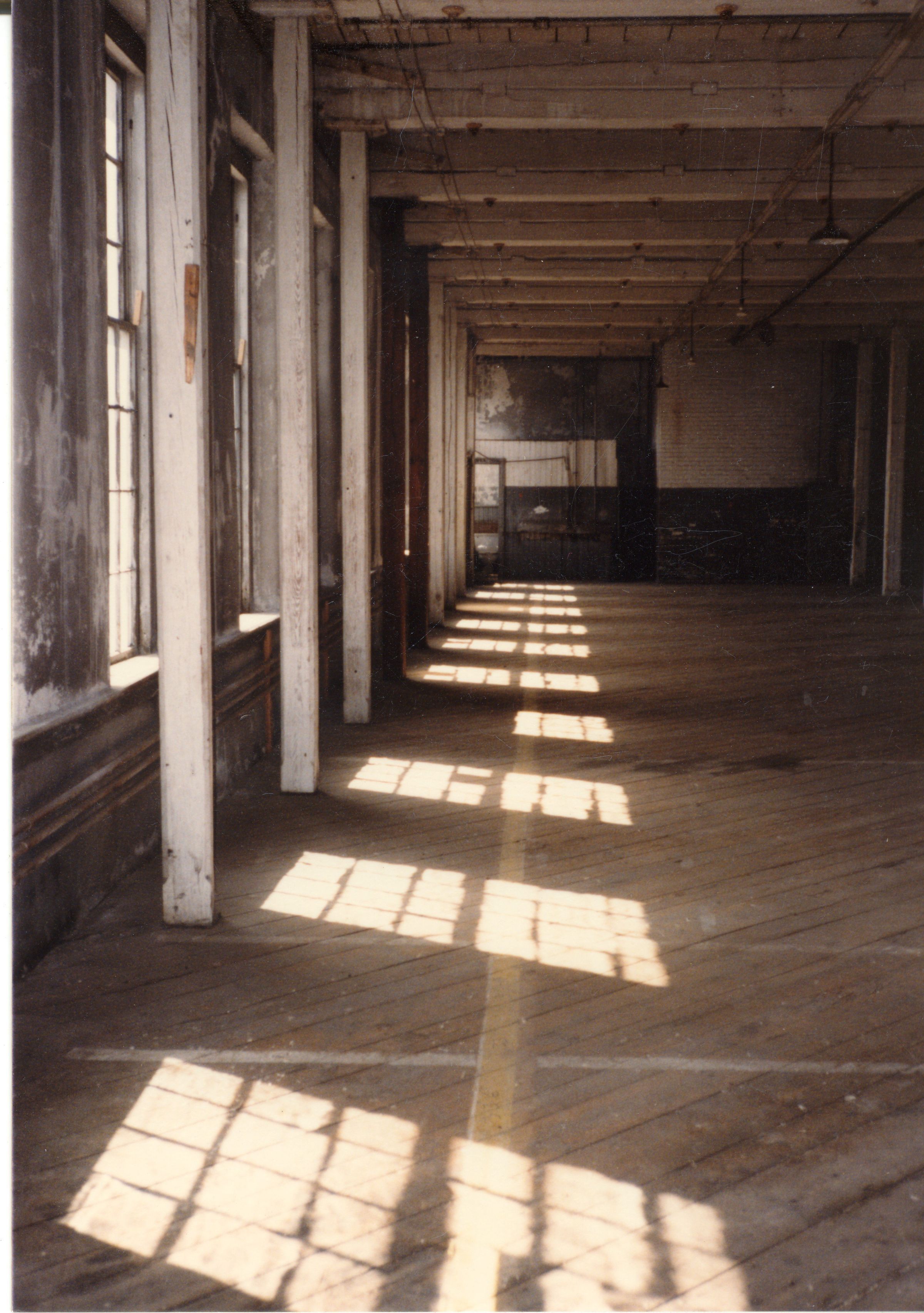 Color photographic print of the interior of Building 27, a.k.a. the Storehouse and Inspection Building, a granite structure that was also the east wing of Mill No. 2. Unknown photographer. Taken 1986, shortly after ATCO closed its Willimantic plant.Photograph Details