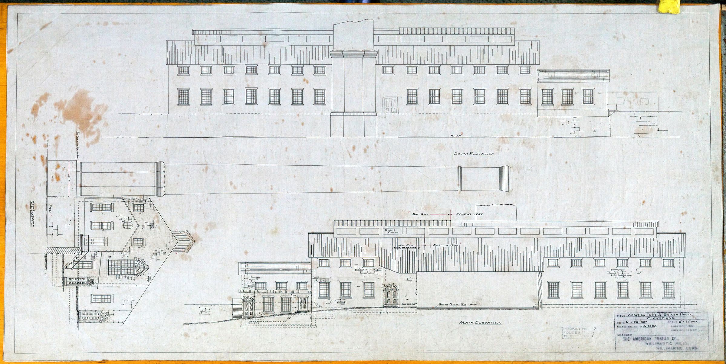 Architectural plan showing addition to Mill Number 2 boiler house, American Thread Company, Willimantic Mills, Willimantic, CT. Elevations. Scale: 1/8 in. = 1 ft. Digital photo for the Mill Museum by Harrison Judd.Collection
