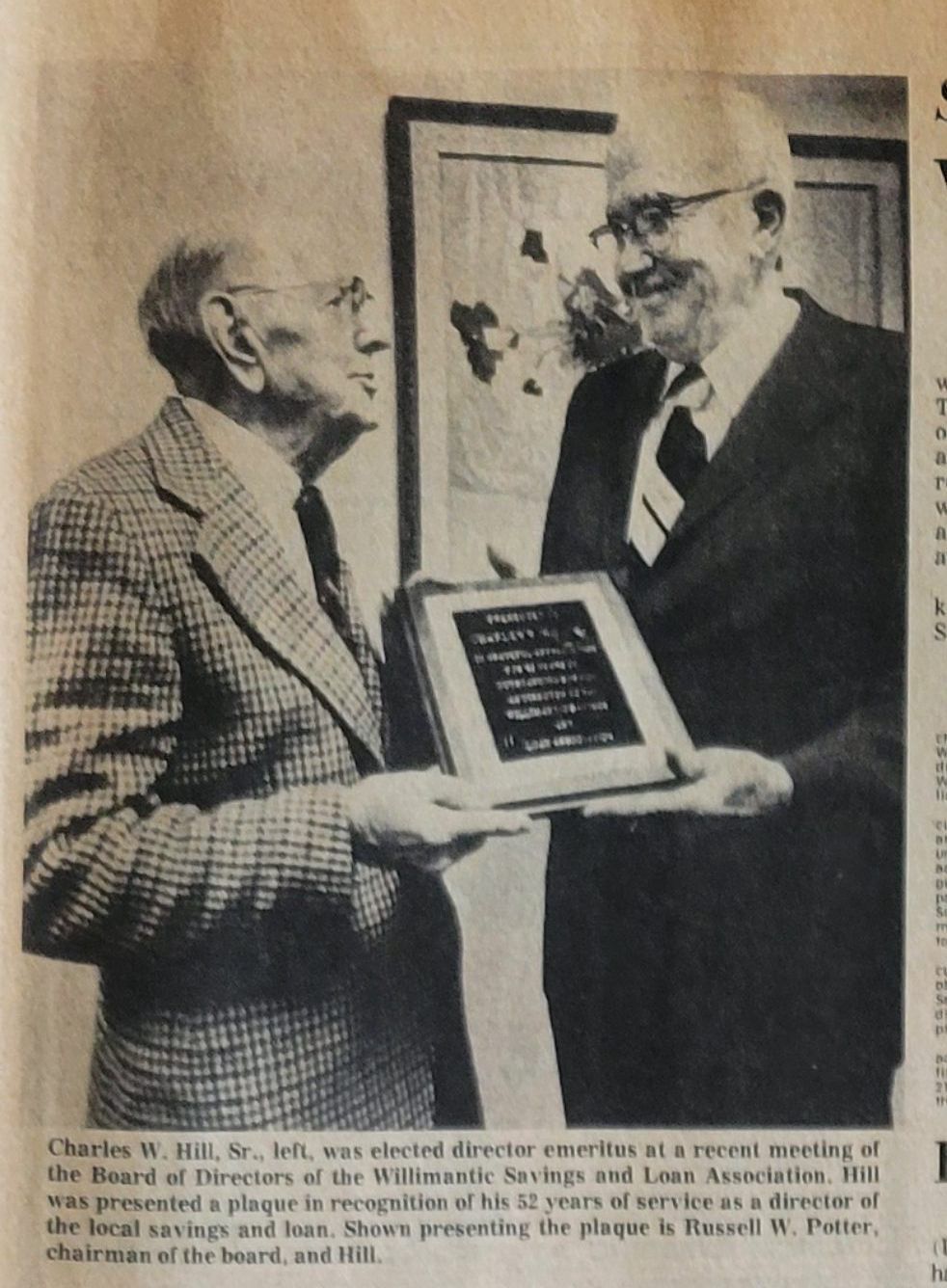 Page 9 of The Chronicle out of Willimantic, CT featuring a captioned photograph of Charles W. Hill Sr. receiving a plaque from Russell W. Potter, chairman of the Board of Directors of the Willimantic Savings and Loan Association, for Hill's 52 years of service. Newspaper published Wednesday, January 28, 1981.Collection
