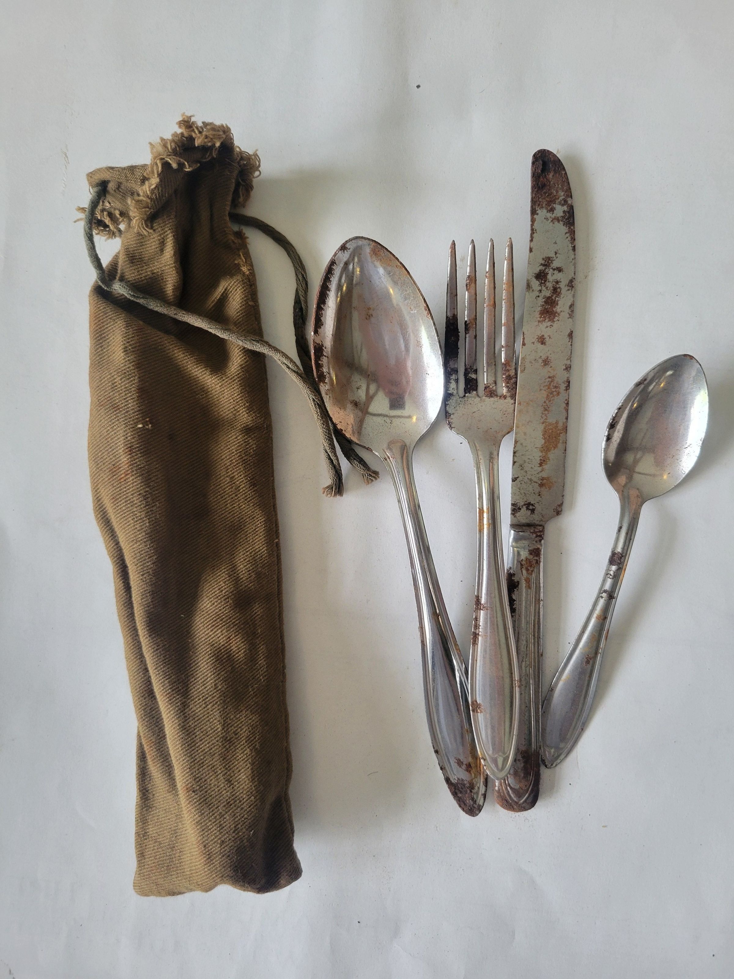 Metal eating utensils, namely a teaspoon, tablespoon, fork, and butter knife, in a thin canvas bag with rolled canvas tie. The utensils are rusted all over and the top edges of the bag are frayed. There is also a hole in the fabric at the top of the bag where the knife had pushed through. A kit like this would likely have been used for camping.Collection