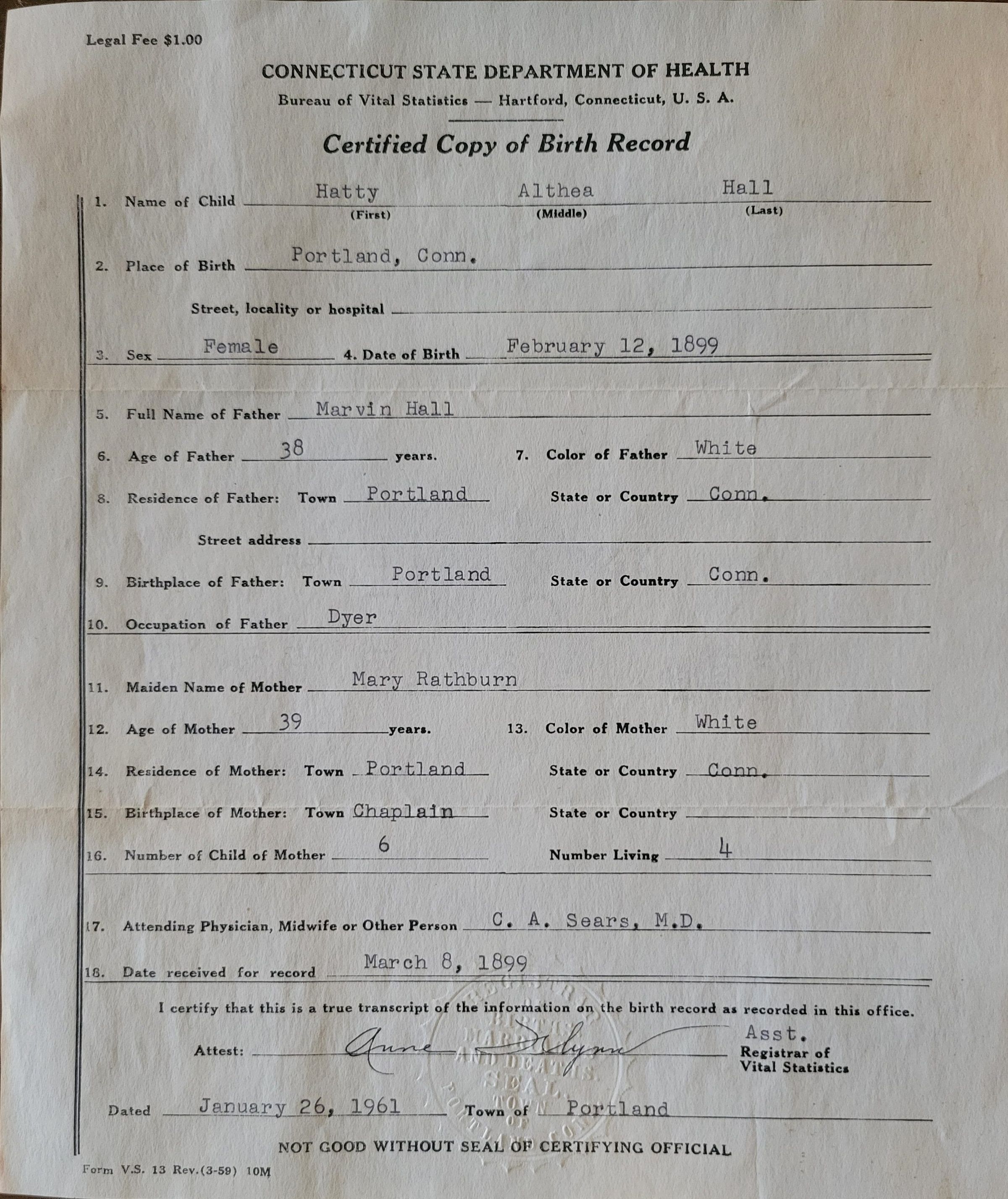 A certified copy of the birth certificate for Hatty Althea Hall. Date of birth February 12, 1899, copy dated January 6, 1961. The certificate is signed by the assistant registrar of vital records of Portland, CT, and is embossed with the seal of the Town of Portland Births Marriages and Deaths department.Collection