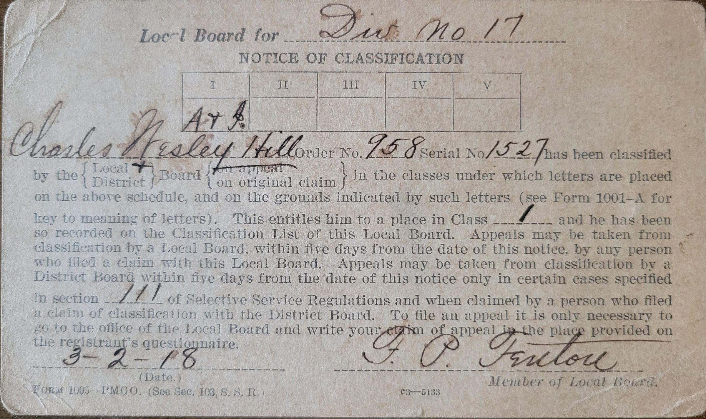 A card sent to Charles W. Hill from the War Department's Local Board for District 17 notifying him of his A-1 classification. This classification indicated that he was liable to be drafted. The card is dated as well as postmarked March 2, 1918.Collection