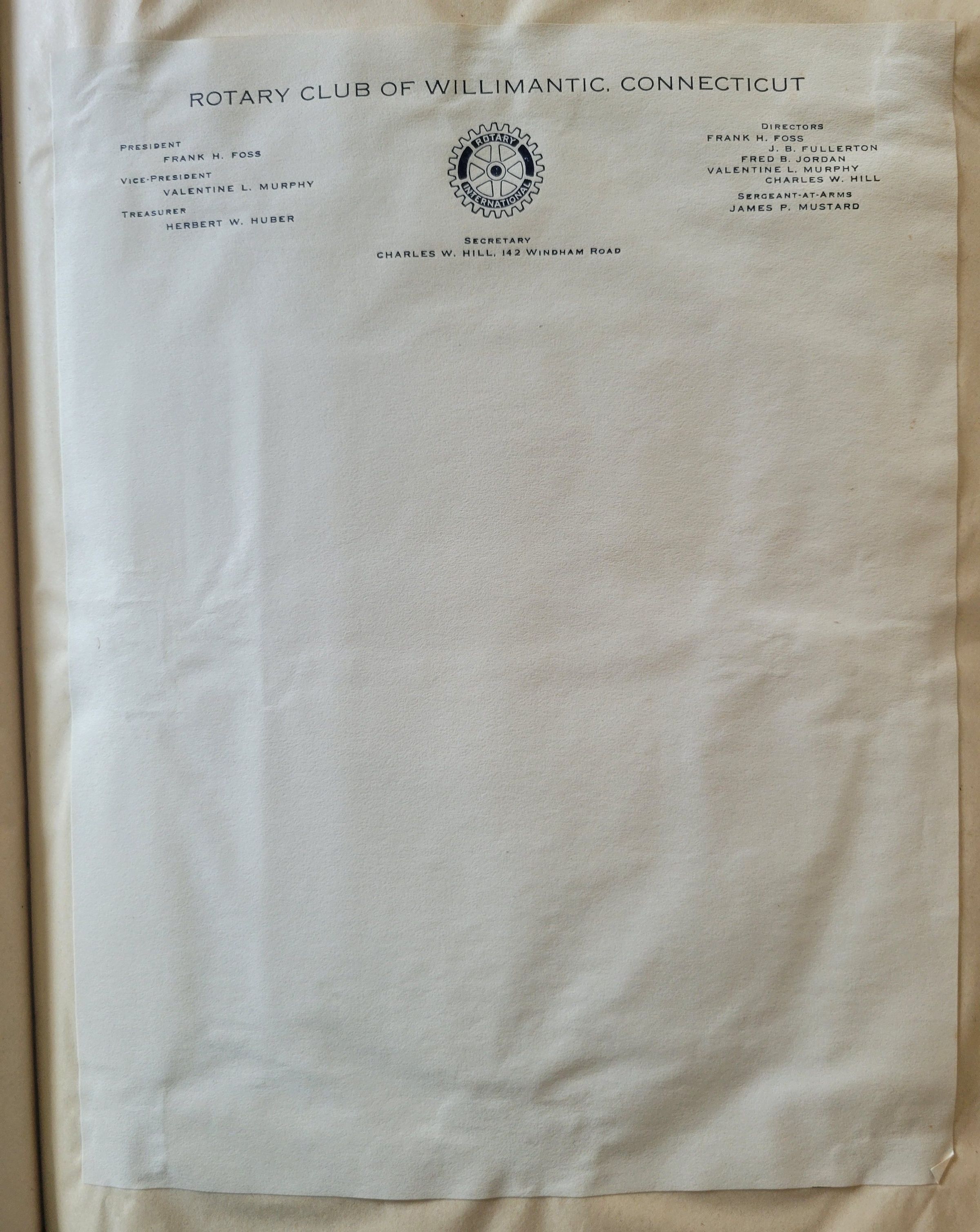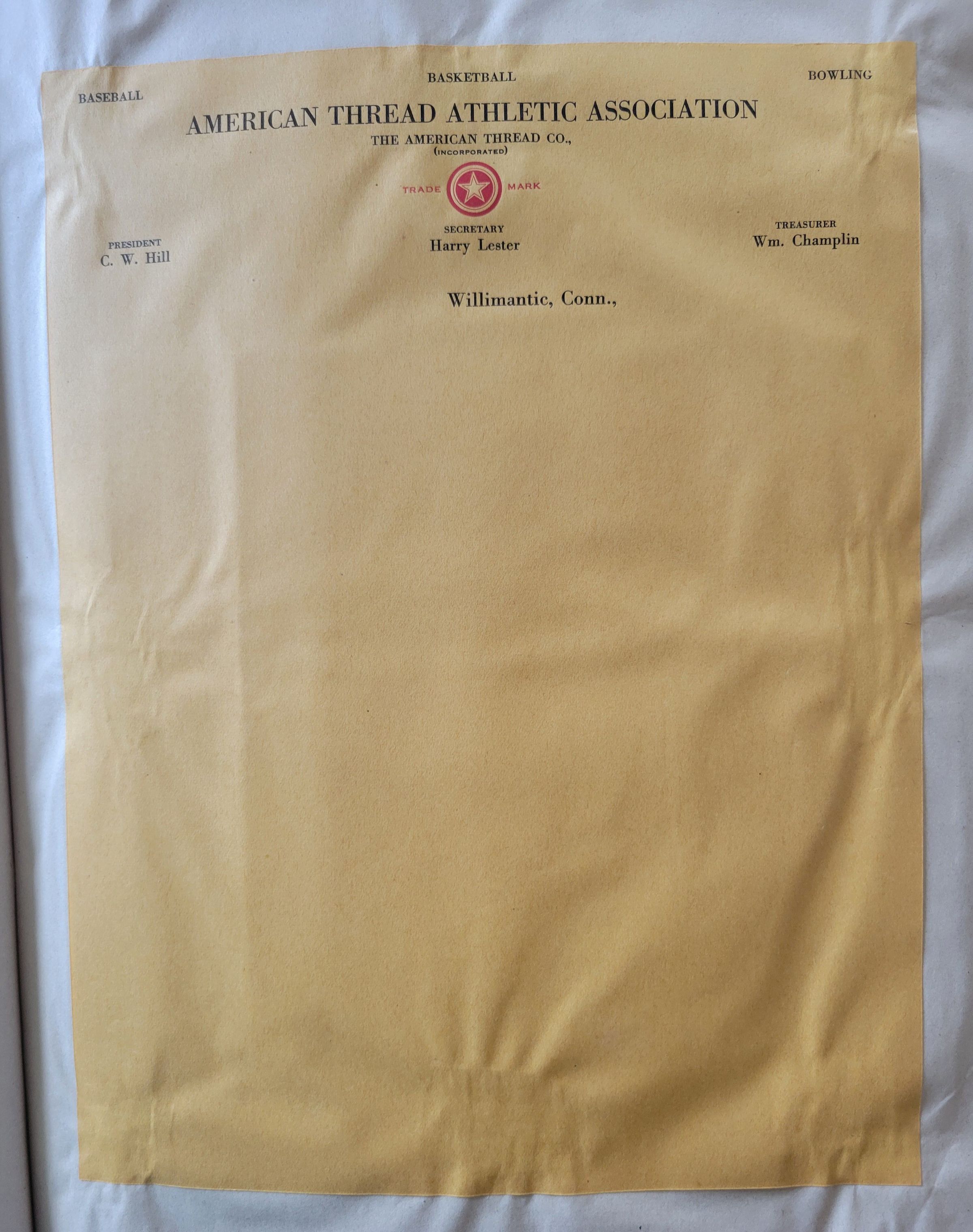 Three samples of blank letterhead from positions held by Charles W. Hill as president of the American Thread Co. Athletic Association, President of the Willimantic Chamber of Commerce, and secretary of the Rotary Club of Willimantic.Collection