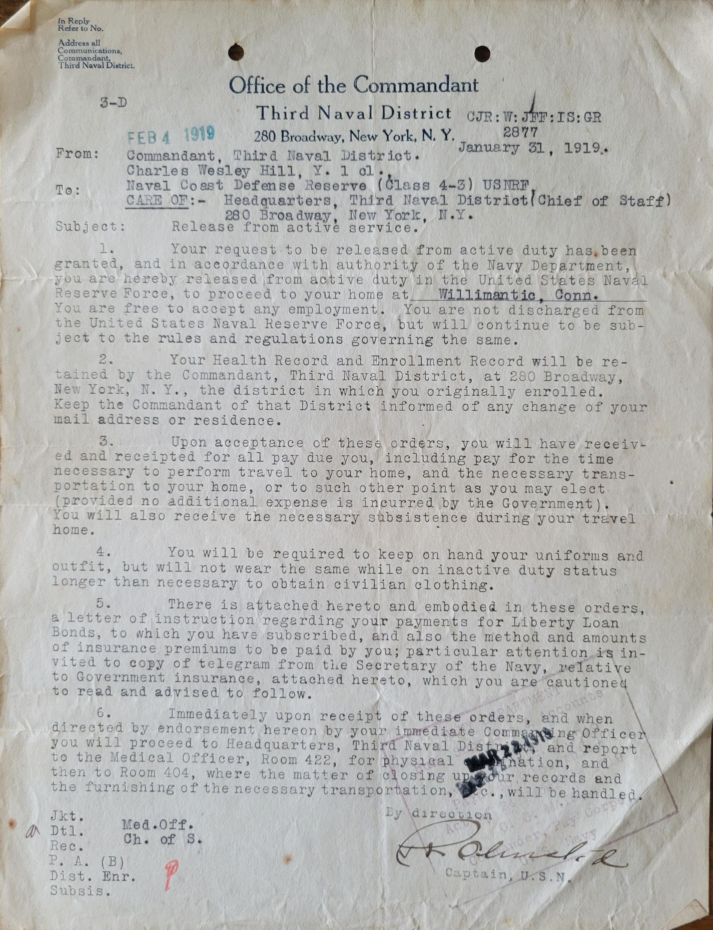 A notice of release from active duty in the Naval reserves from the Office of the Commandant to Charles W. Hill who requested the release after World War 1. The document is dated January 31, 1919 and outlines Hill's next steps, including returning home to Willimantic, CT. There is a blue stamp at the top left for FEB 4 1919 and a black stamp at the bottom right for MAR 22 1919. The page is signed by a Captain of the U.S. Navy.Collection
