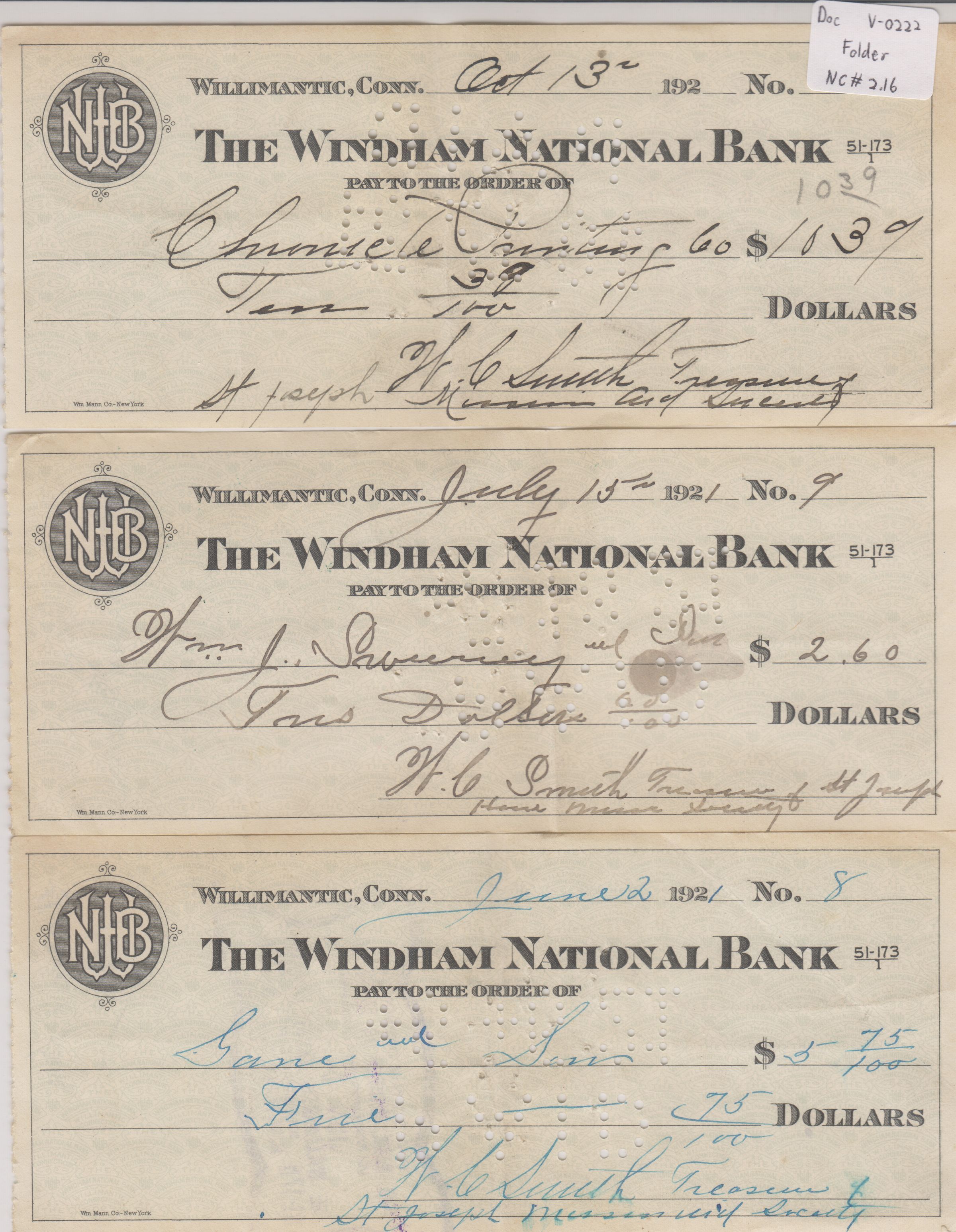 Three checks, drawn on the Windham National Bank of Willimantic, CT. All three signed by W[illiam] C. Smith, Treasurer of St. Joseph Mission Society. Check no. [10?] dated Oct. 13 [1921?] and made out to Chronicle Printing Co. for $10.39. Check no. 9 dated July 15 2, 1921 and made out to Wm. J. Sweeney for $2.60. Check no. 8 dated June 2, 1921 and made out to Lane and Son for $5.75.Collection