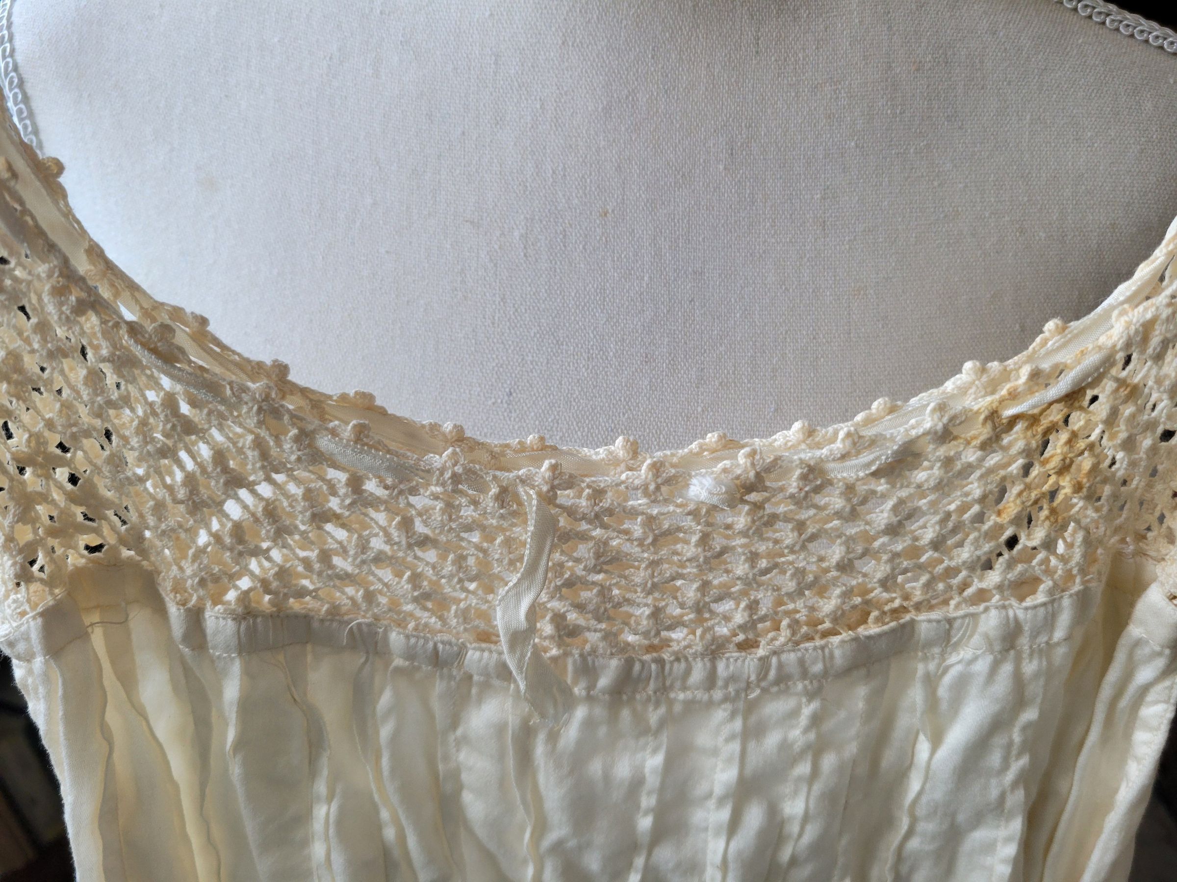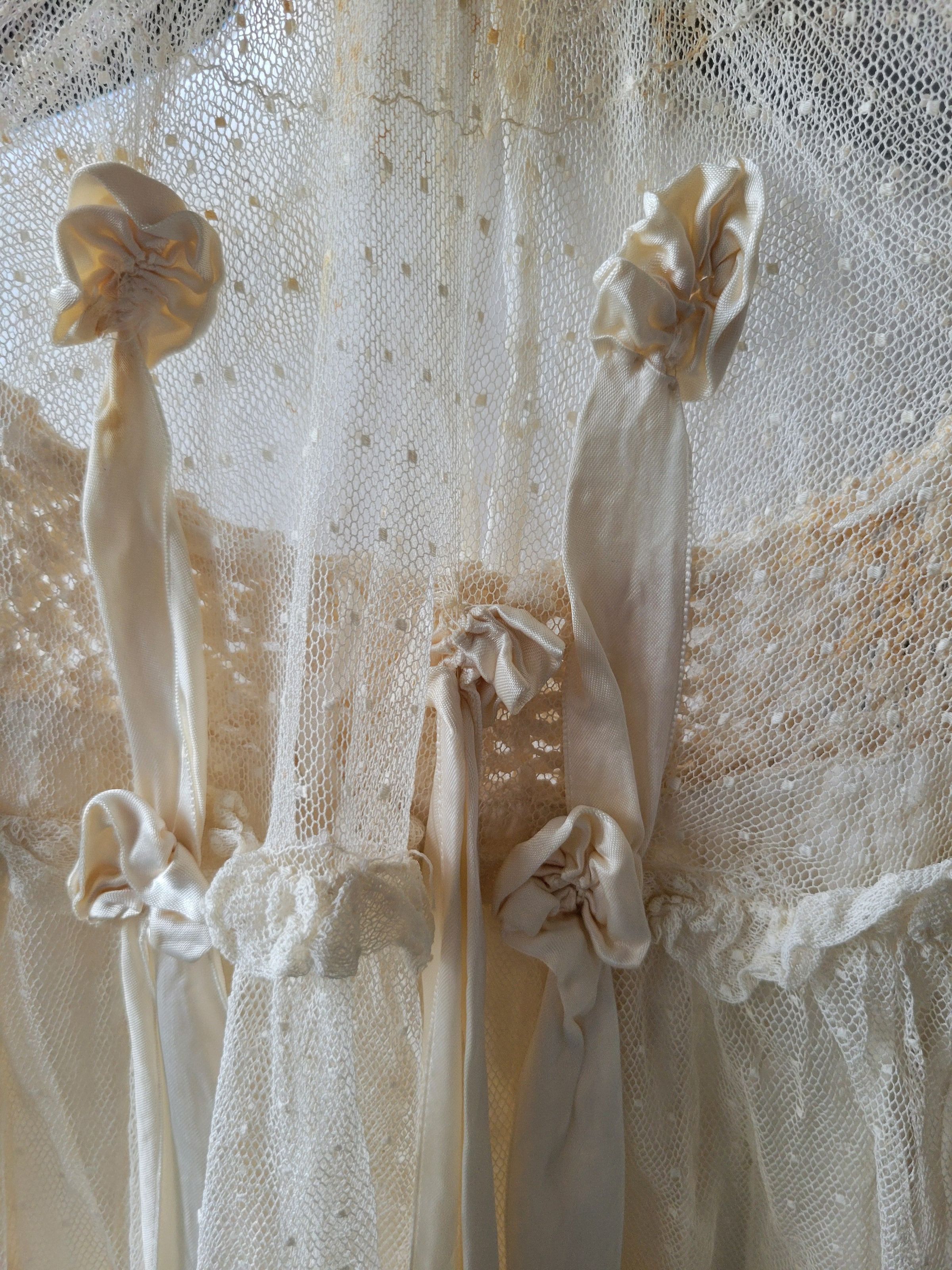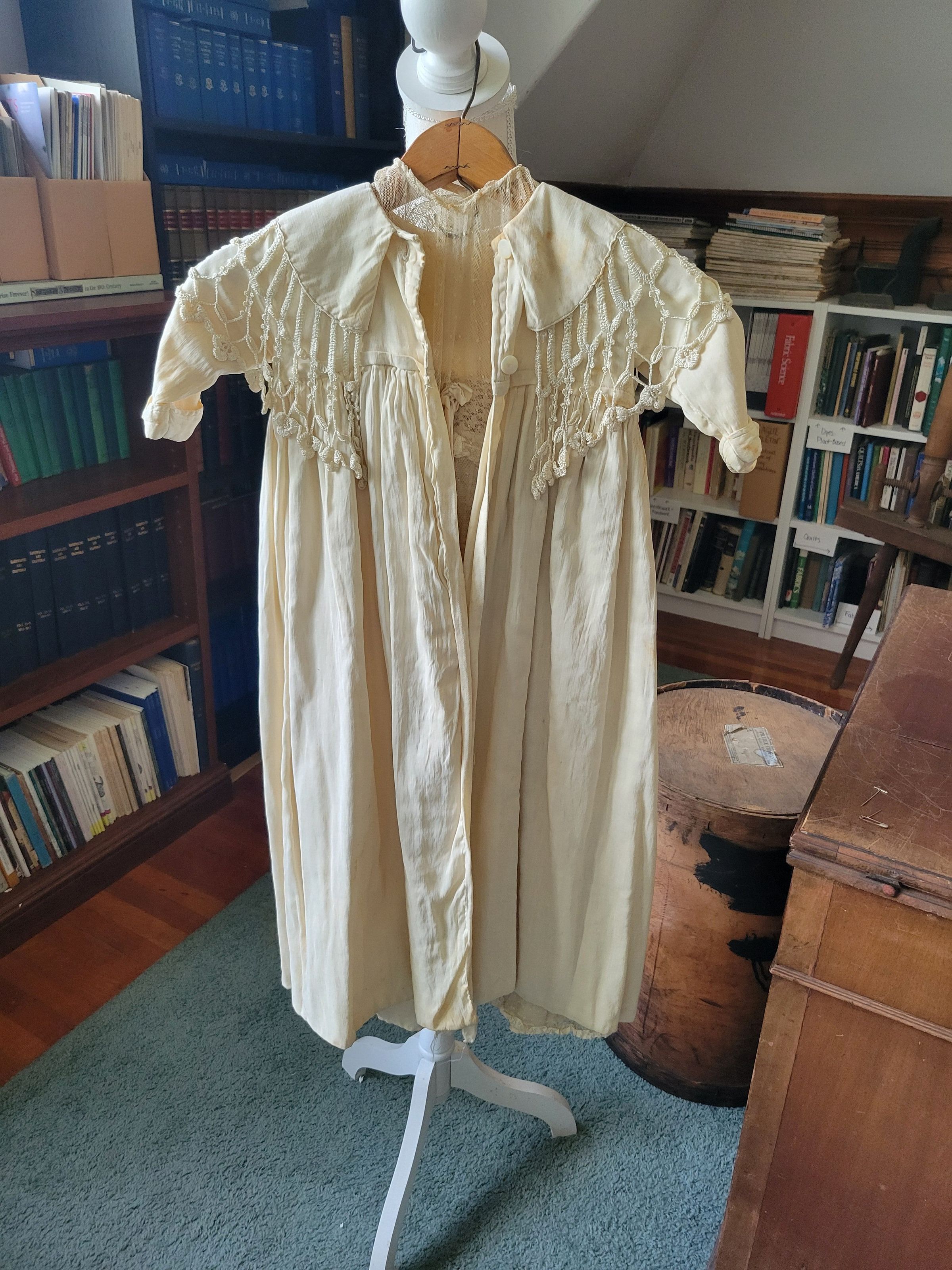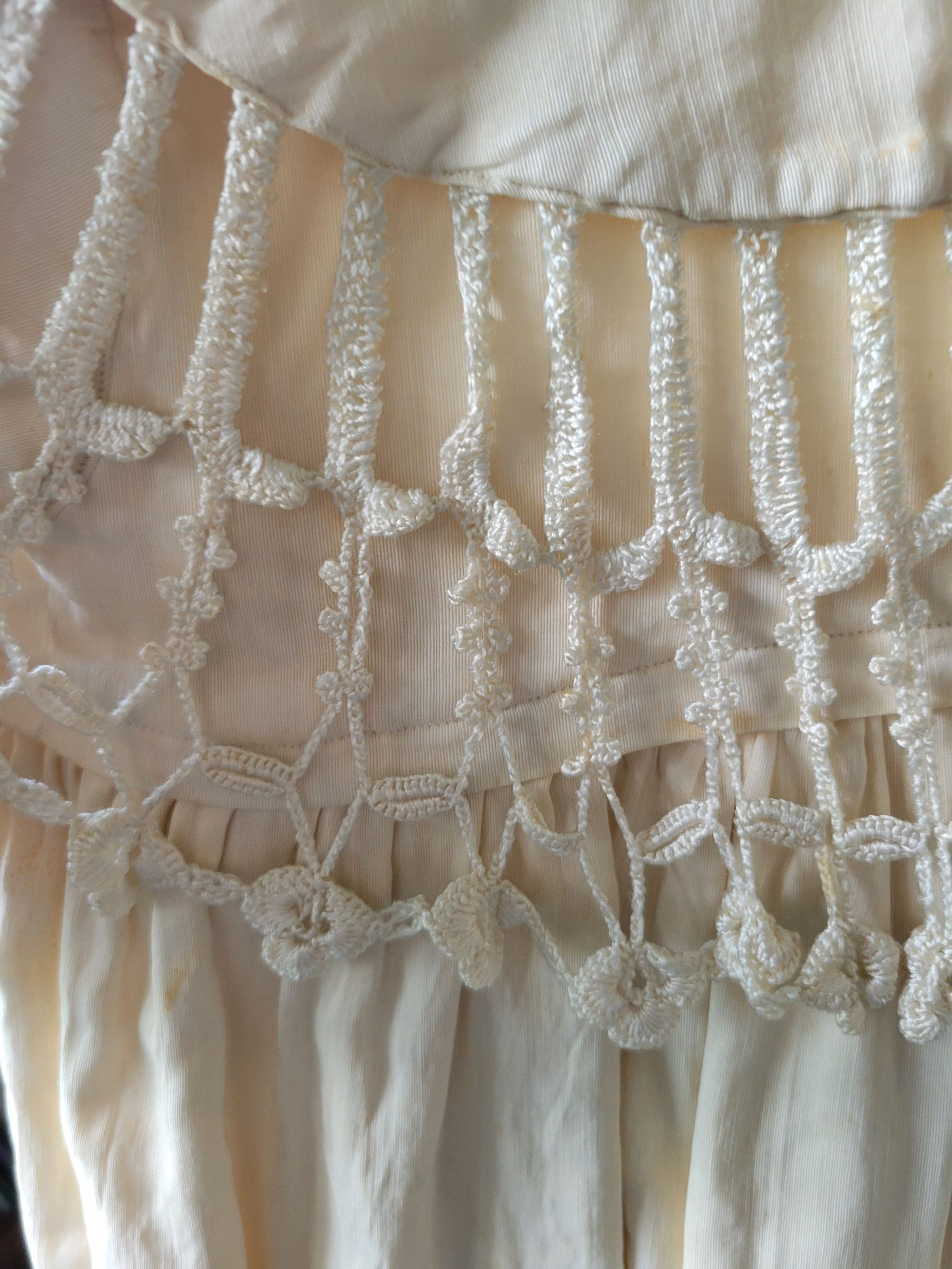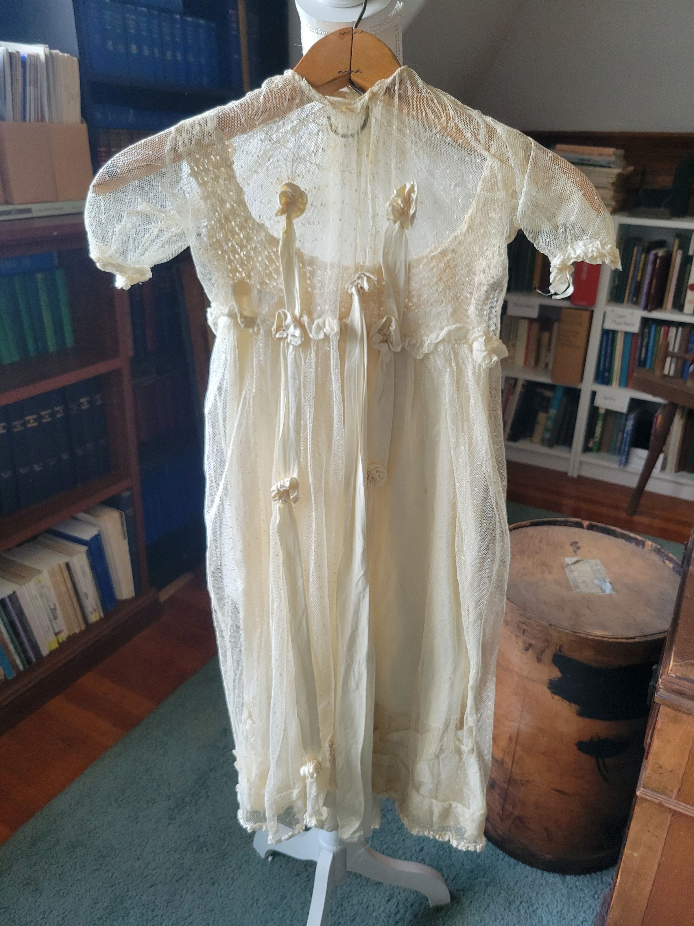 Christening gown for Camilla Krzyzewski made by her godmother Katherine Gilmartin. The outfit includes a slip with a crocheted top, a dress which is sheer with polka dots and ribbons, and a coat embellished with crochet flowers. It also includes a crocheted cap. The entire outfit was originally white but has yellowed with age.