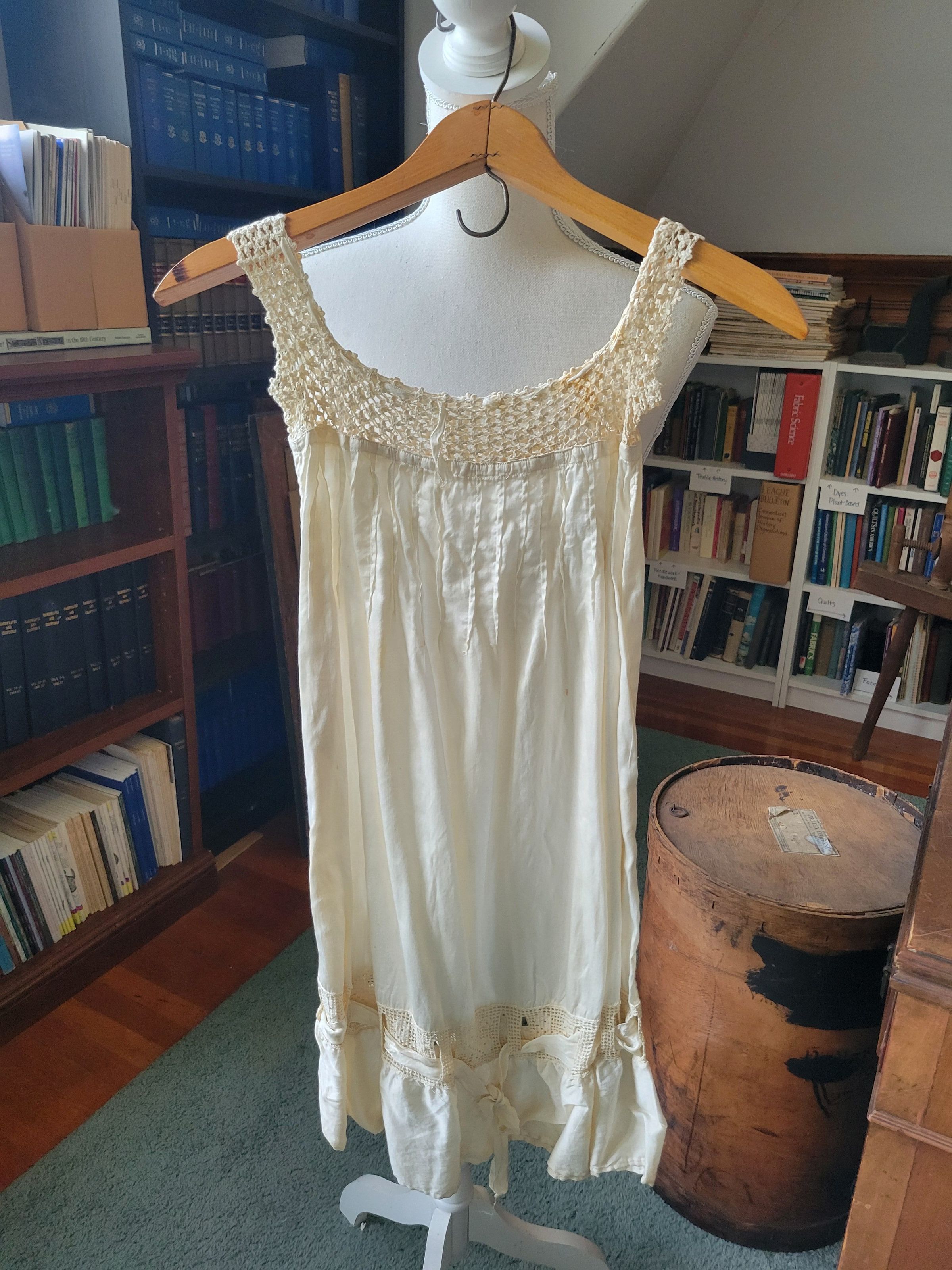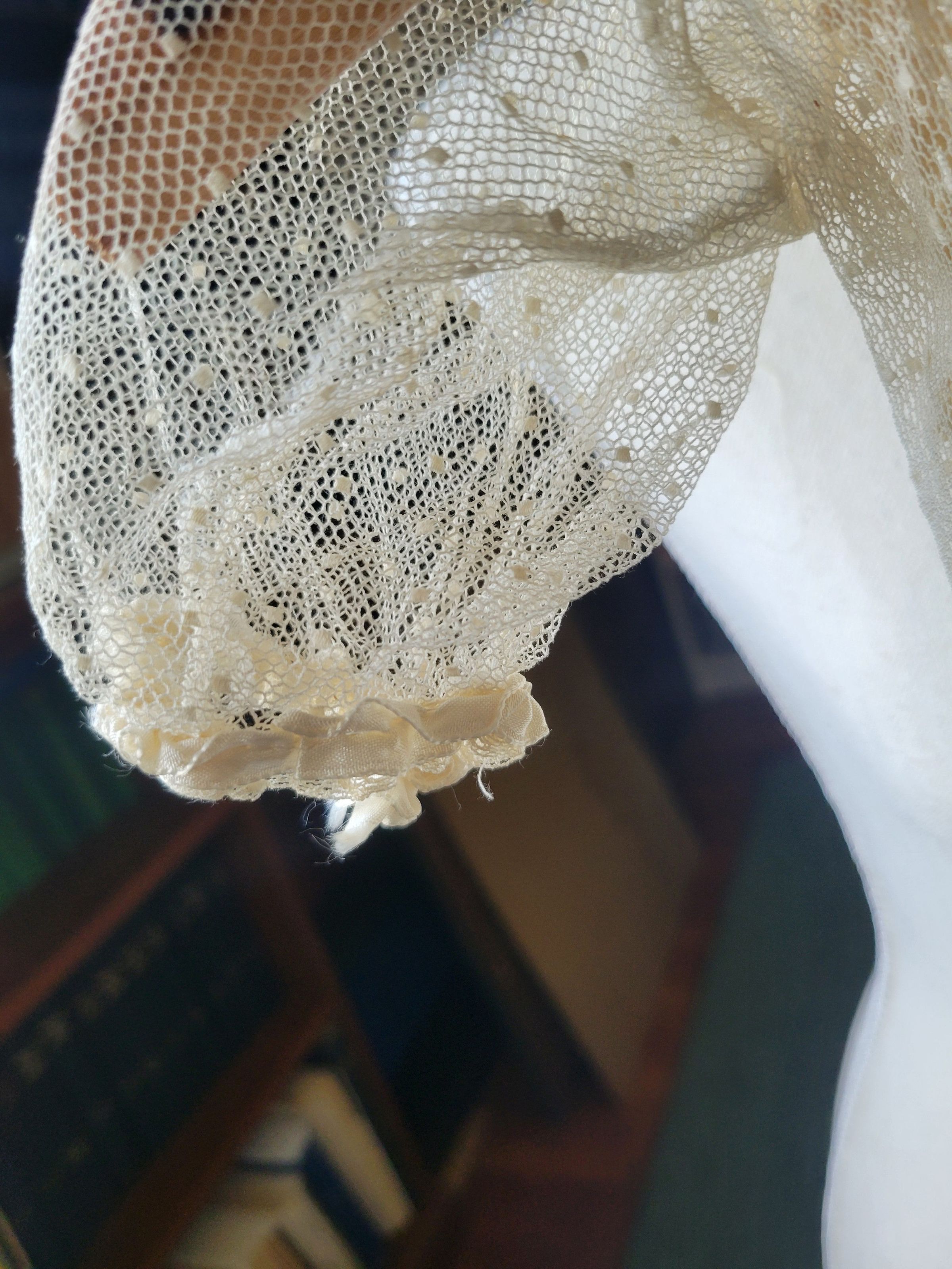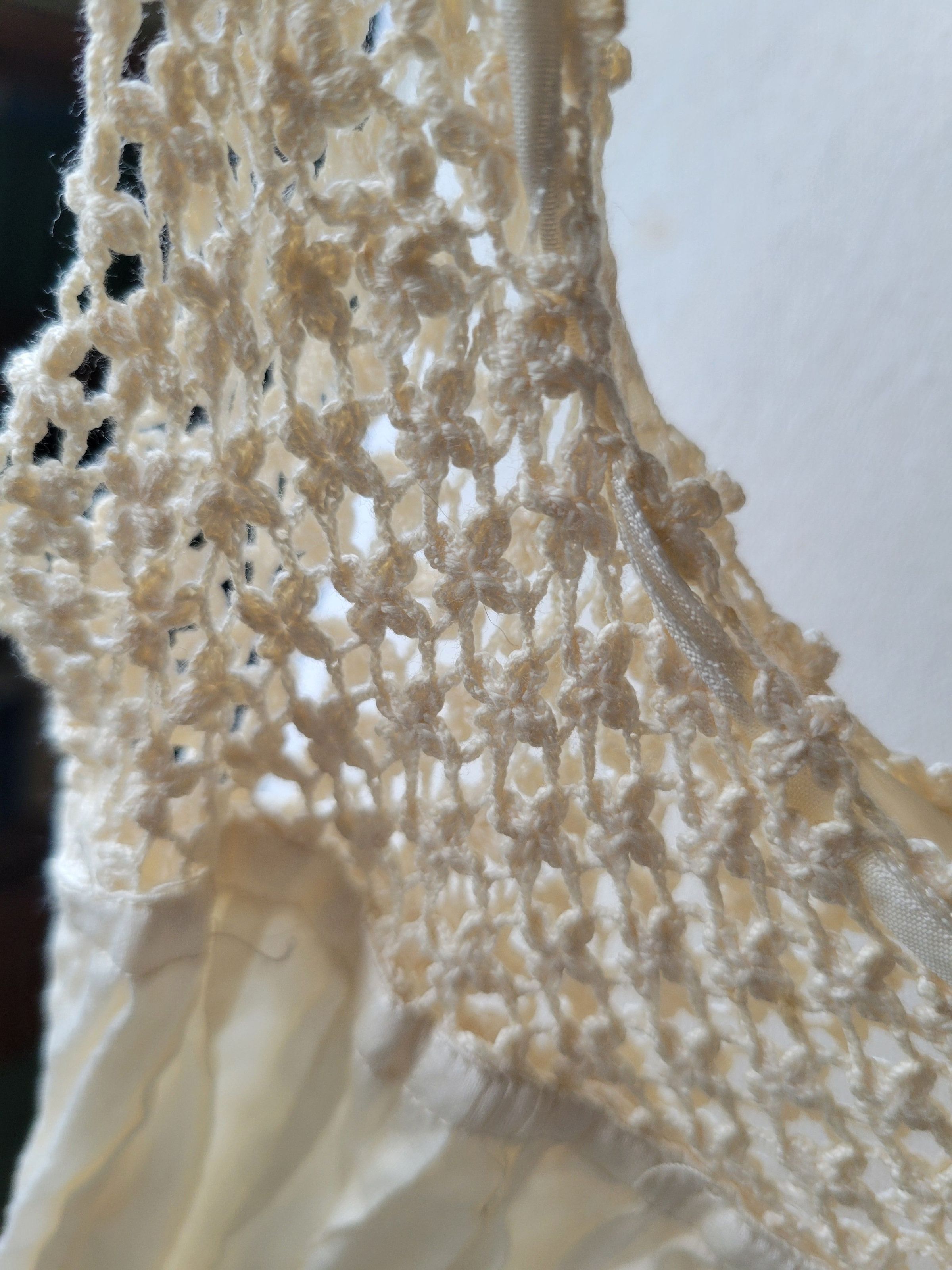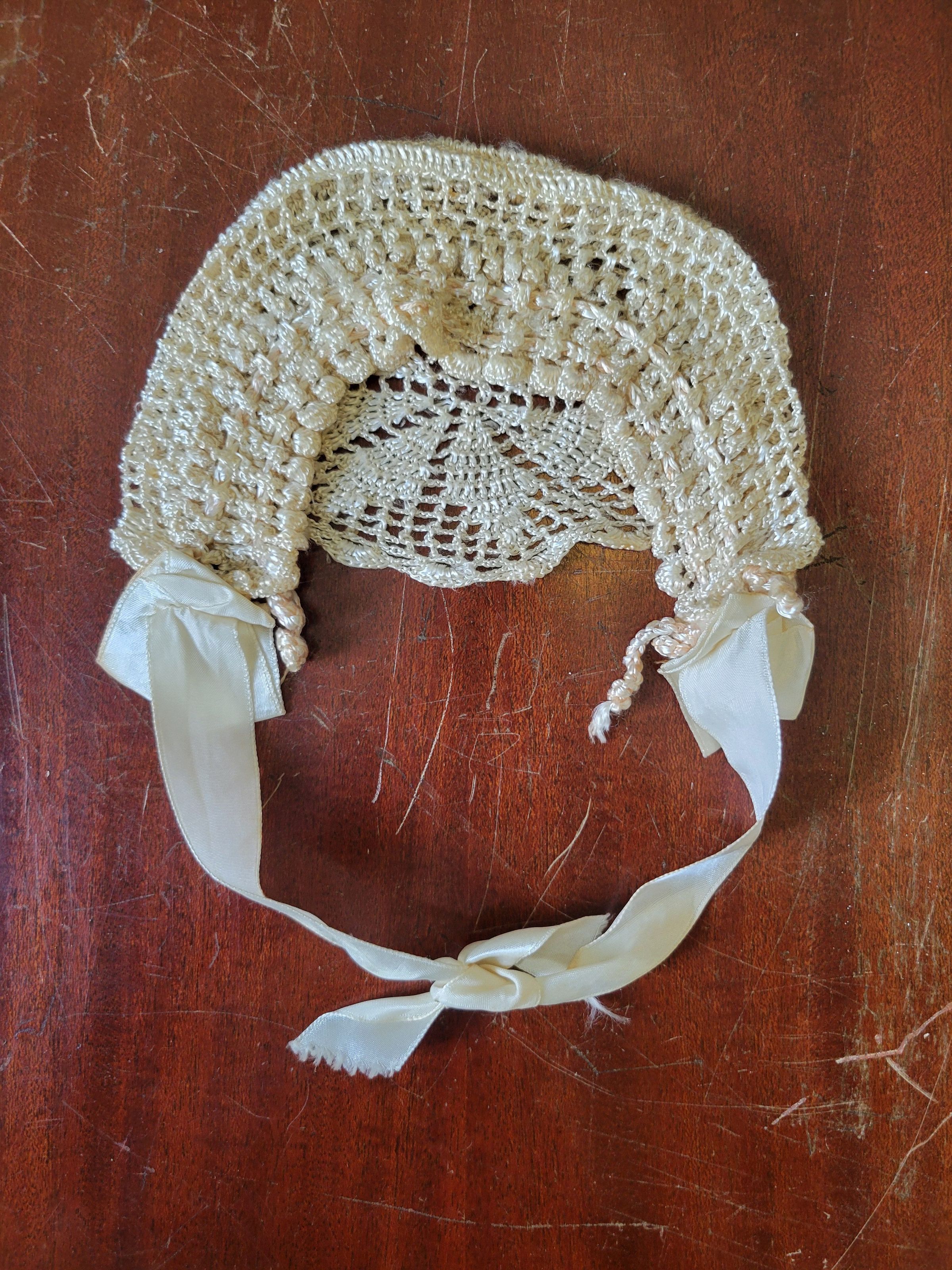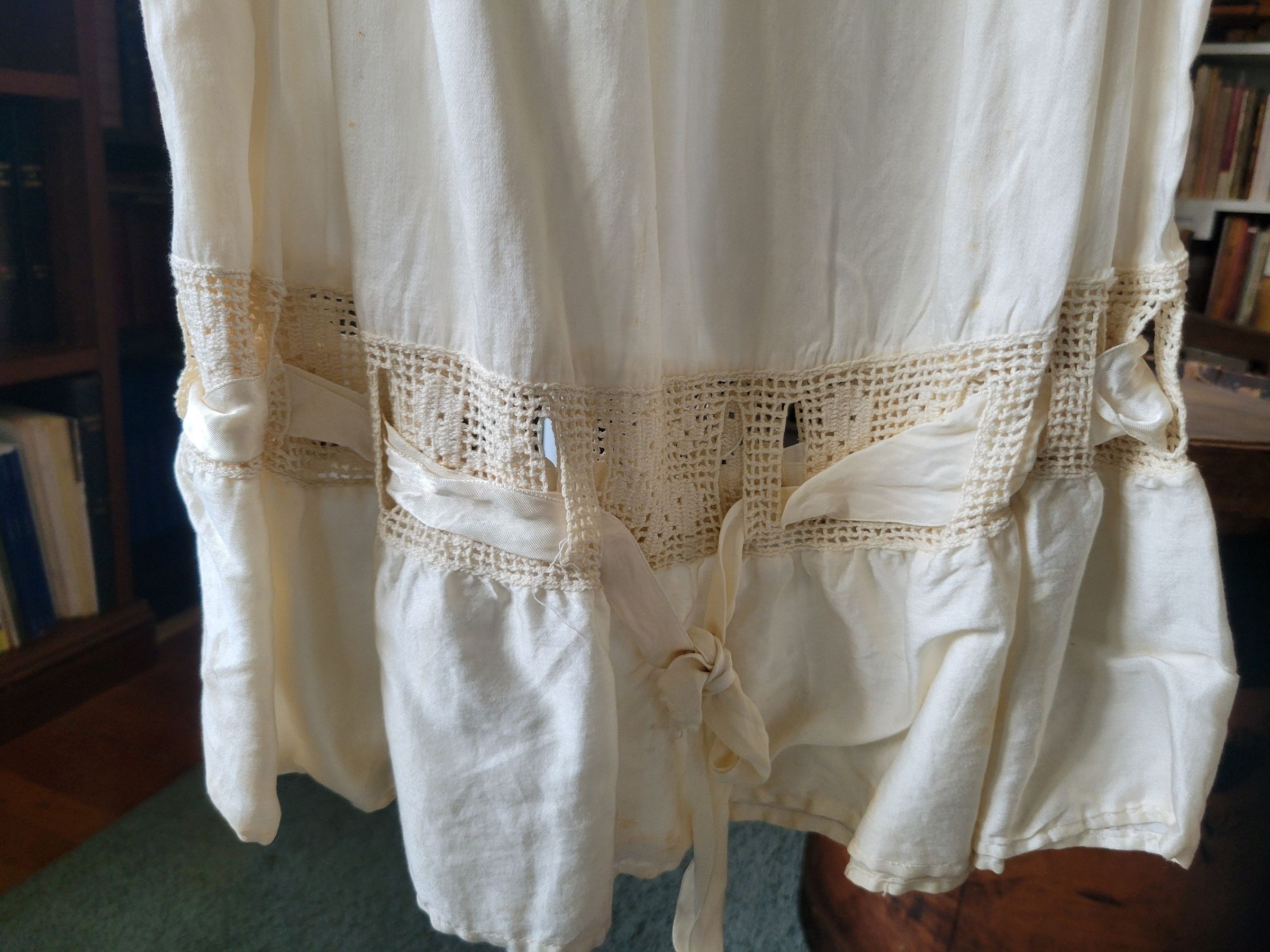Christening gown for Camilla Krzyzewski made by her godmother Katherine Gilmartin. The outfit includes a slip with a crocheted top, a dress which is sheer with polka dots and ribbons, and a coat embellished with crochet flowers. It also includes a crocheted cap. The entire outfit was originally white but has yellowed with age.
