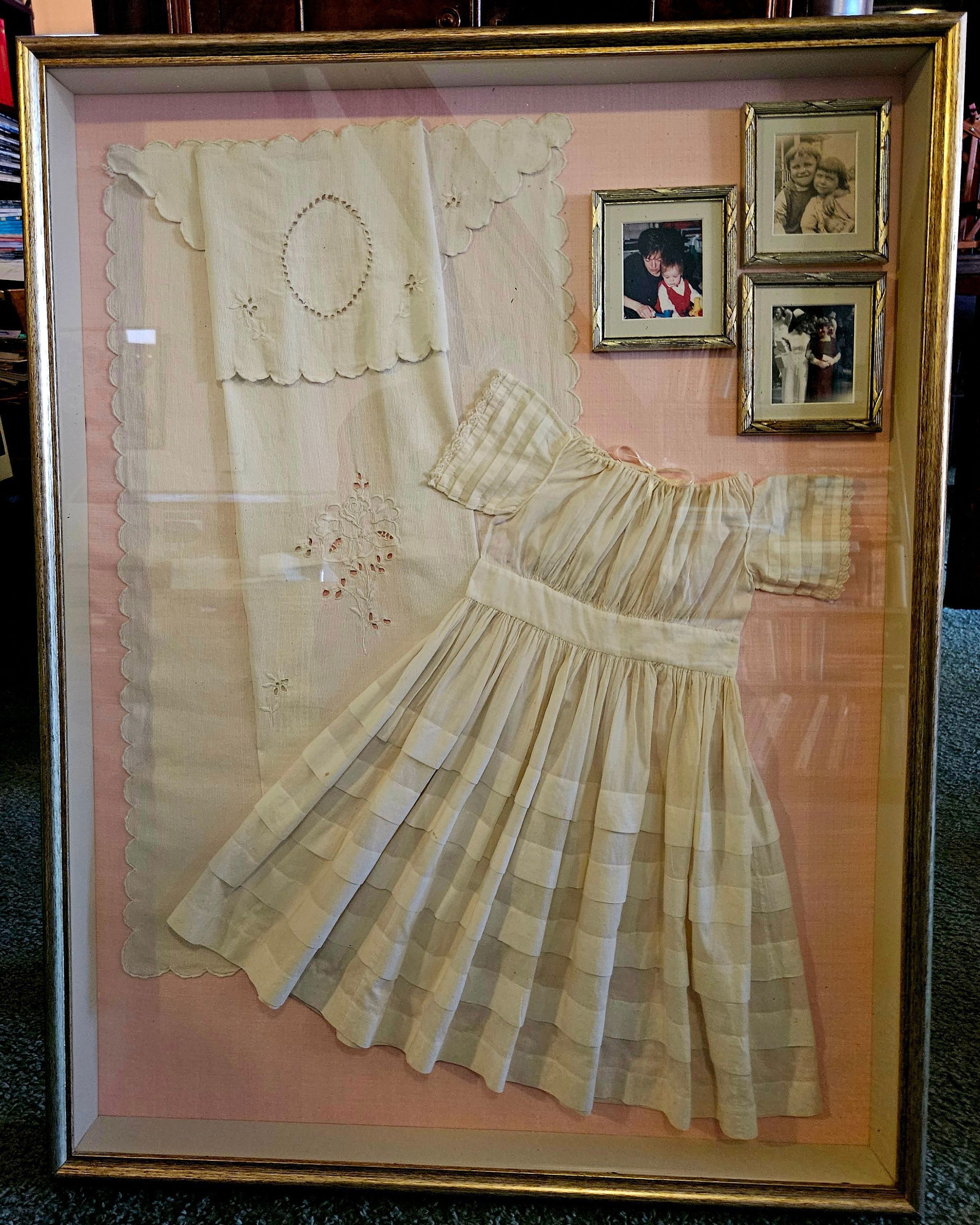 Shadowbox containing a christening gown, christening blanket, and family photos.Use