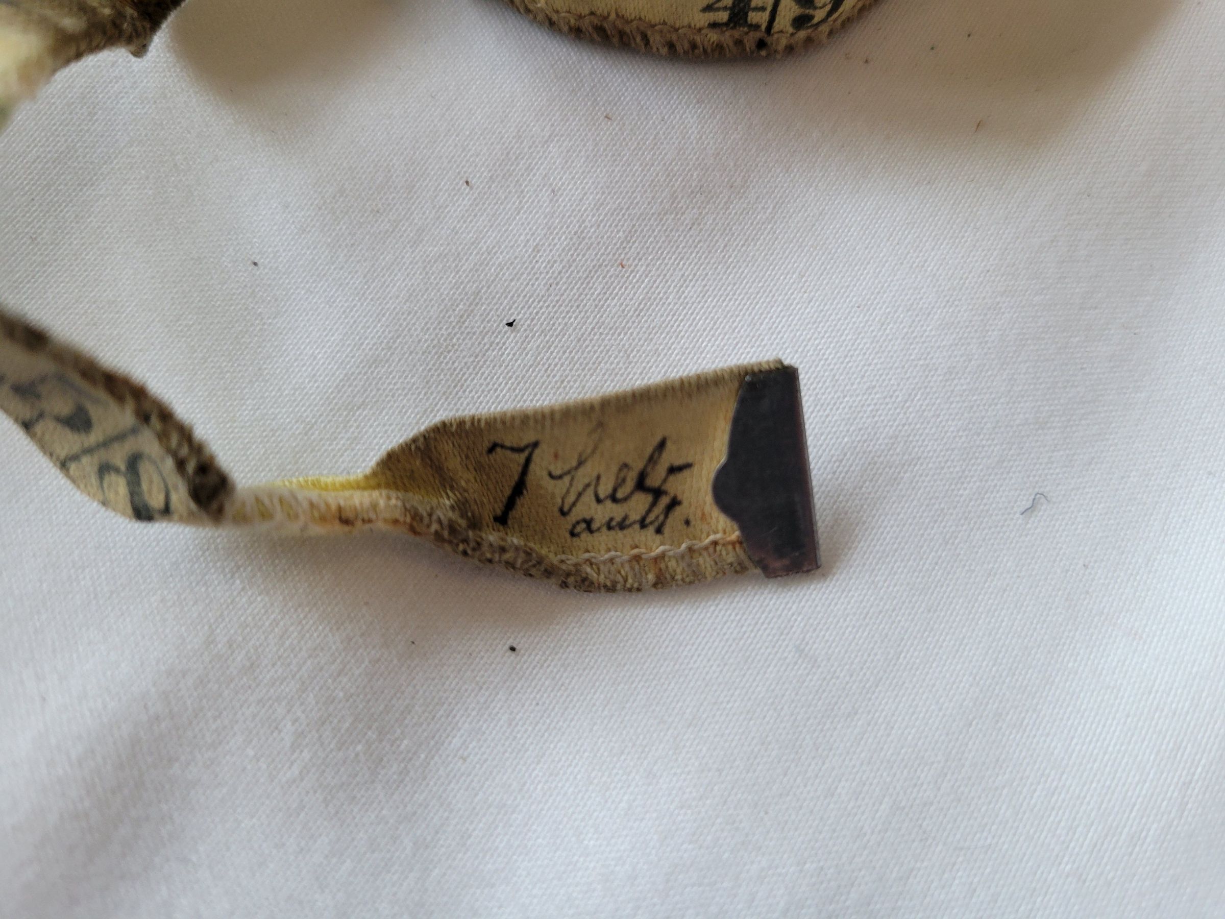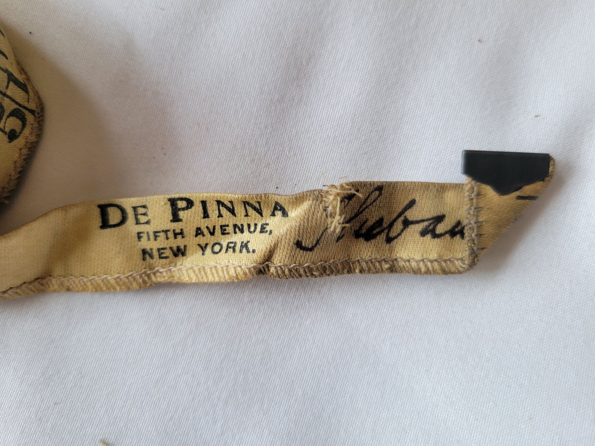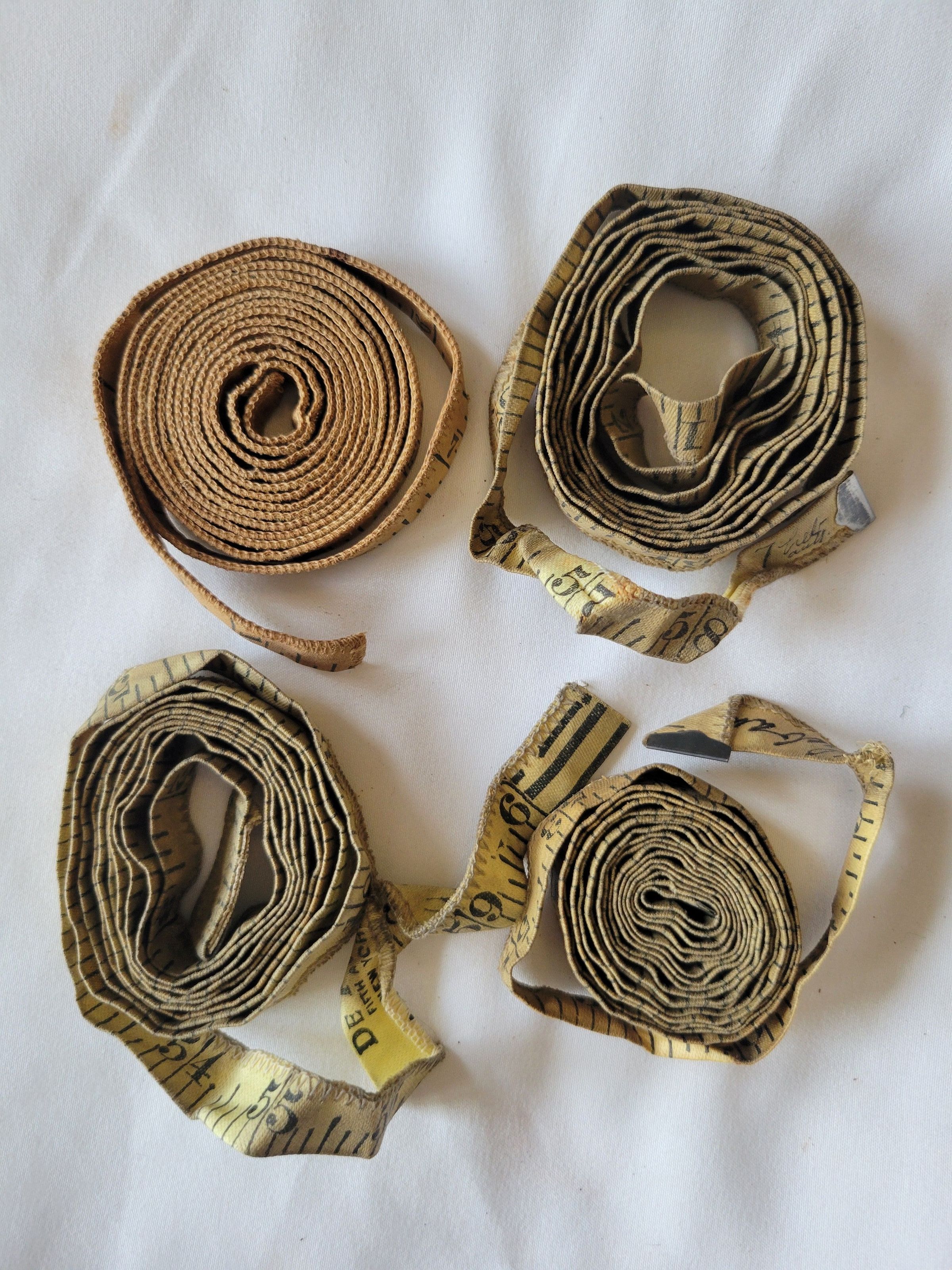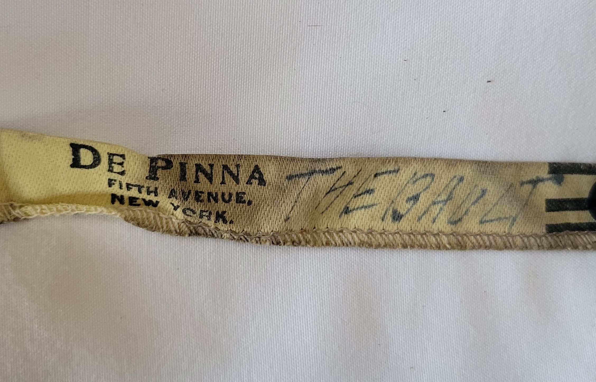 Four 60" cloth measuring tapes. Three are branded from De Pinna of Fifth Avenue, New York. Those same three are also marked in pen by hand, "Thebault" at the end. This refers to tailor Charles Thebault to whom they belonged. De Pinna was a chain of high end clothing stores for men and women from 1885 to 1969.Use