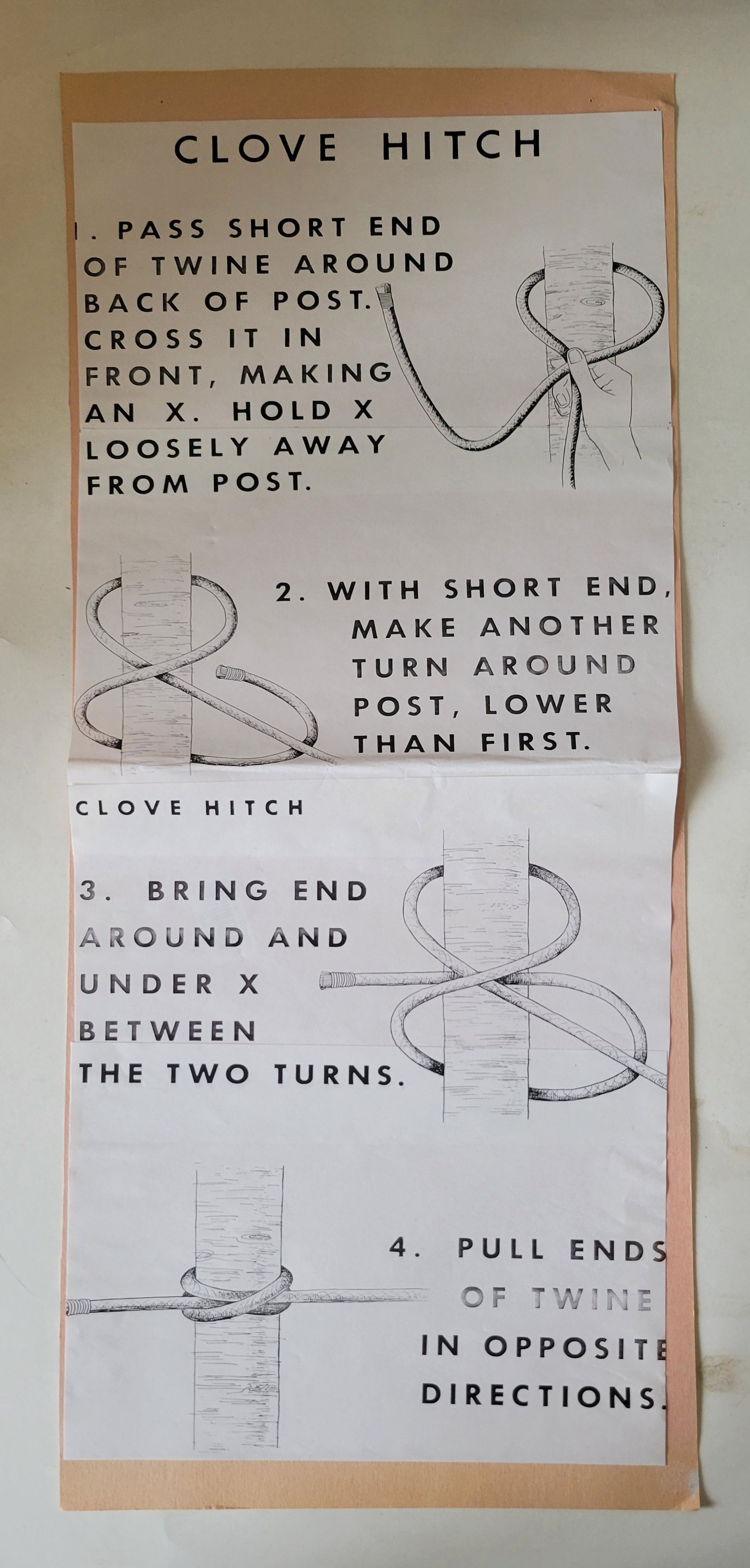 A poster of instructions for tying a clove hitch knot in four steps. It features both written and pictural instructions which are printed on four white pieces of paper which have been adhered to a slightly larger and irregular piece of posterboard. The poster has been folded across the middle but is otherwise in good condition.Collection