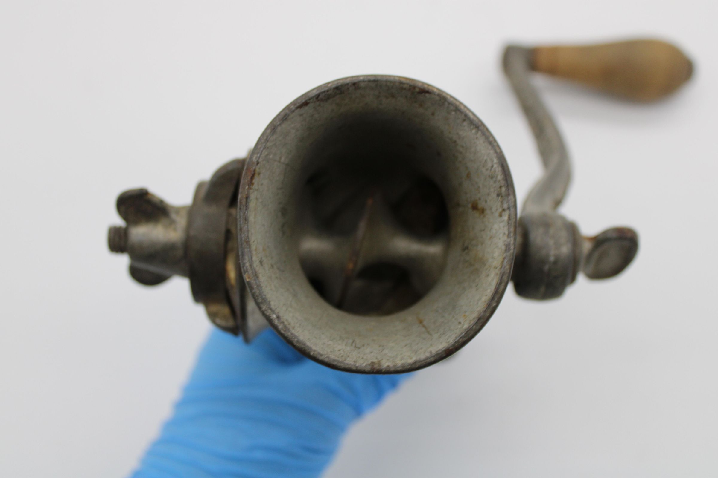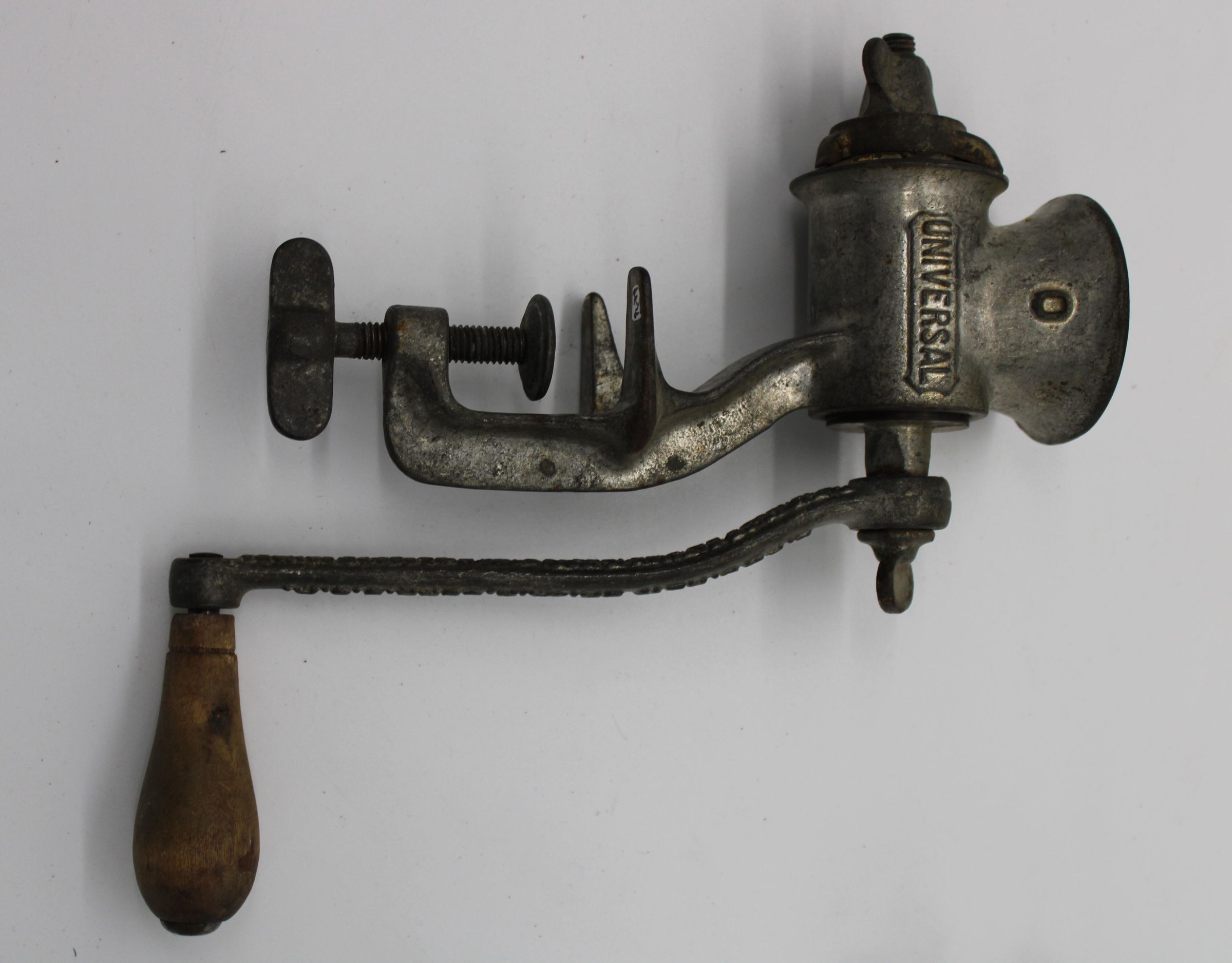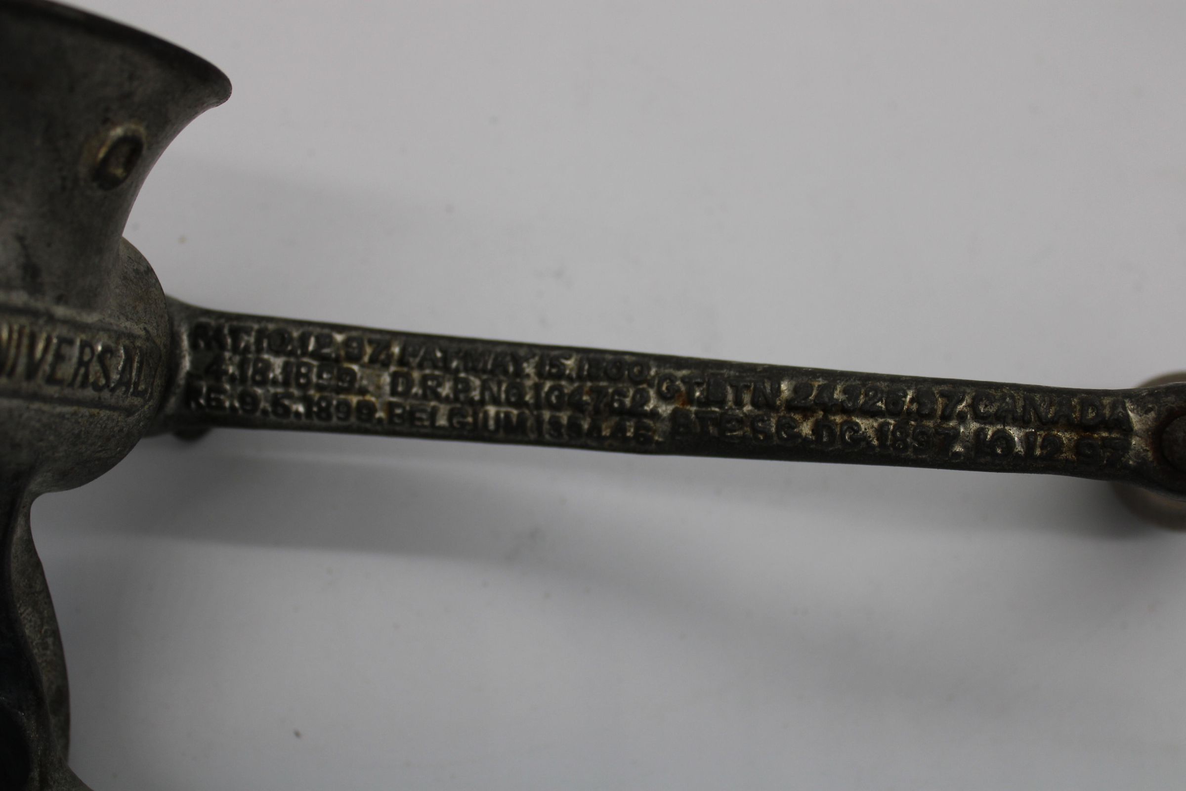 A Universal brand tabletop coffee grinder. The handle reads: "L.F.&C. NEW BRITAIN. CONN. U.S.A.". The other side lists patent numbers.Made/Created