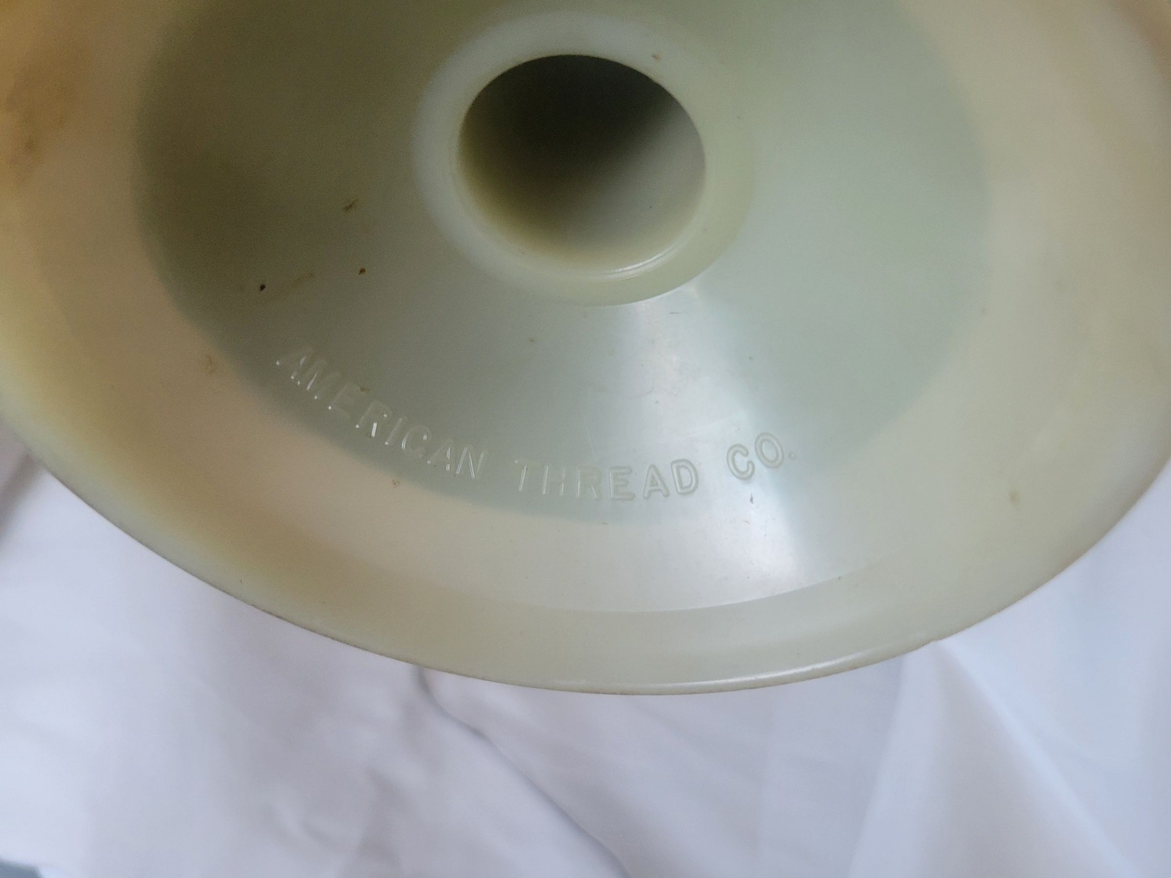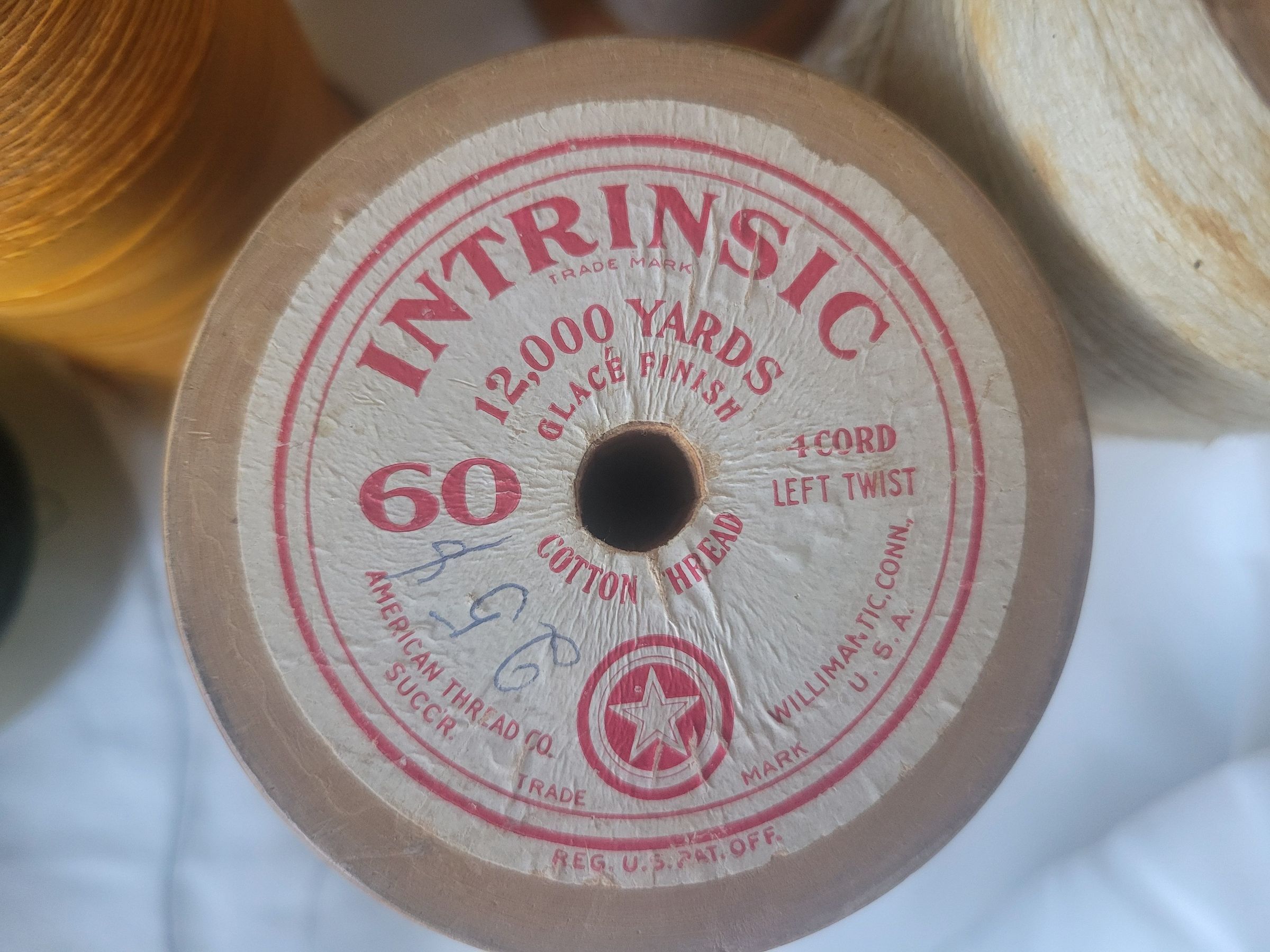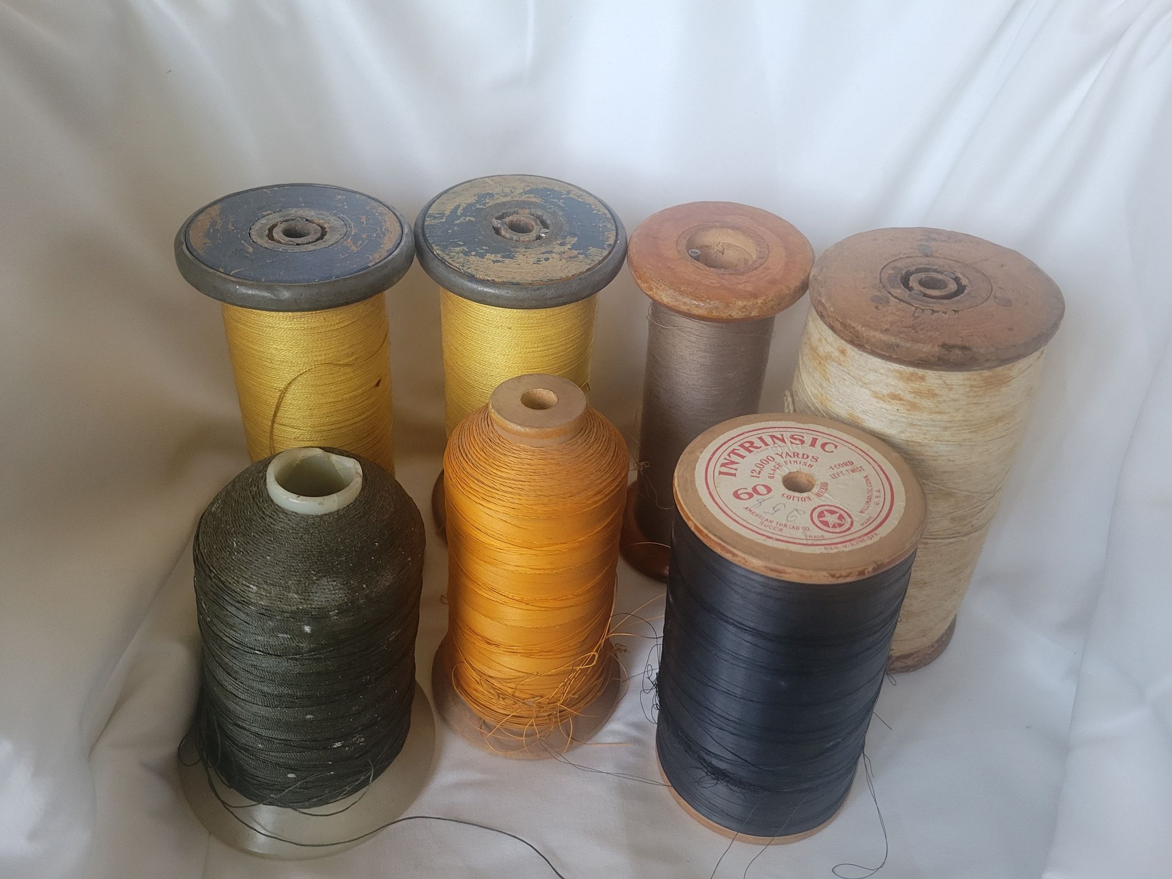 A collection of thread from the American Thread Company. All are coated cotton thread with the exception of the white which is uncoated. As a result it is heavily stained. The blue thread has a sticker on top that marks it as Intrinsic brand, 12,000 yards, glace finish. The green thread has the company name embossed on the underside of the spool. The blue and orange threads are somewhat tangled but the others are wrapped neatly. All spools are worn or broken to some degree.Collection