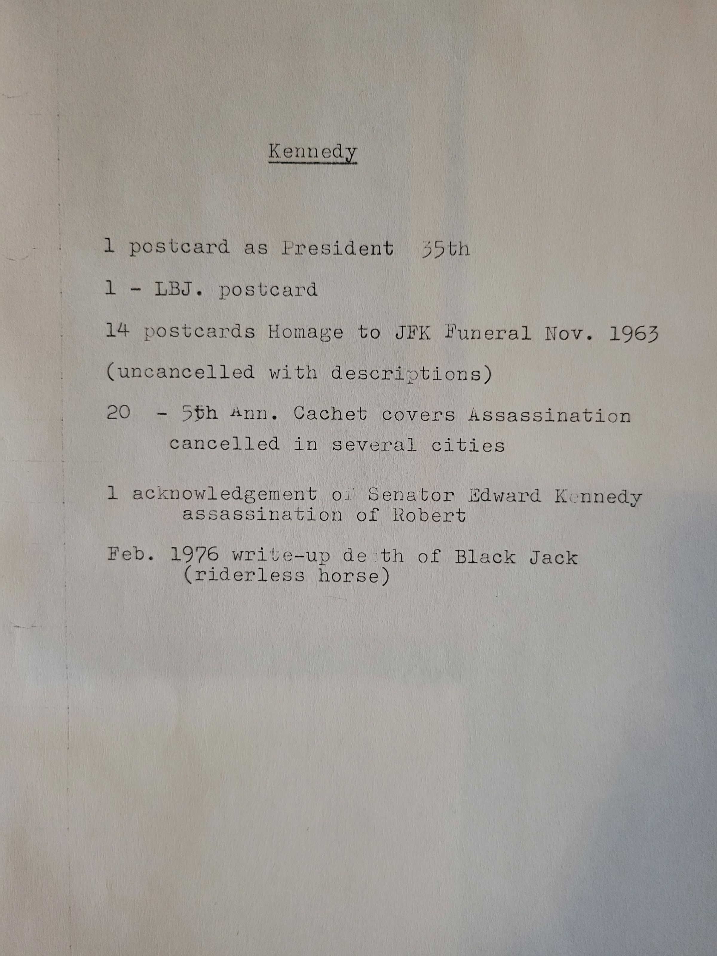 A collection of artifacts regarding President John F. Kennedy throughout his presidency and in his death. Consists of postcards, cachet covers, and more.Collection