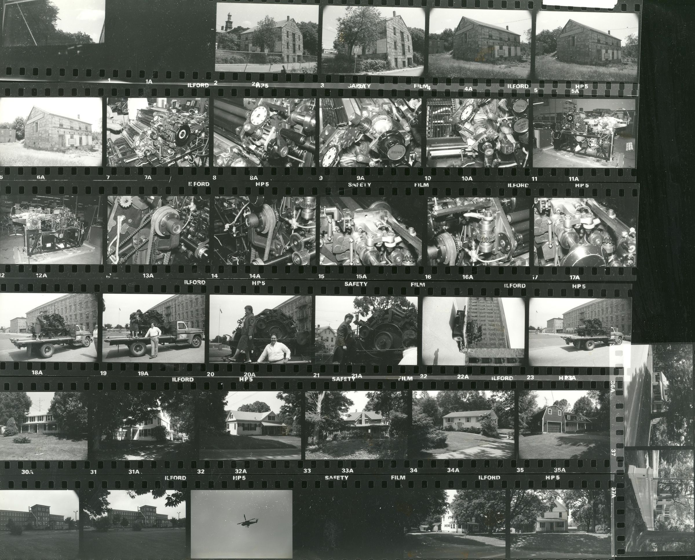 Contact sheet of 35 mm film with black and white photographs of Willimantic, CT. Images include the old stone warehouse near the corner of Main and Bridge Streets, the Mill Museum's carding machine being delivered (with Laura Knot Twine standing on the bed of the truck), Mill Number 1, and a suburban house. Probably made by or for the Mill Museum, 1987.Photograph Details